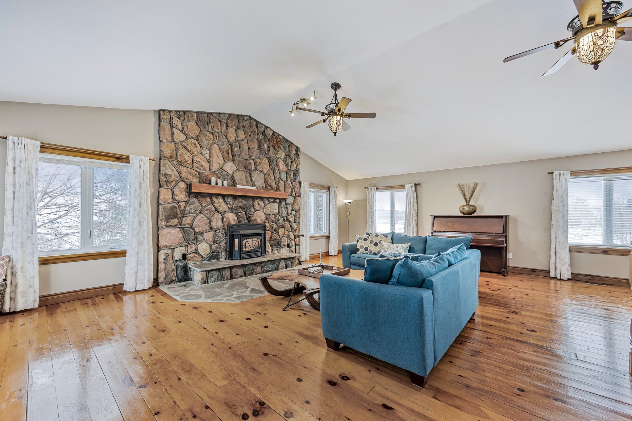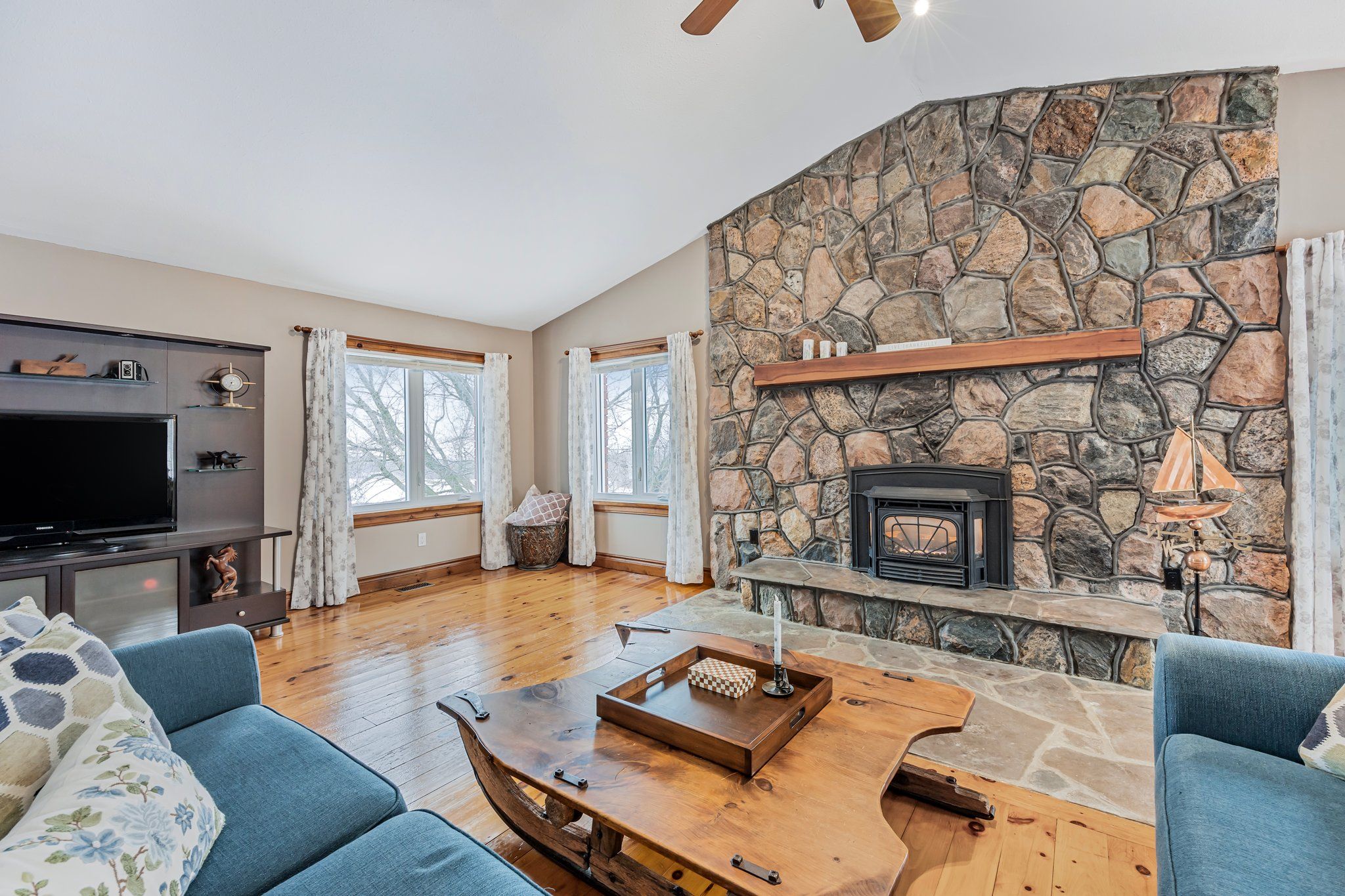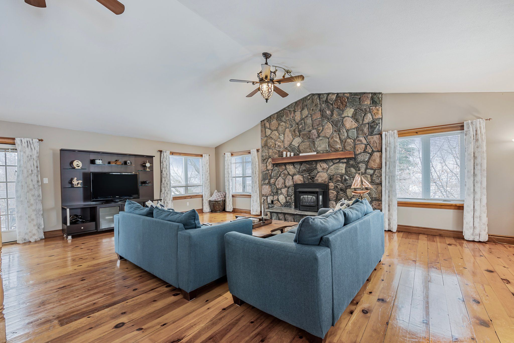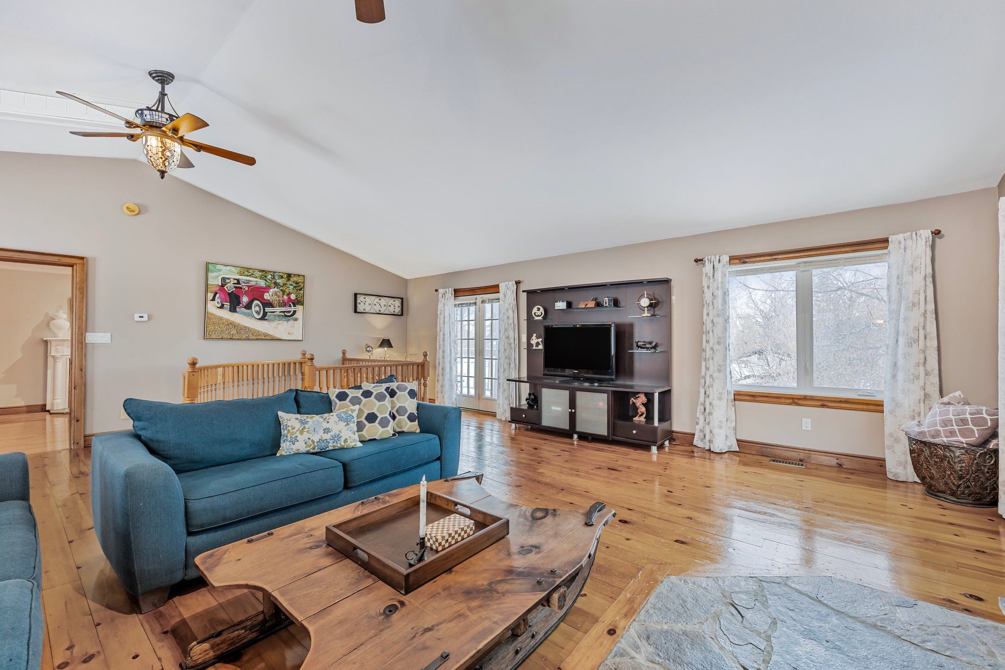 • Great room features cathedral ceilings, pine floors, and natural light throughout.
