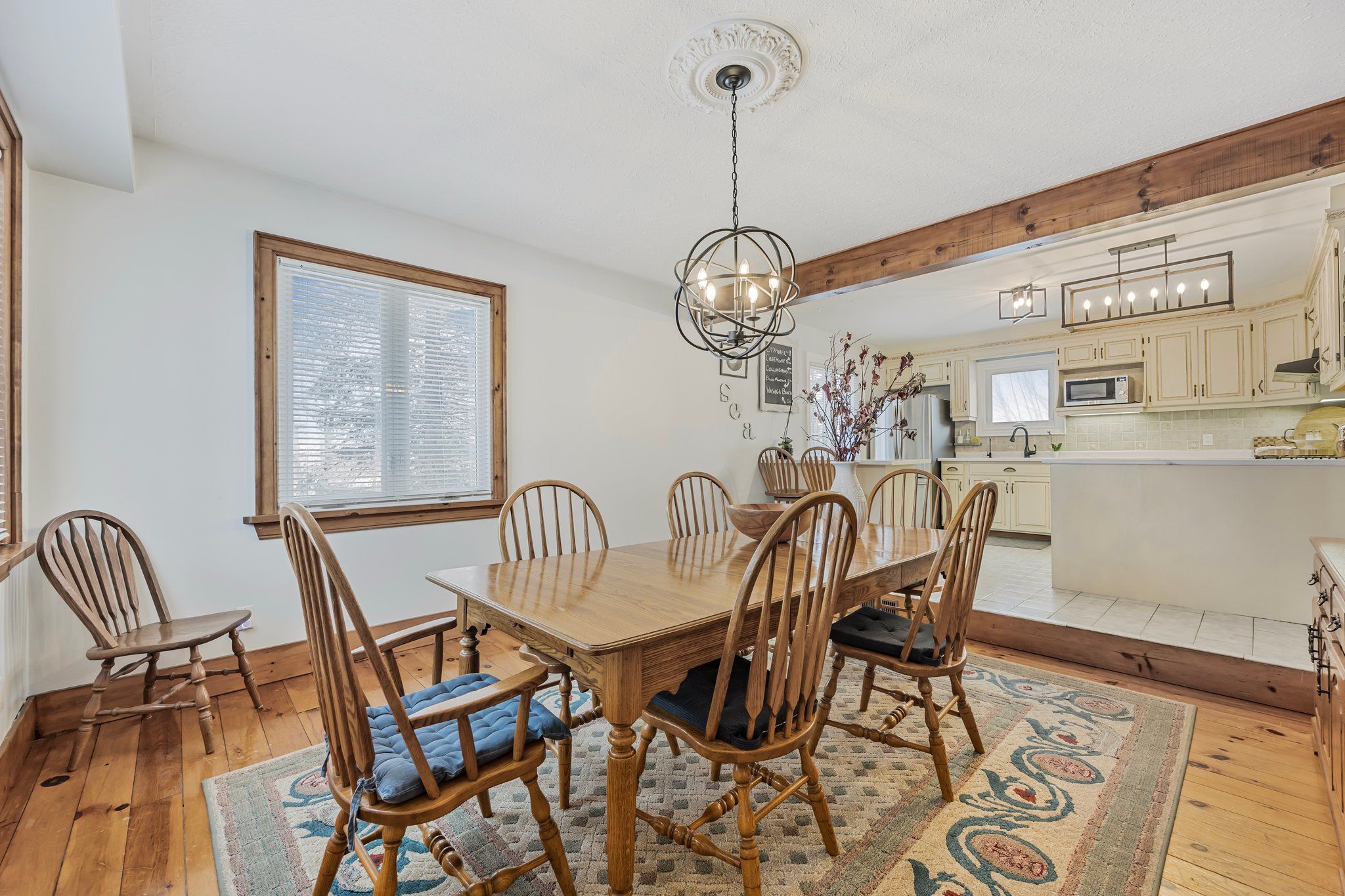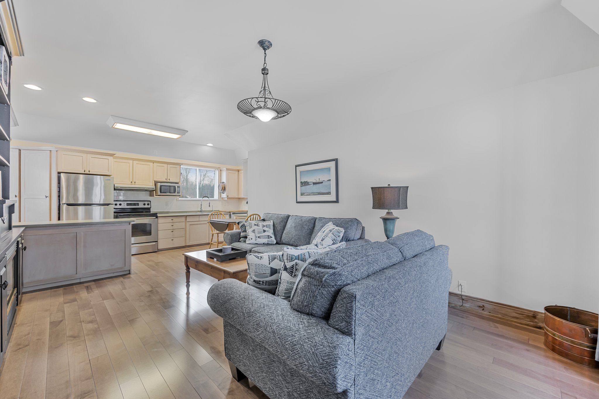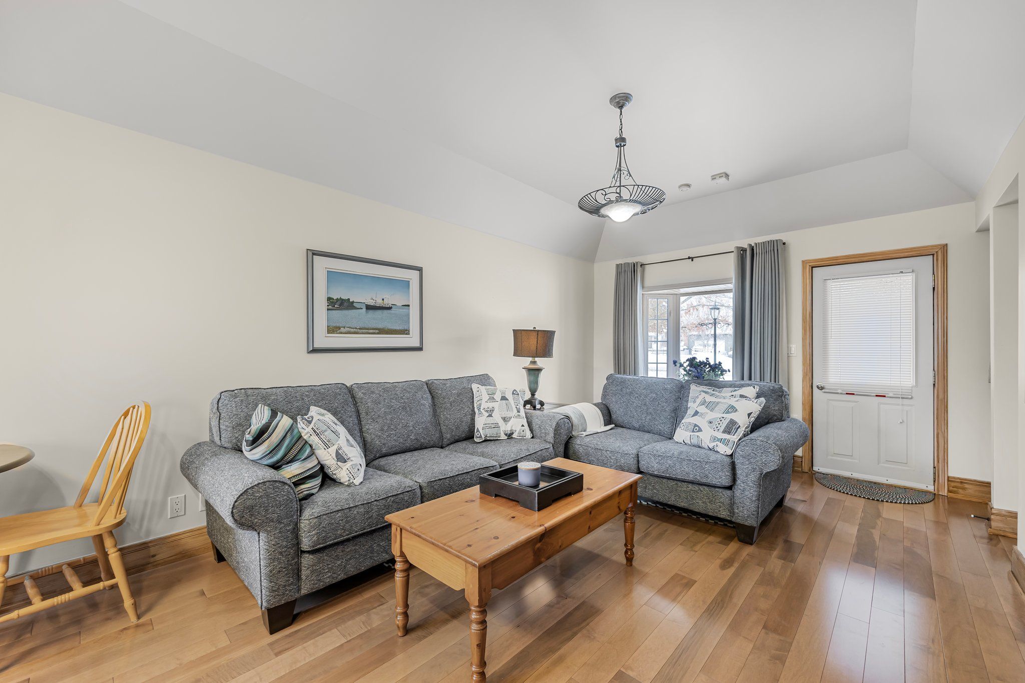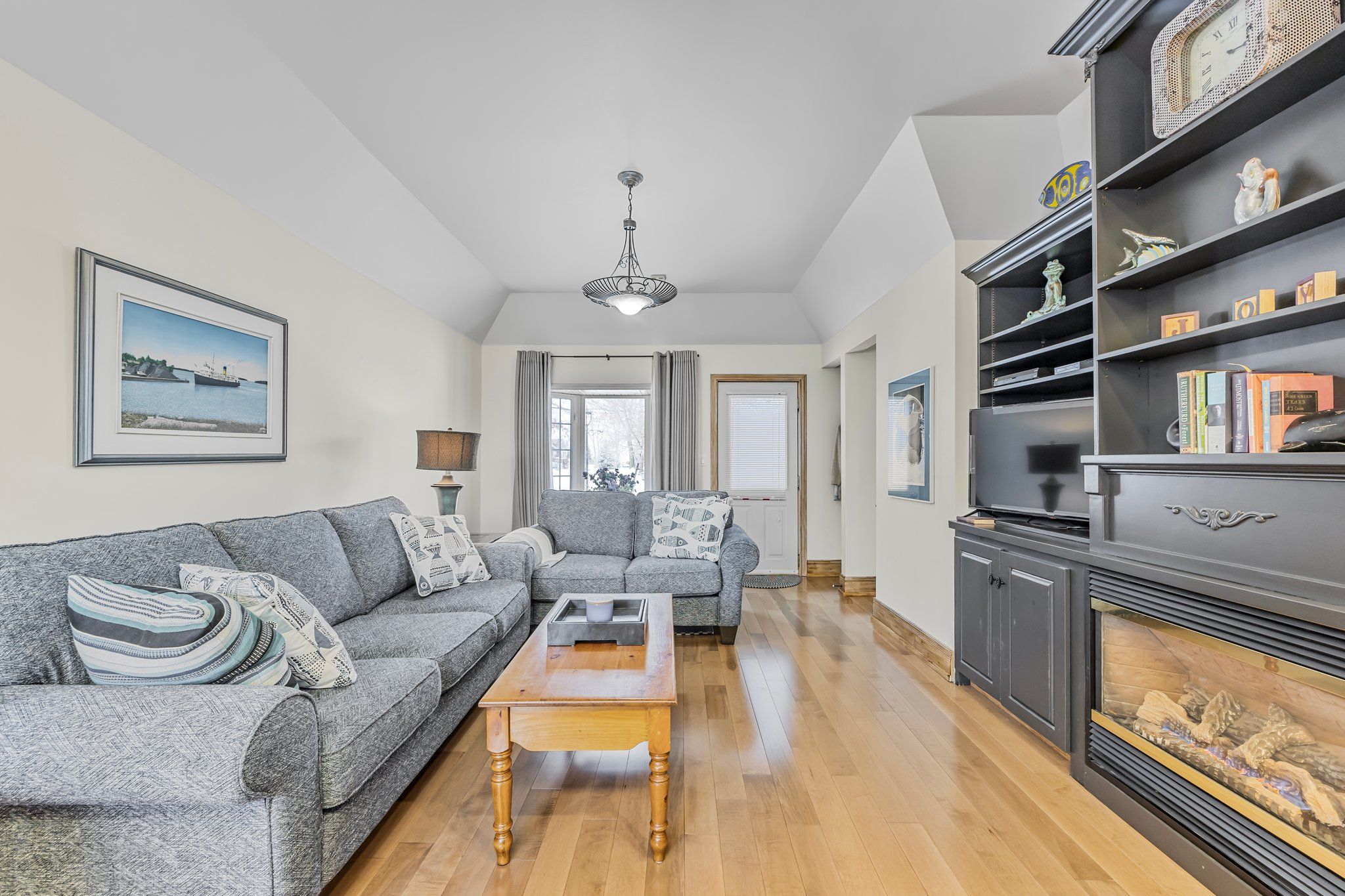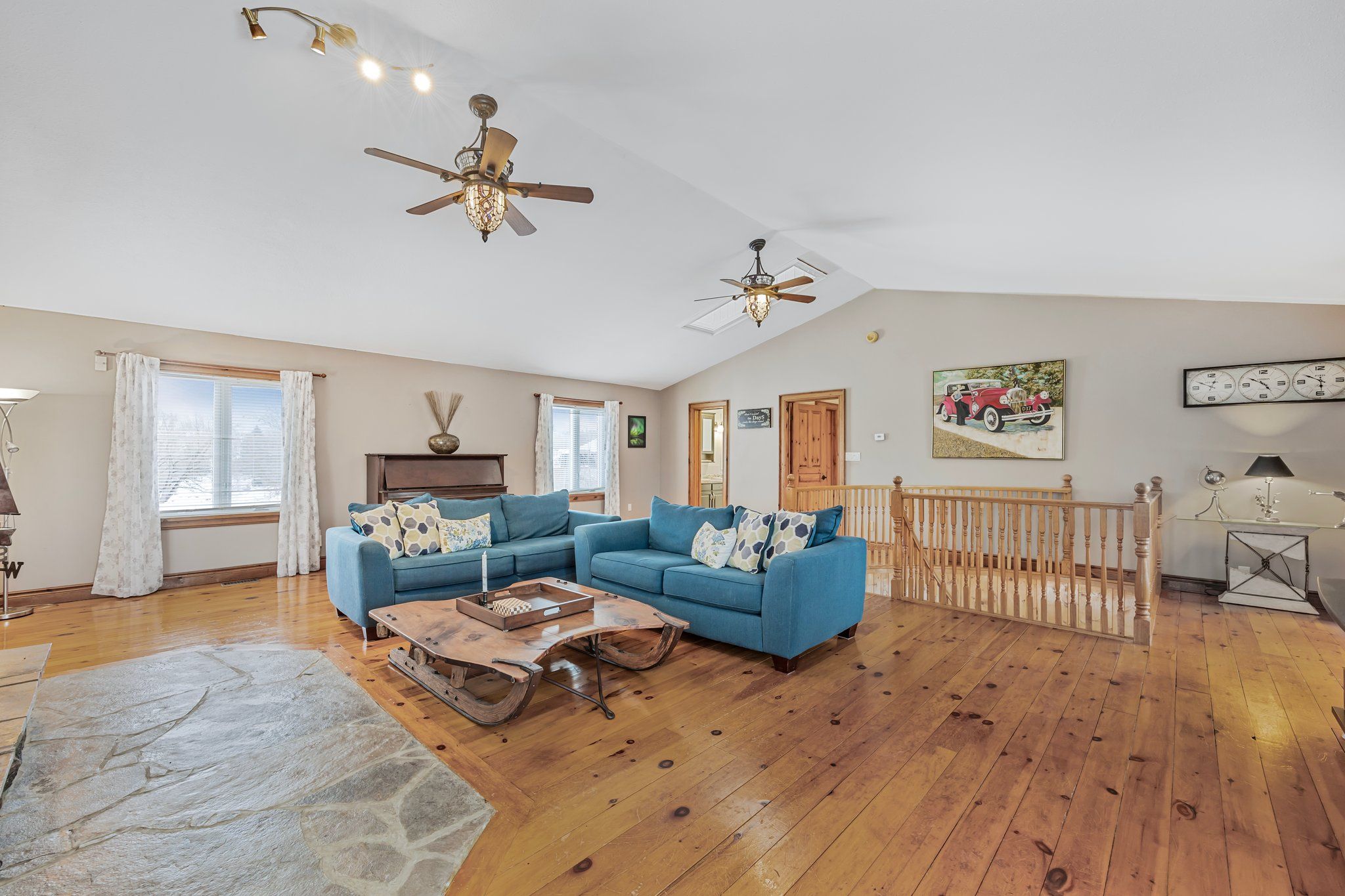 • Great room features cathedral ceilings, pine floors, and natural light throughout.