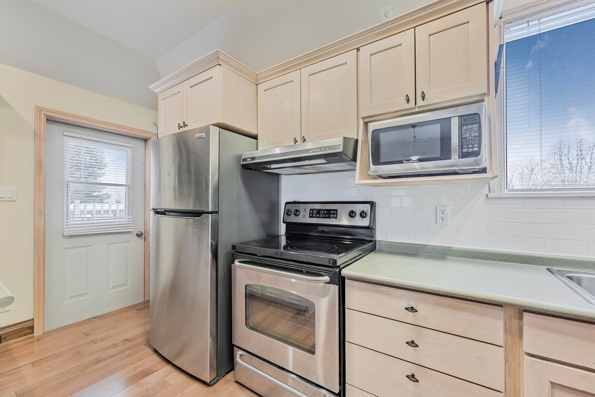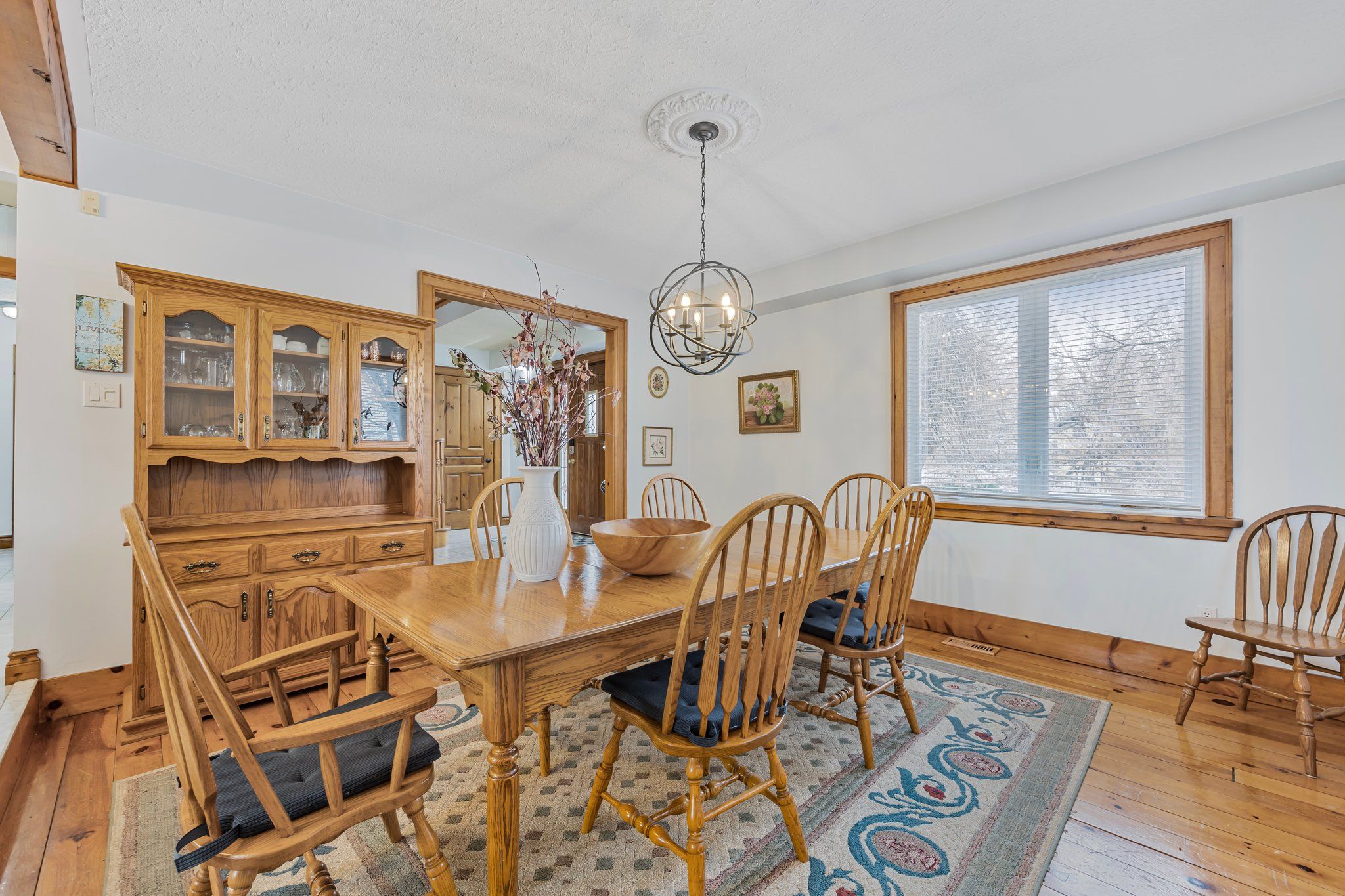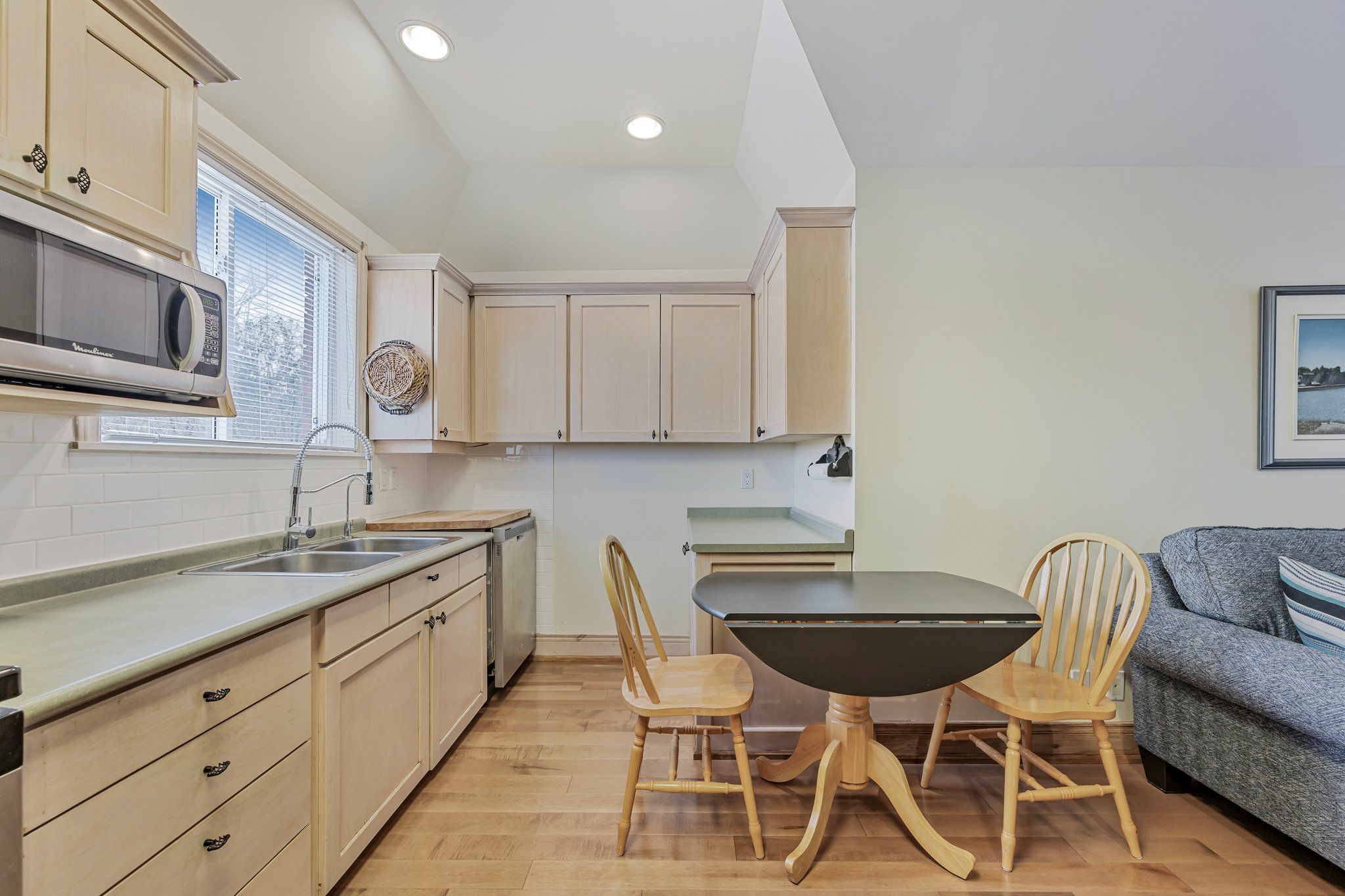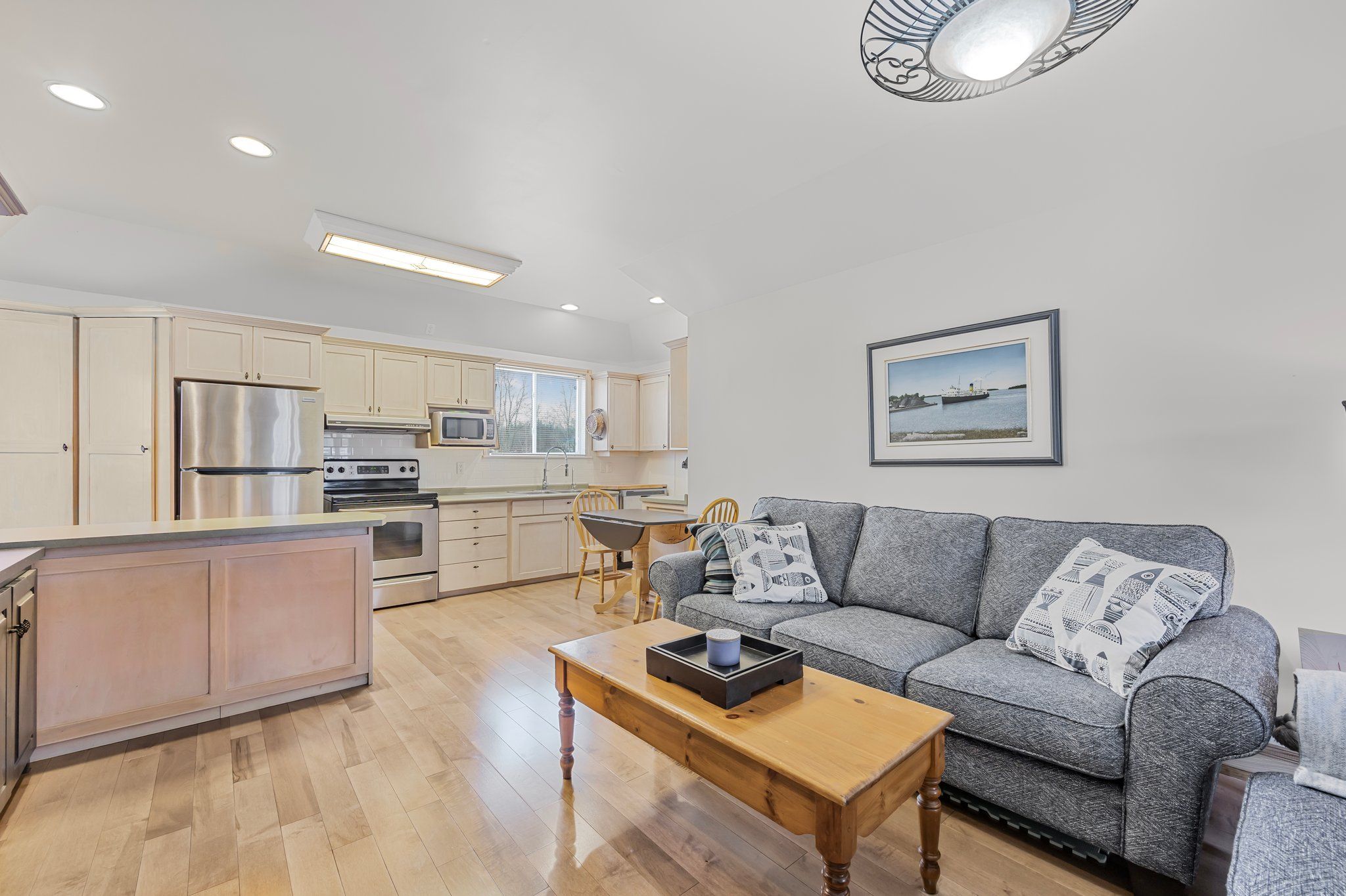• Great room features cathedral ceilings, pine floors, and natural light throughout.