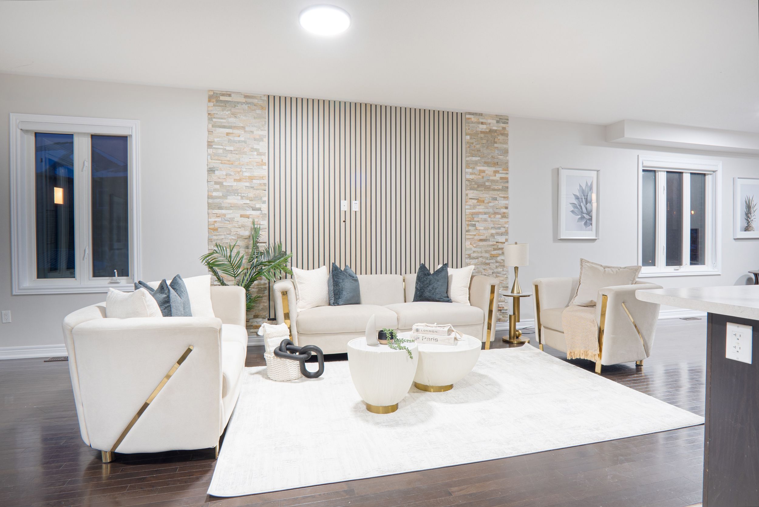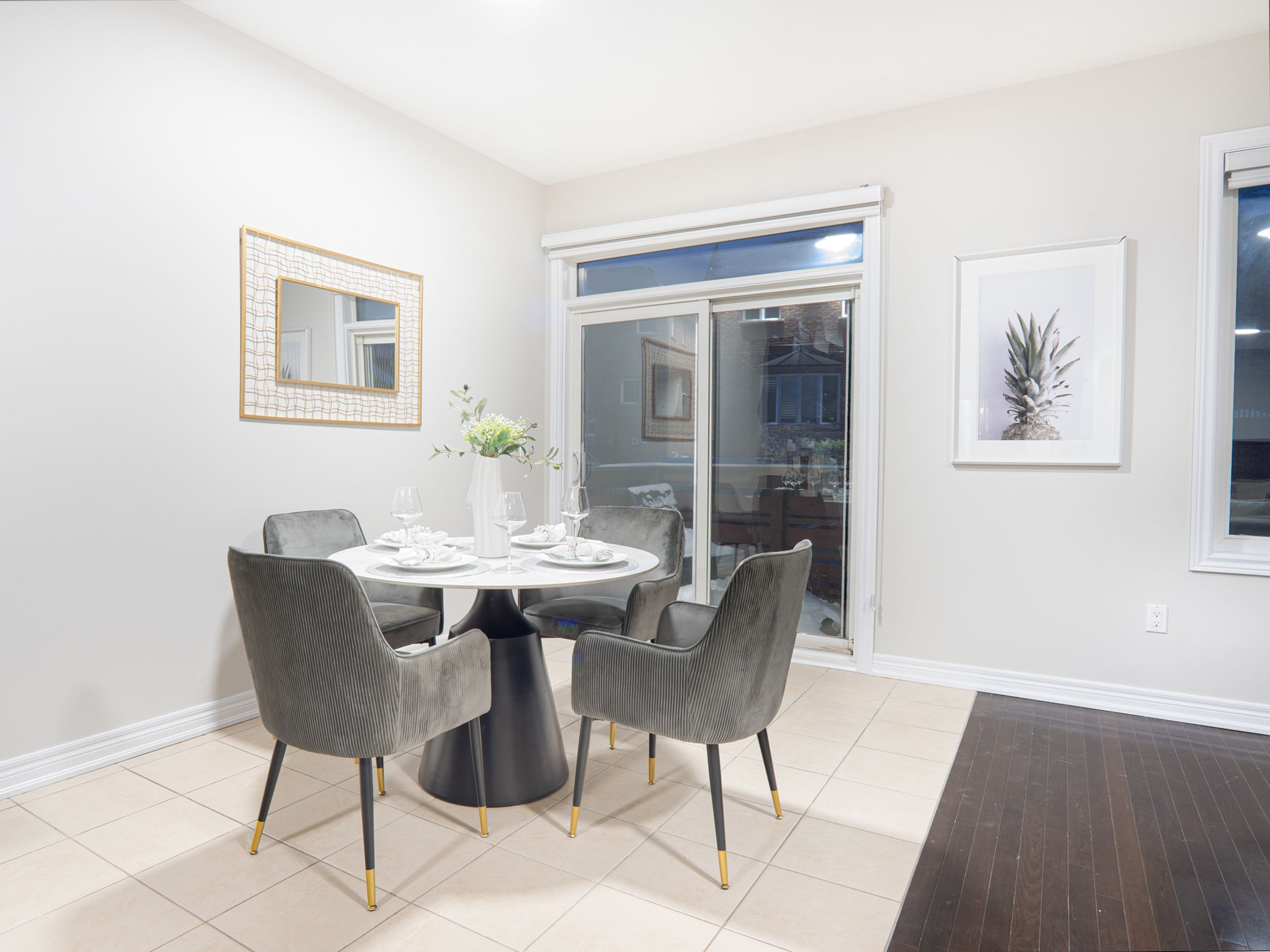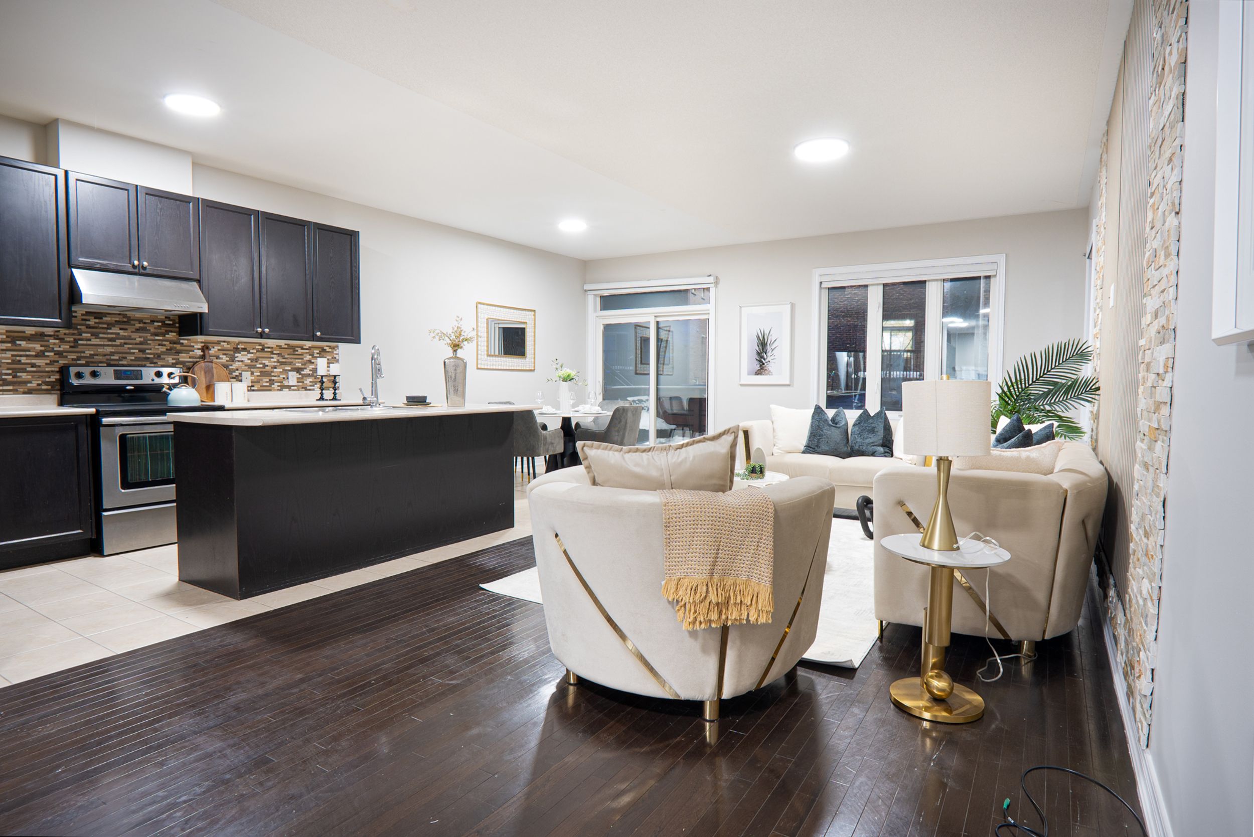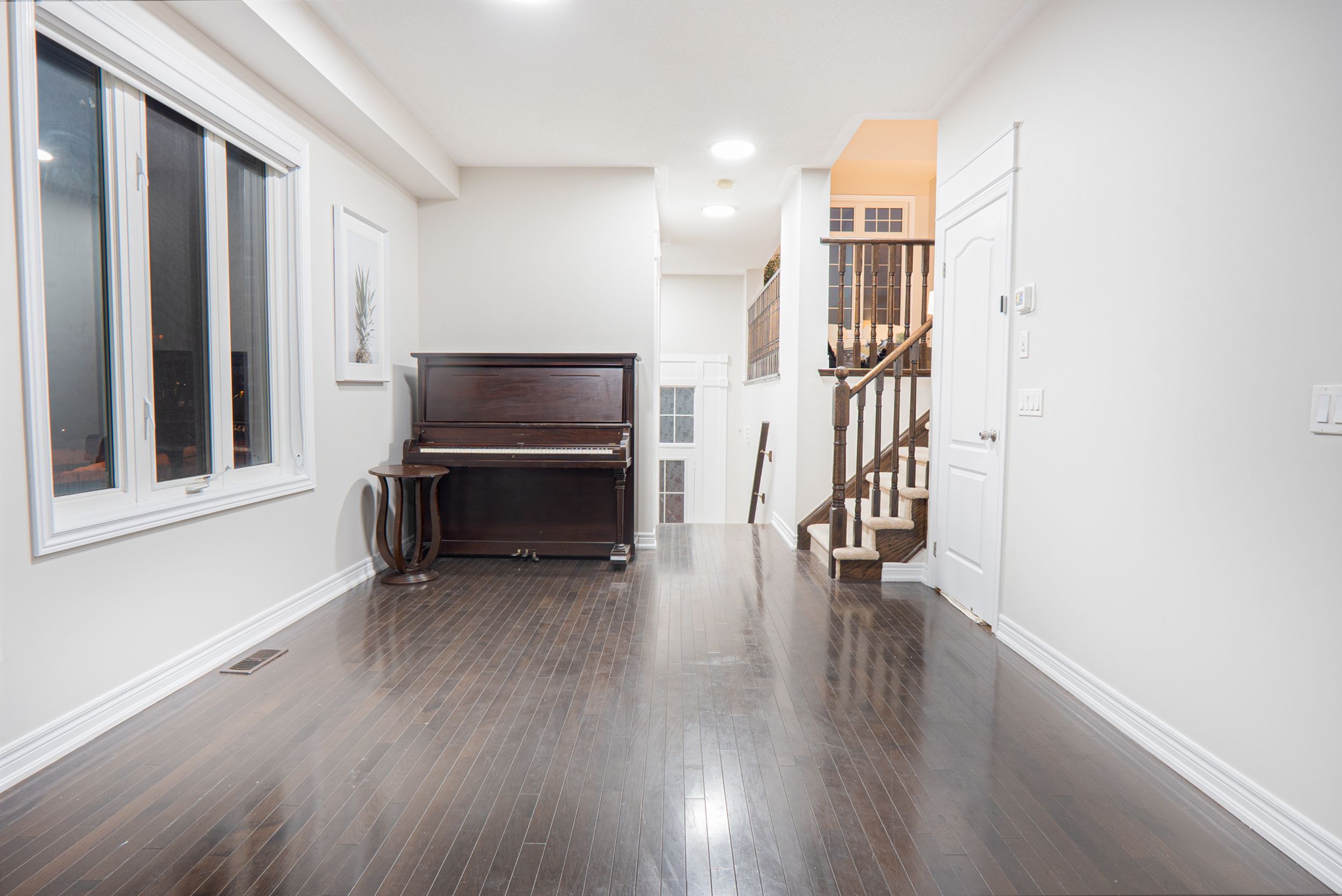 • Open concept living and dining area with elegant hardwood floors.