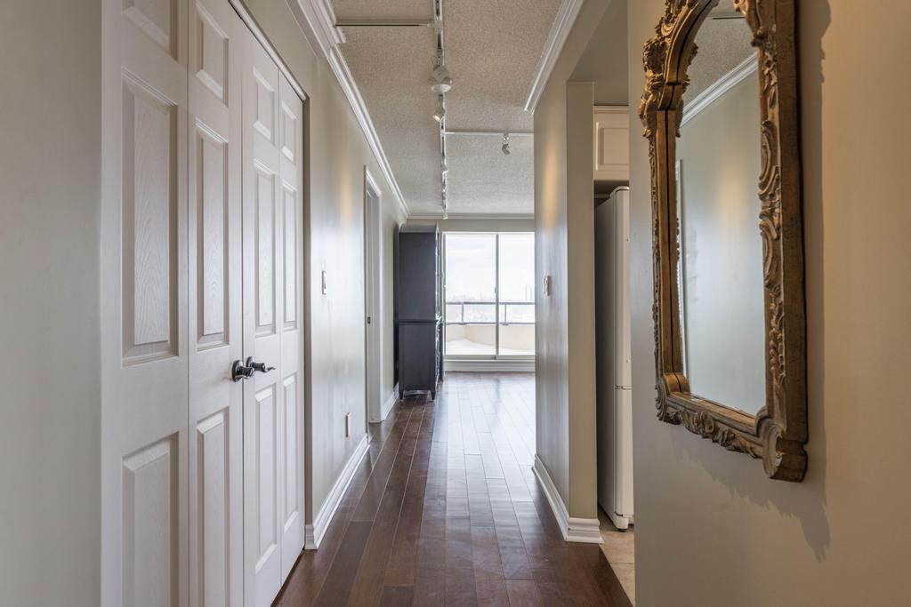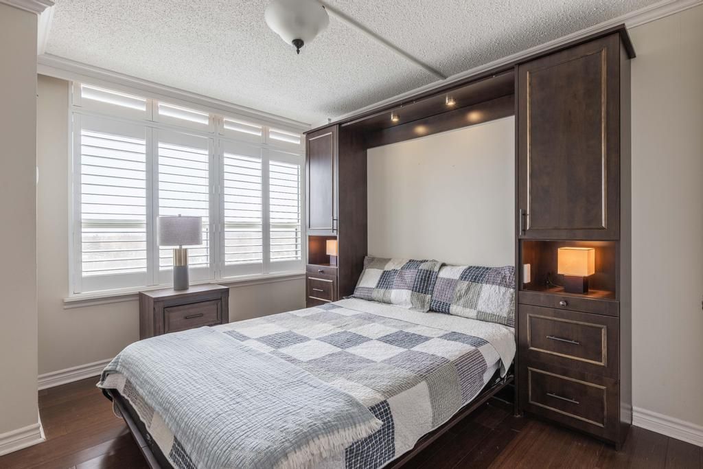 Situated on the 8th floor, this light filled 1,448 square foot corner suite condominum features 2 bedrooms, 2 full bathrooms, and an oversized private balcony off of the great room providing spectacular north-easterly views overlooking the city of st. Catharines and burgoyne woods. The desirable southgate building boasts luxury amenities like an indoor heated pool, spa, sauna, exercise room, party room, billiards room, hobby room and 2 separate outdoor barbecue areas with patios. Upon entering the foyer of suite 804, you'll find a tasteful layout full of natural light, rich hardwood running throughout with ceramic tile in both bathrooms and the kitchen. First, an in-suite laundry room off of the foyer leads to a second bedroom featuring a custom-built murphy bed and cabinetry, with a 4pc bathroom close by, making this area completely separate from the rest of the suite perfect for use as a guest room or office. The spacious kitchen with a separate dinette opens to a light-filled living / dining area through elegant glass french doors, ideal for entertaining. This area also includes a cozy separate tv or reading nook as well. The primary suite includes a large walk-in closet and an 4pc ensuite bathroom with a separate shower and jetted spa soaker tub. Lovely california shutters throughout, this unit also proudly boasts 2 indoor parking spaces and 2 separate storage lockers. South gate, a pet-free building, is conveniently close to the pen centre, grocery stores, pharmacies, restaurants, the meridian centre, performing arts centre, and everything else that downtown st. Catharines has to offer.