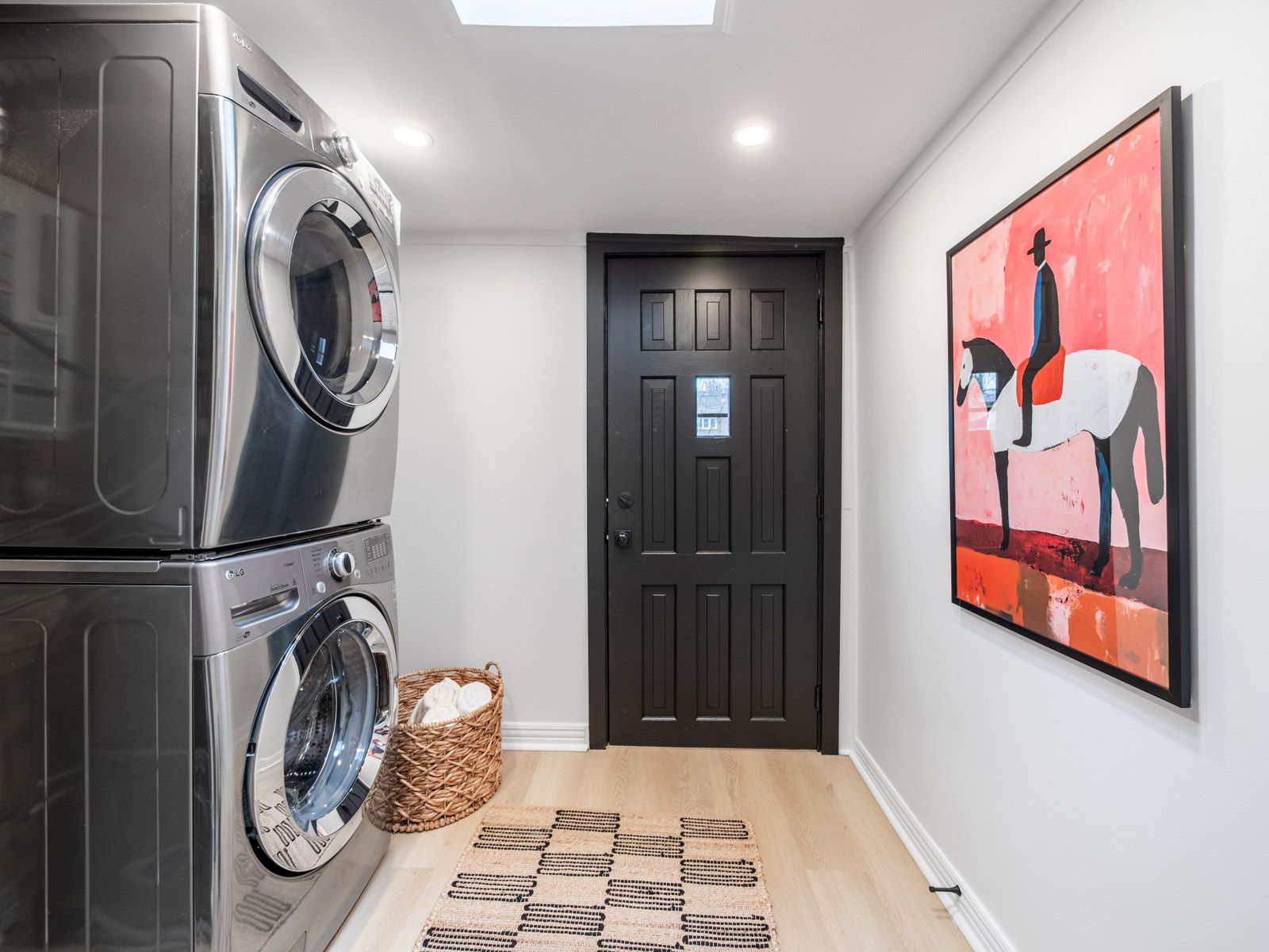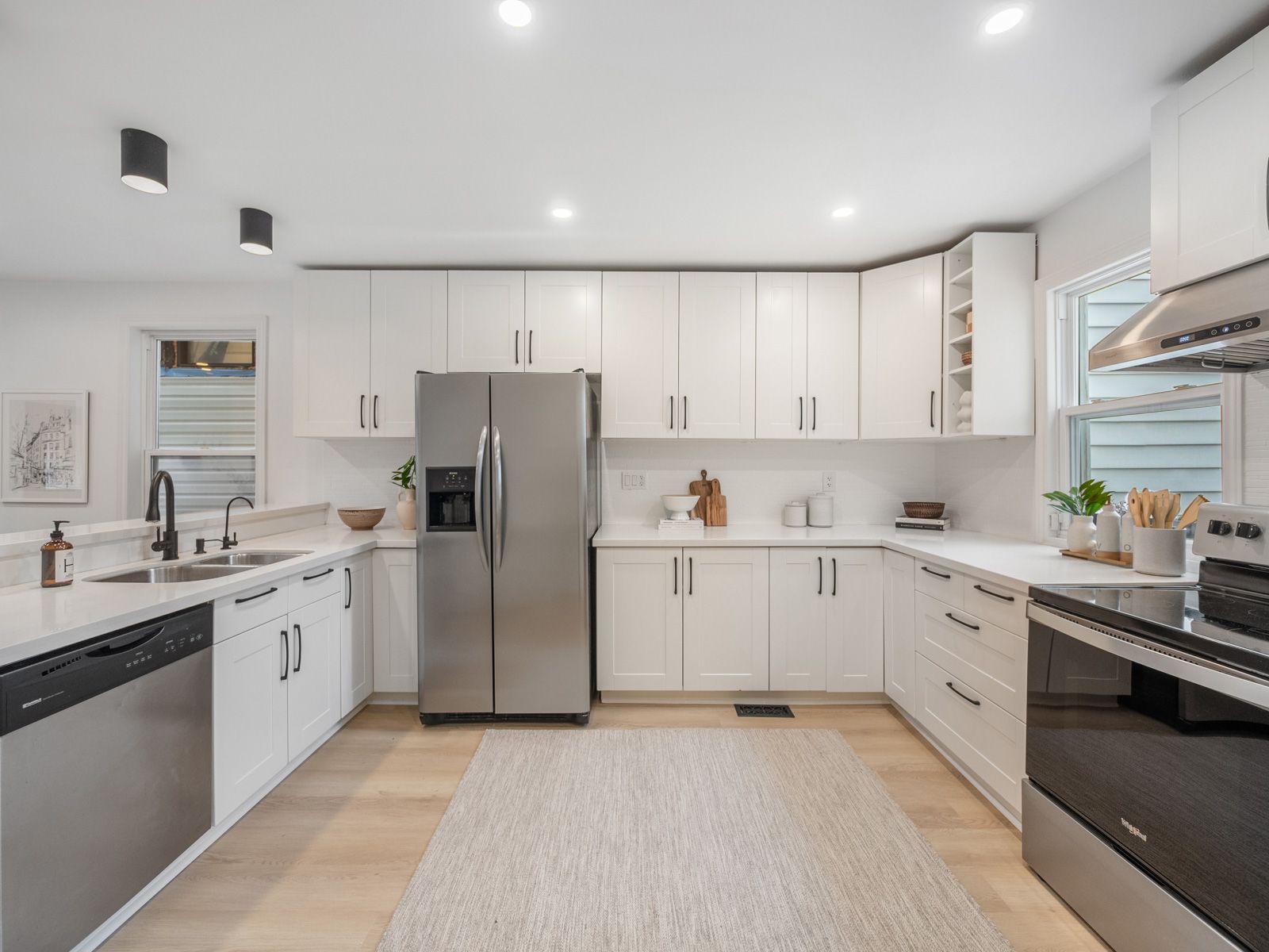 • Modern kitchen features custom cabinetry, stainless steel appliances, and quartz countertops.