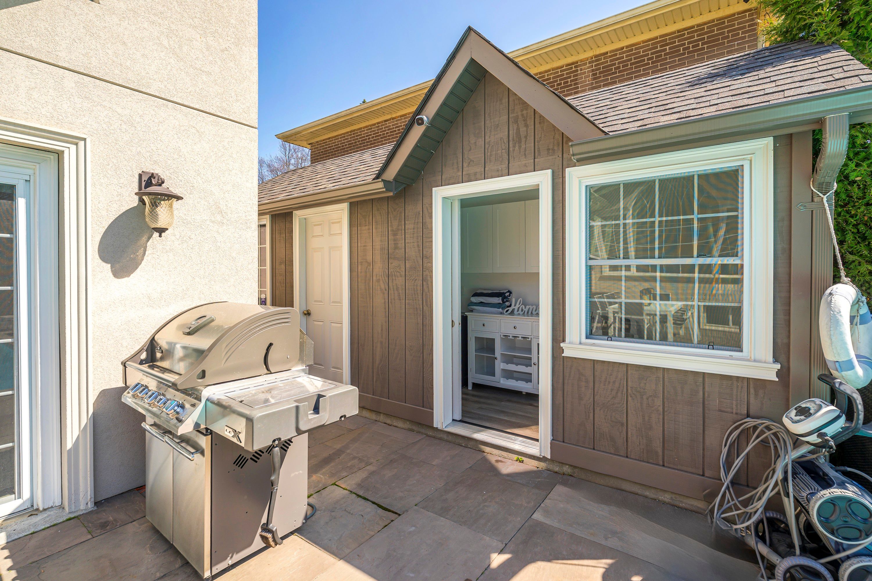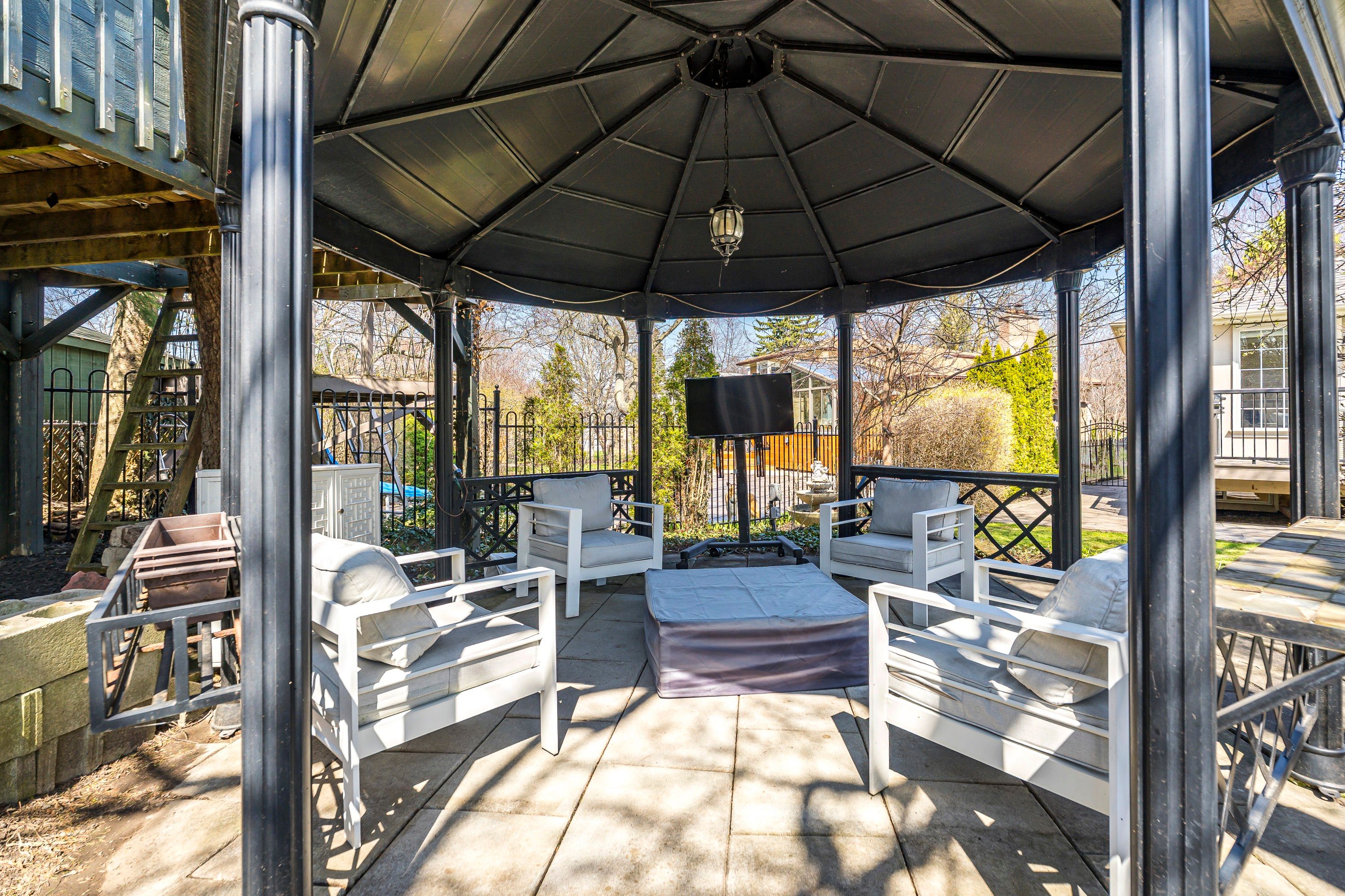 • Private backyard retreat featuring a pool, gazebo, and stone patio.