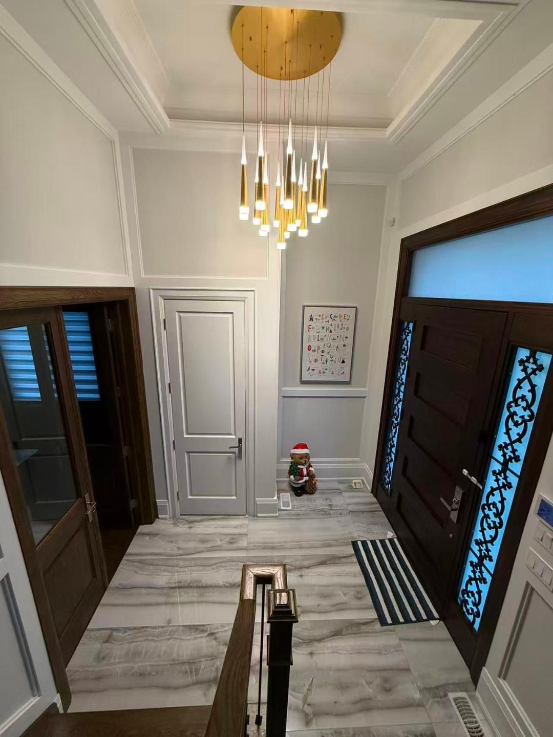 • Multiple fireplaces and high ceilings enhance warmth and sophistication.