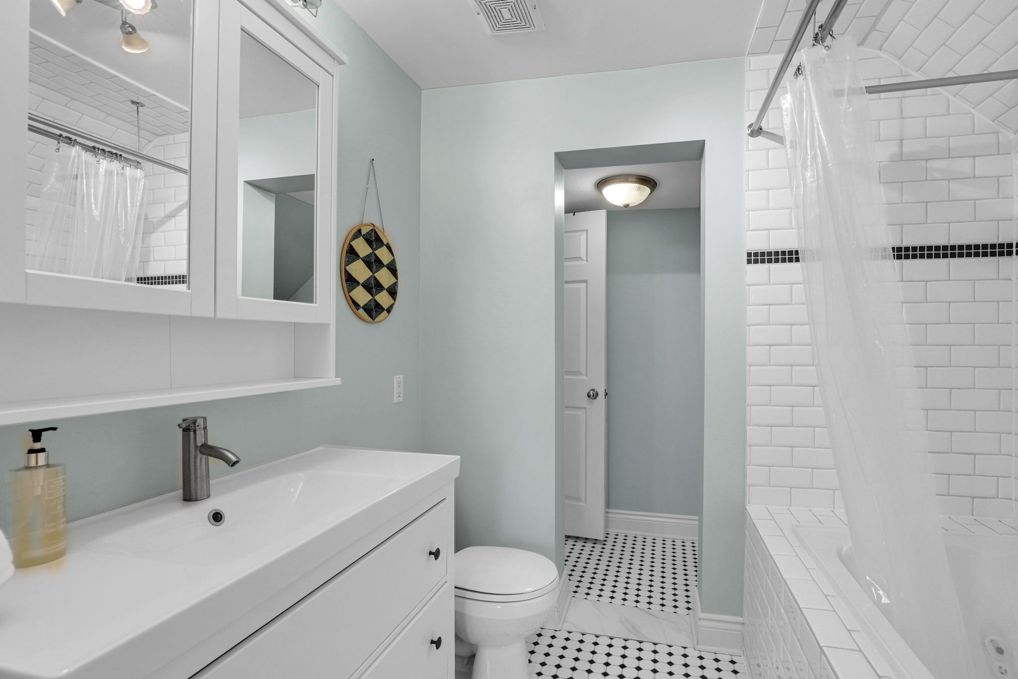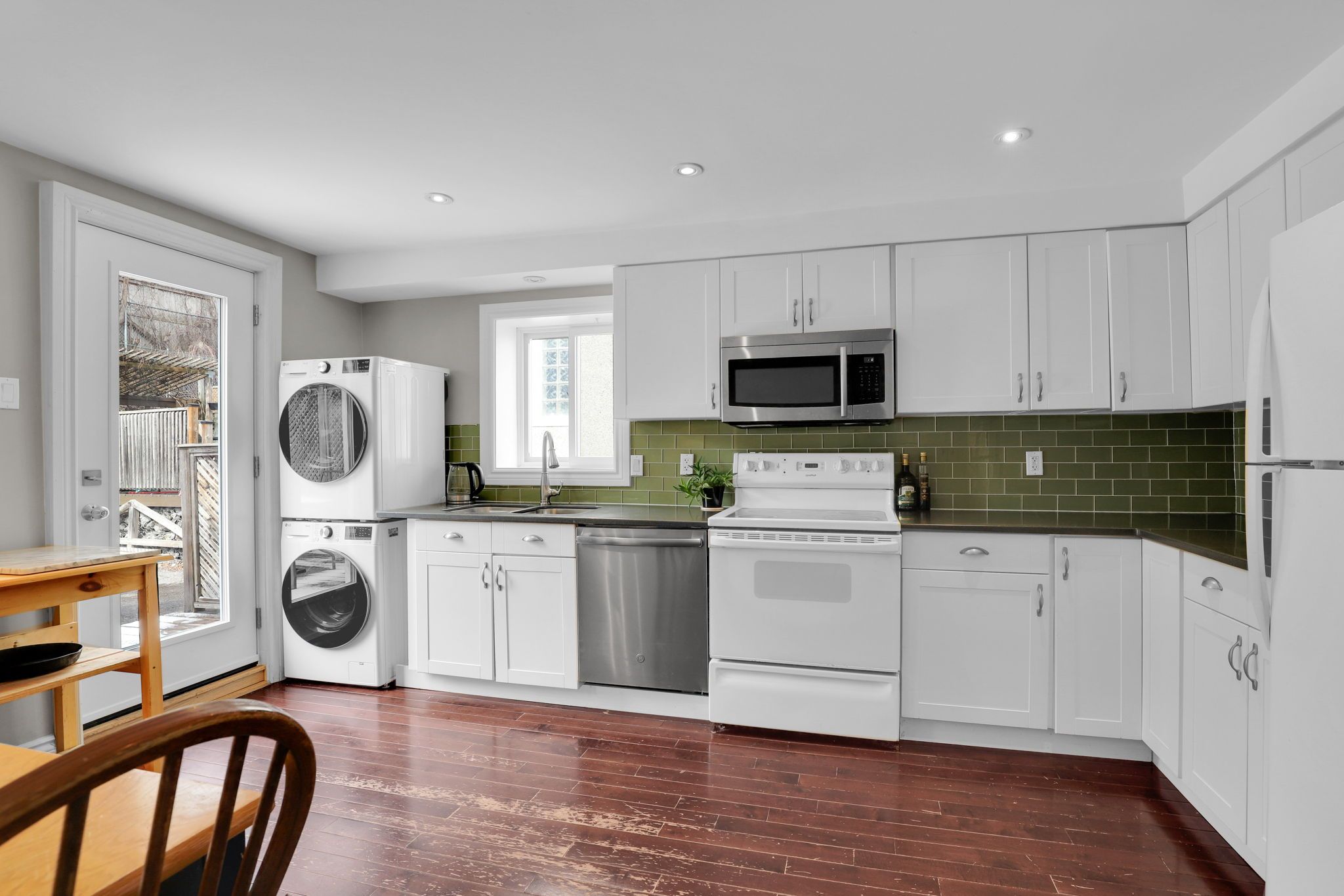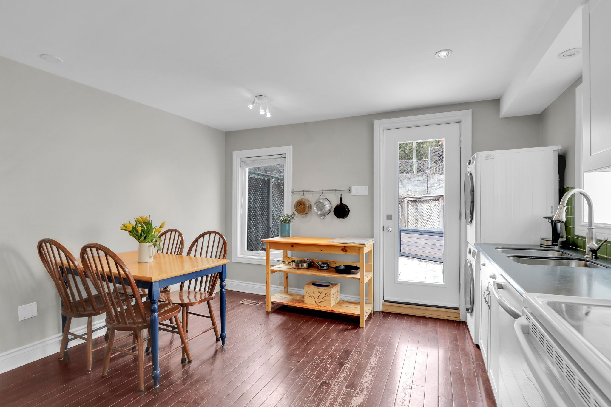 • Bright eat-in kitchen with pot lights and ample storage space.