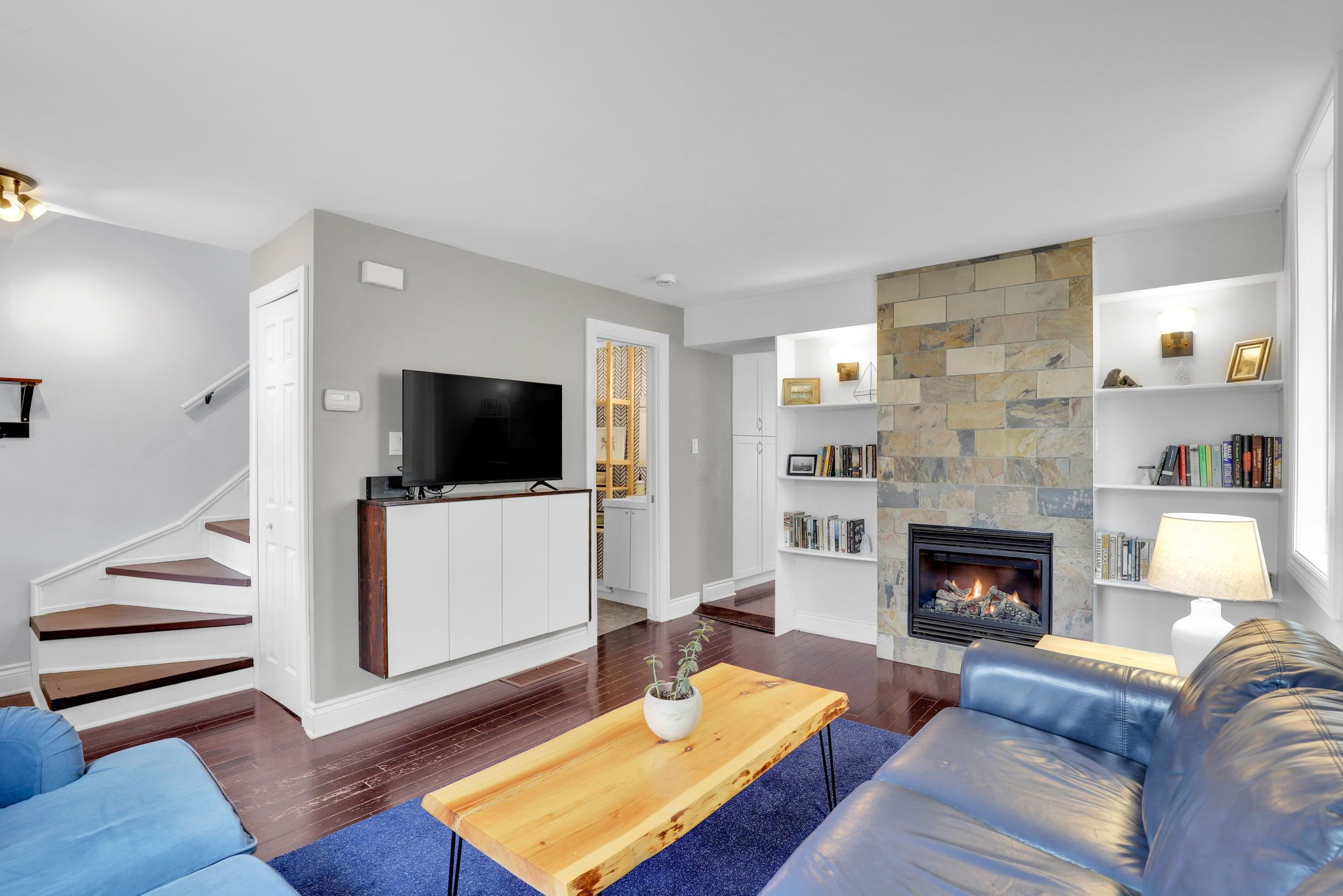 • Cozy living room with gas fireplace and built-in shelving.