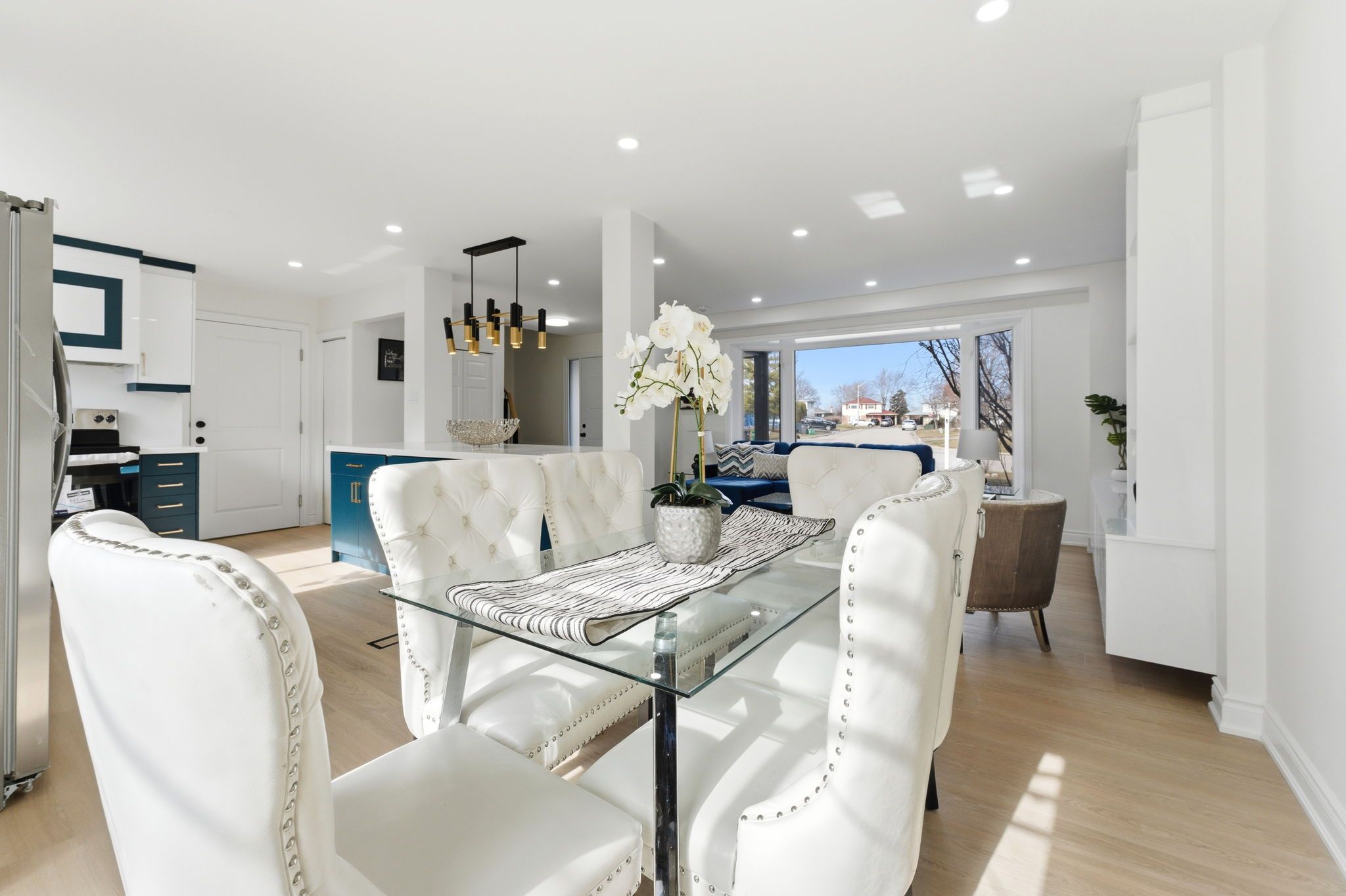 • Open-concept living and dining area with bright pot lights and custom railings.