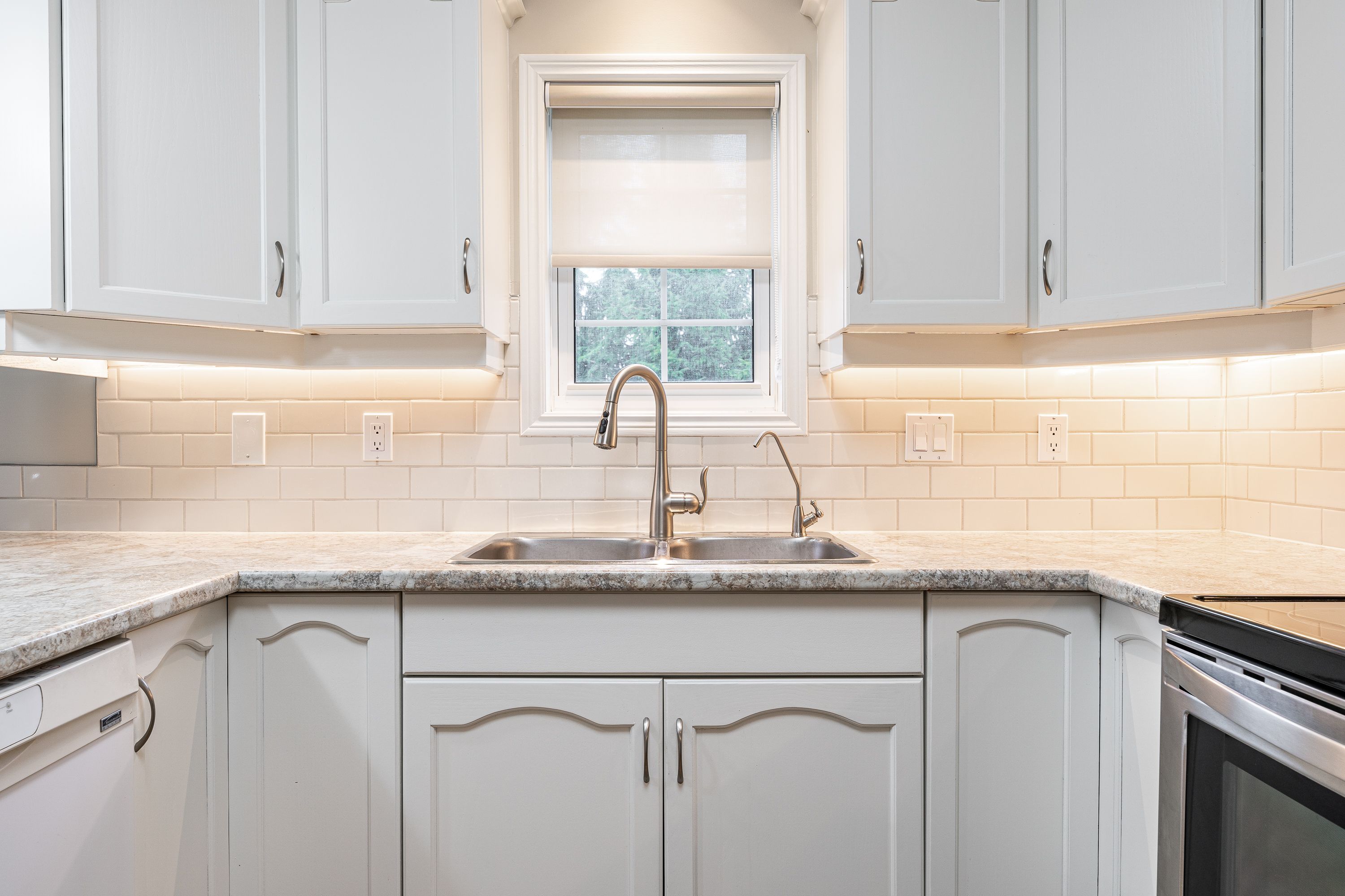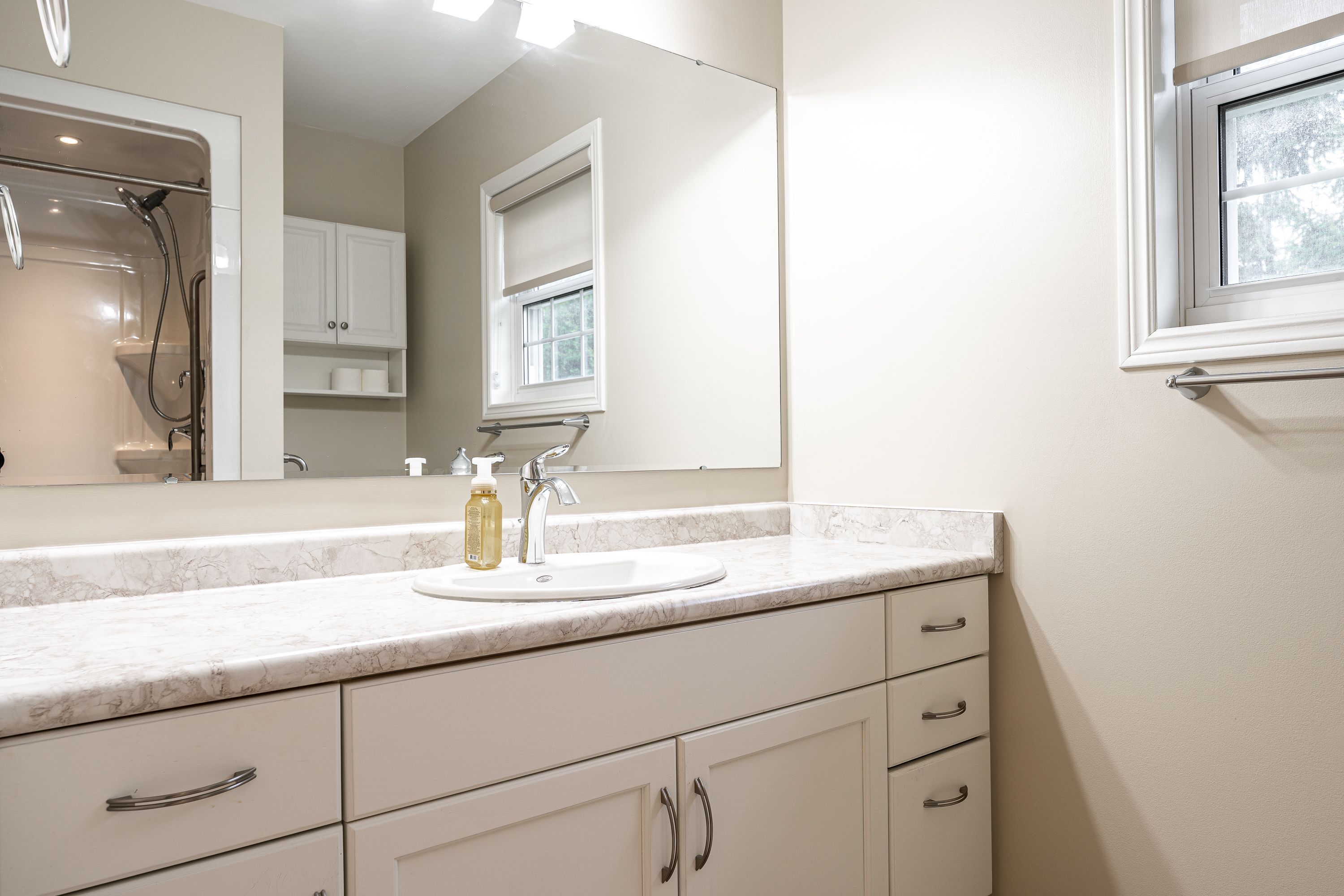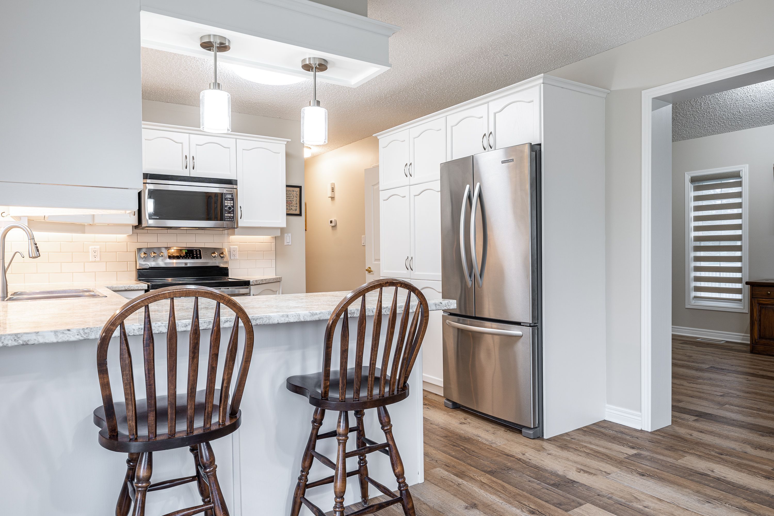 • Updated kitchen with fresh cabinets, appliances, and pantry features.