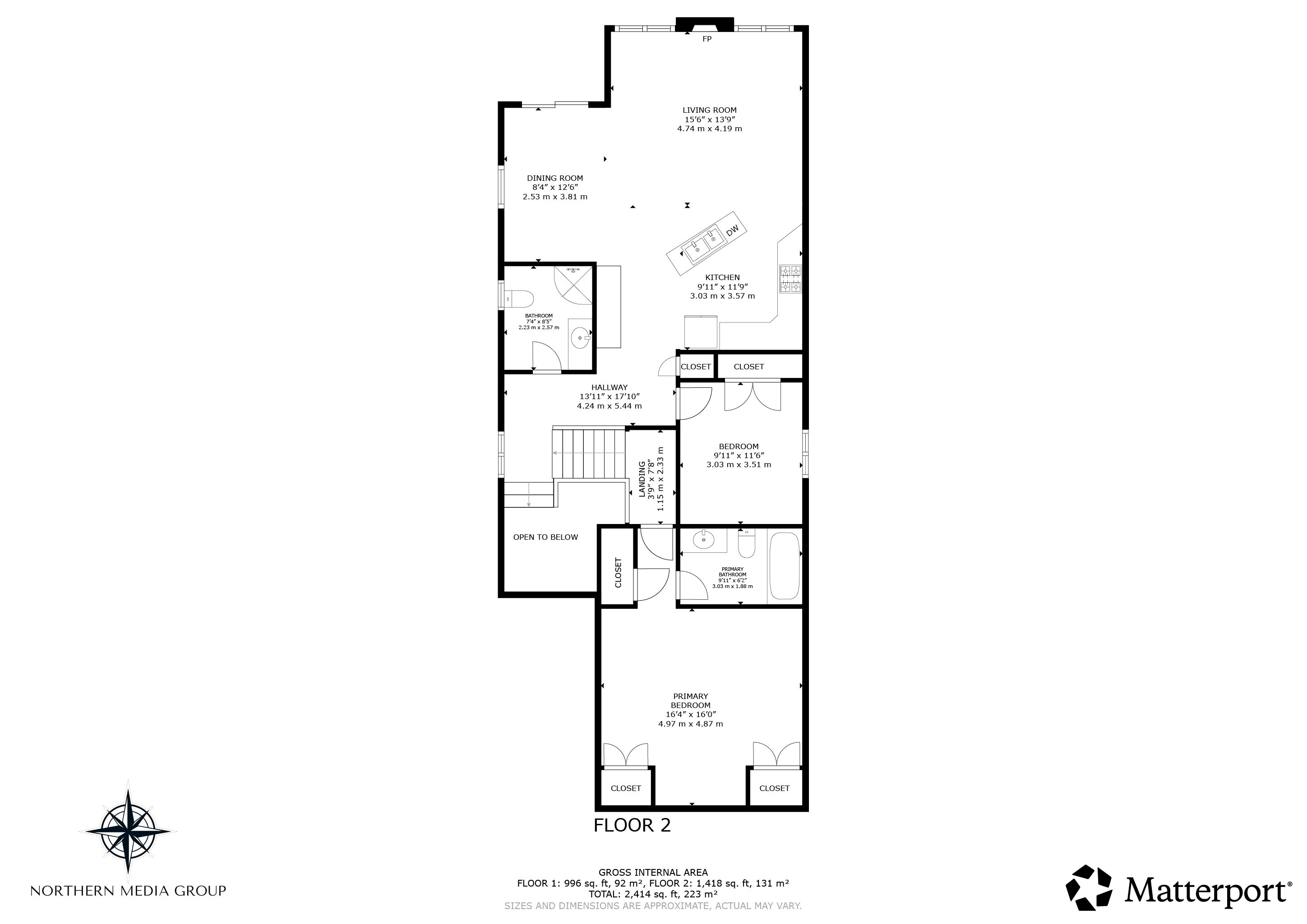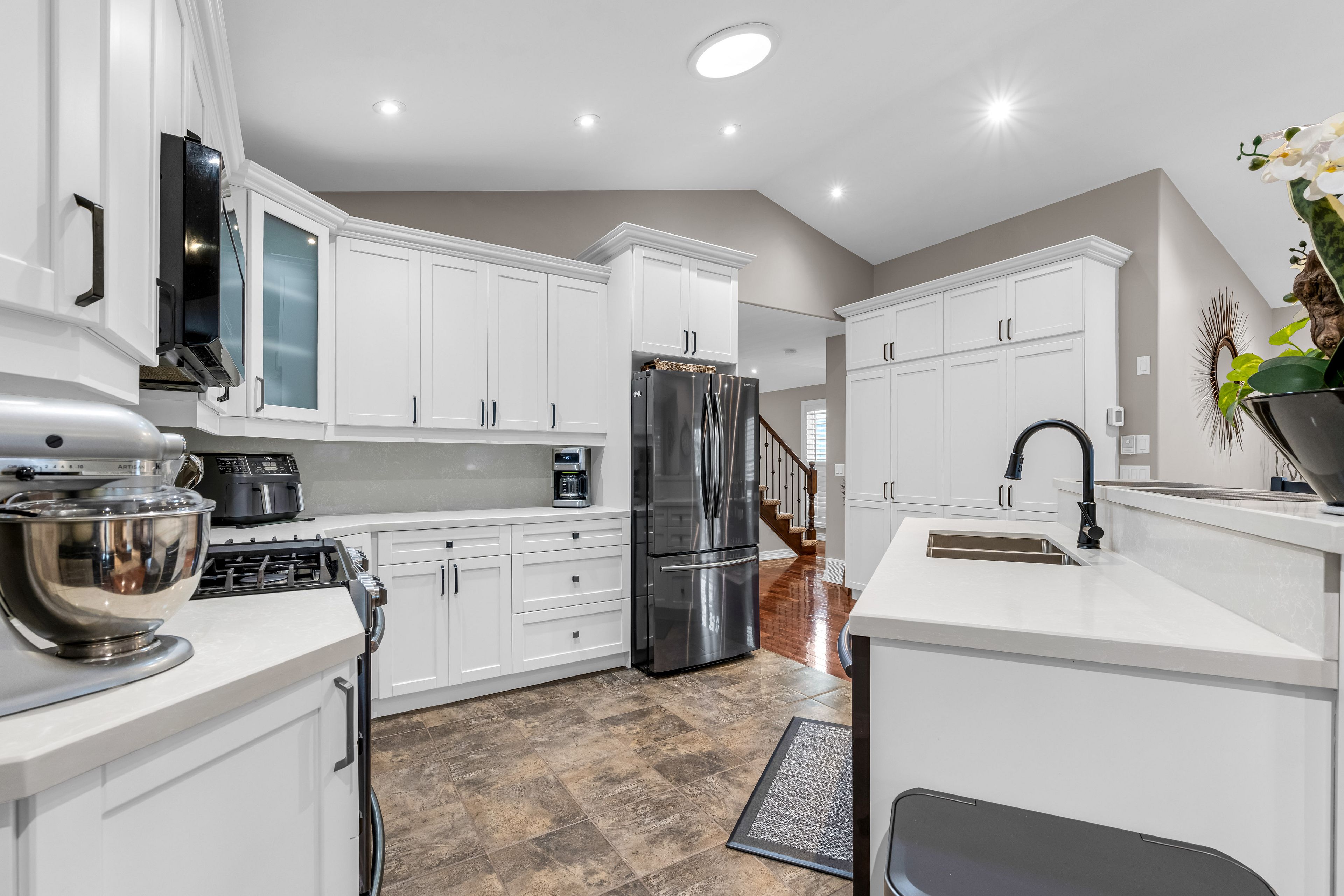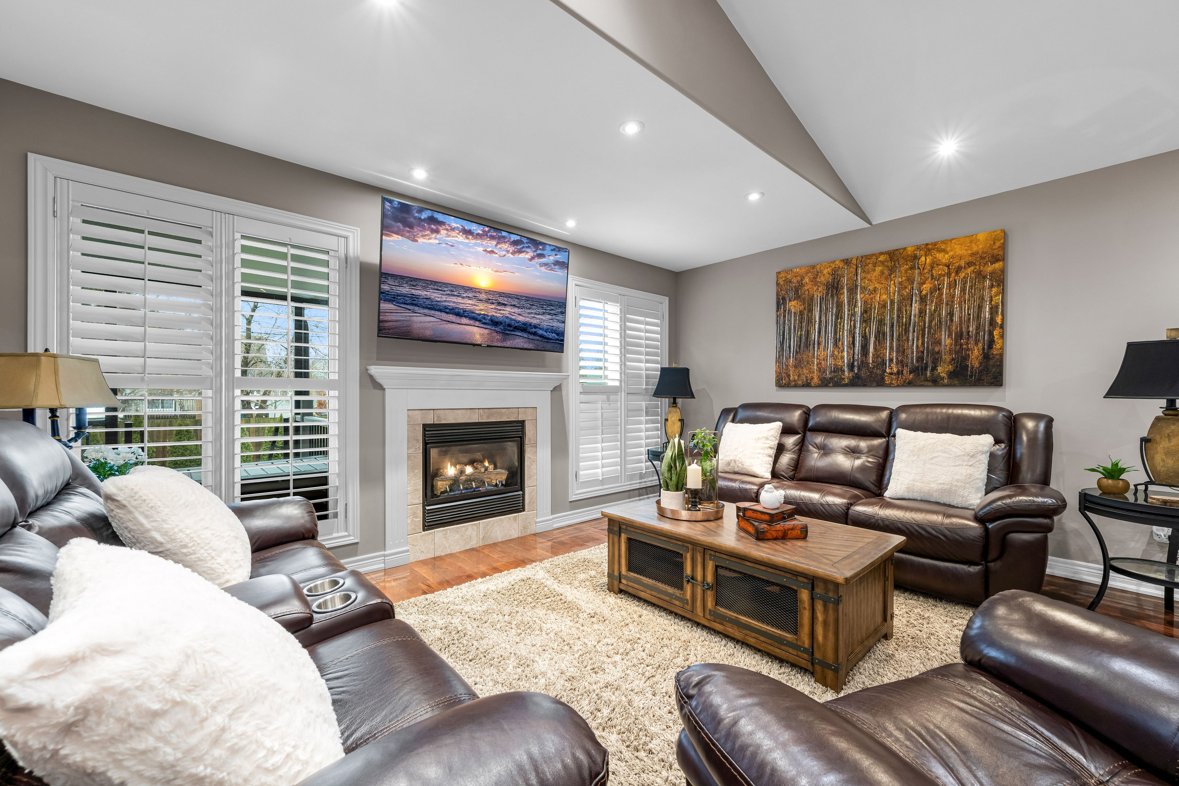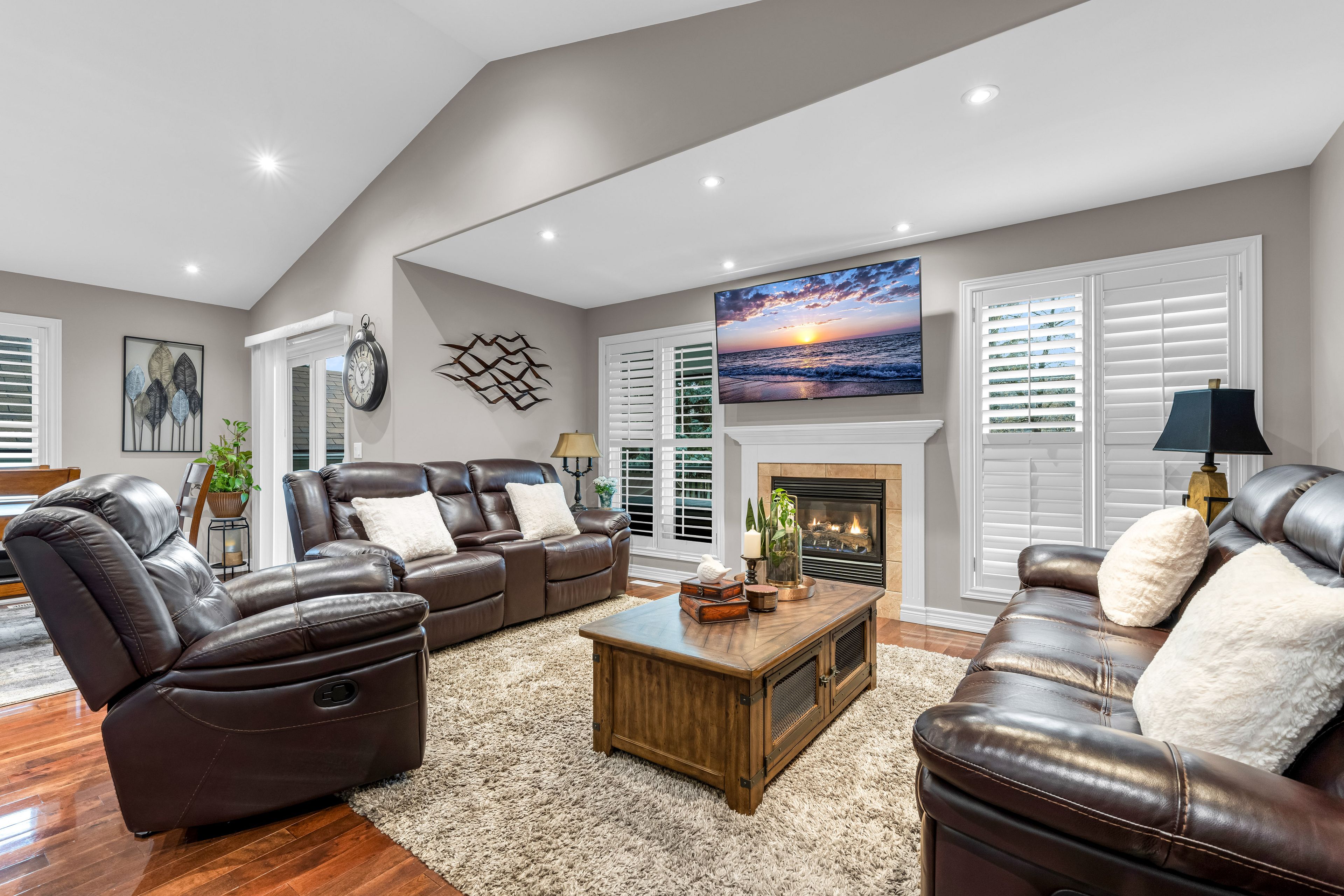 • Open-concept living area with hardwood floors and gas fireplace.