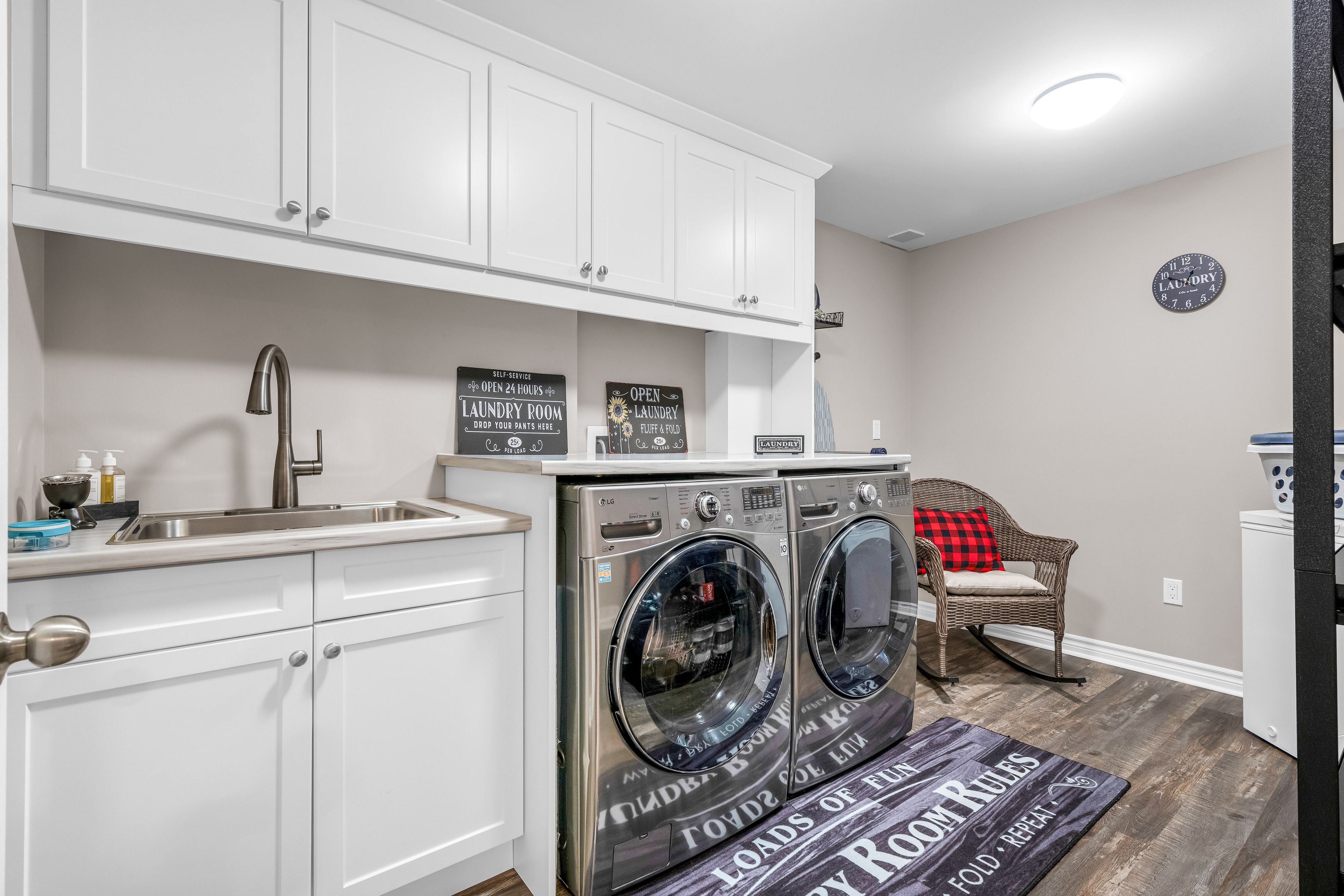 Move-in ready and thoughtfully designed for everyday comfort, this home showcases quality craftsmanship from the moment you arrive. The inviting front porch features durable composite decking and sets the tone for what's inside. Gleaming hardwood floors flow through the open-concept living and dining areas, where large windows and a striking gas fireplace create a bright and welcoming atmosphere. The kitchen is both stylish and functional, offering crisp white cabinetry, granite countertops, and a coordinating backsplash. Step outside to enjoy seamless indoor-outdoor living with access to a covered rear deck, also finished with composite decking, overlooking a concrete patio that's ideal for relaxing or entertaining. The main level includes a comfortable second bedroom and a well-appointed three-piece bathroom. Privately situated, the primary bedroom suite features his-and-hers closets, along with an additional spacious closet equipped with hookups for a stackable washer and dryer. The lower level offers a warm and inviting family room with a gas stove, a convenient two-piece bathroom, and plenty of storage space.