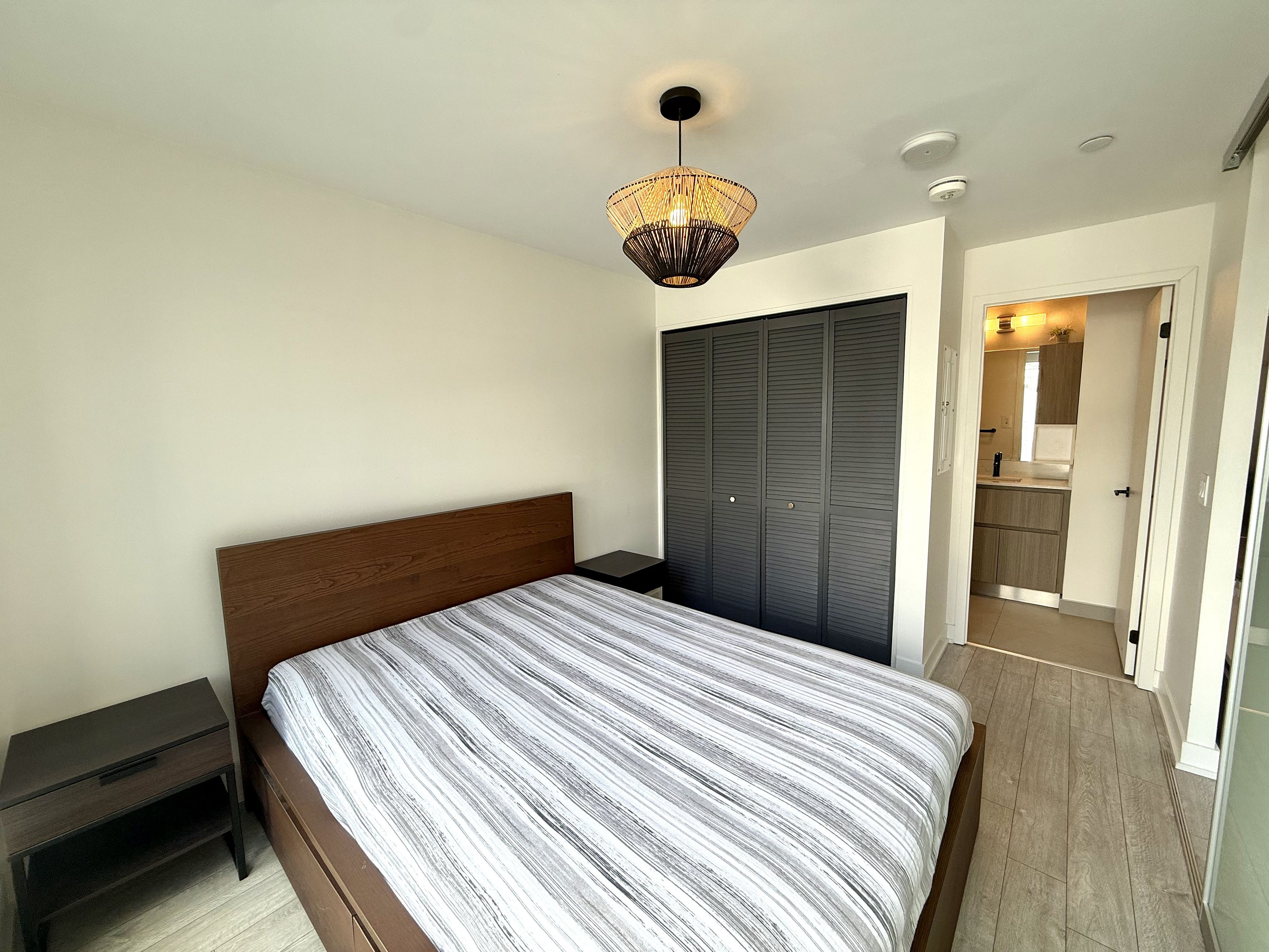 Well-designed furnished two-bedroom, two-bathroom condo unit with parking for rent. It offers a functional layout ideal for young professionals, couples, or growing families. A welcoming foyer with a spacious hall closet opens into a modern kitchen complete with a breakfast bar for casual dining. The generous living and dining areas are perfect for entertaining, highlighted by floor-to-ceiling windows that flood the space with natural light and provide direct access to a private balcony. The bright primary bedroom features custom-built closet organizers and a four-piece ensuite bath. The second bedroom is generously sized with excellent closet space and convenient access to an additional four-piece bathroom. Set in the heart of riverside and within walking distance of many restaurants and coffee shops. Easy access to transit and dvp. Plenty of amenities including gym, concierge, party room, rooftop deck & pool, guest suites & visitor parking.