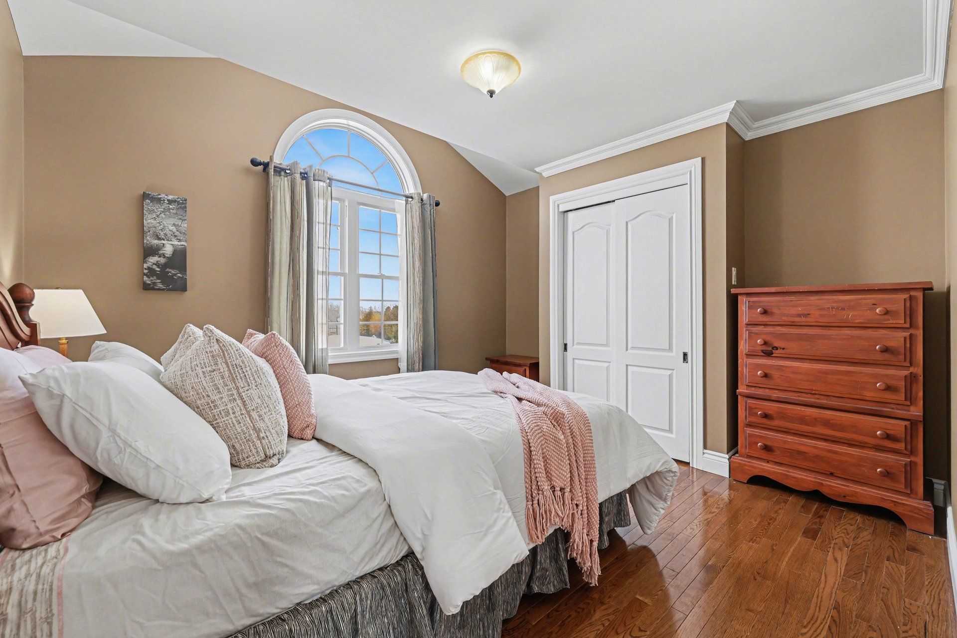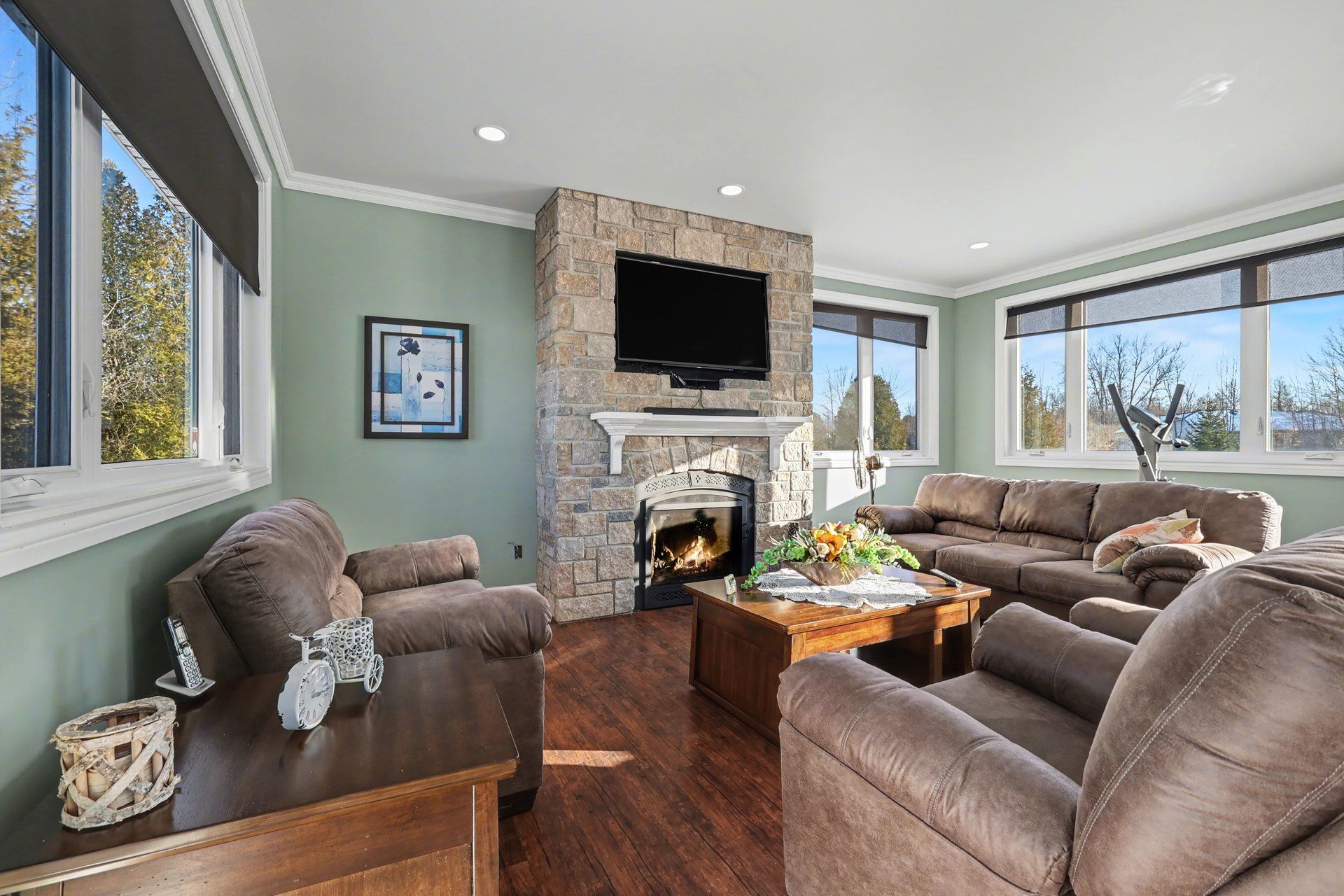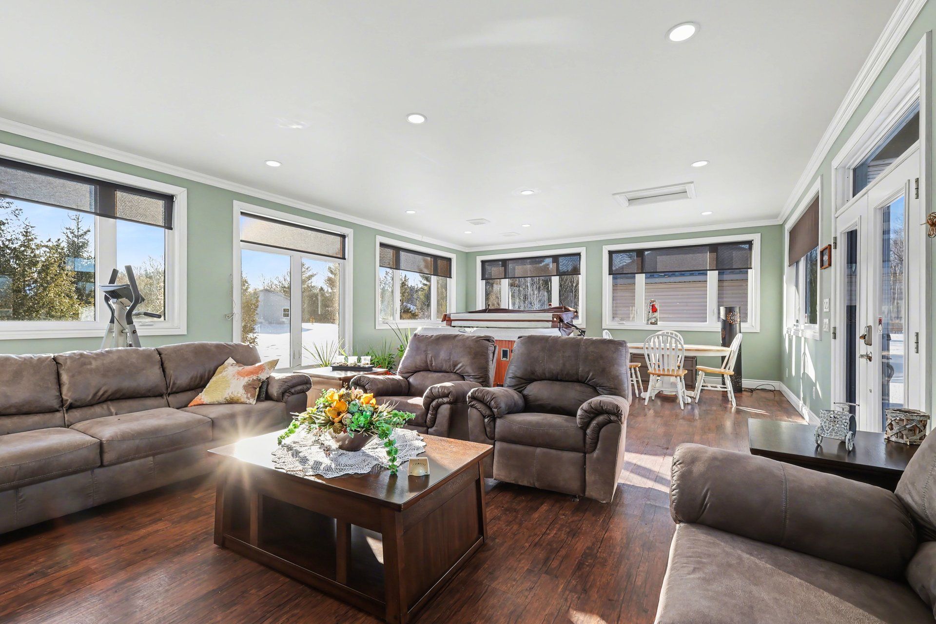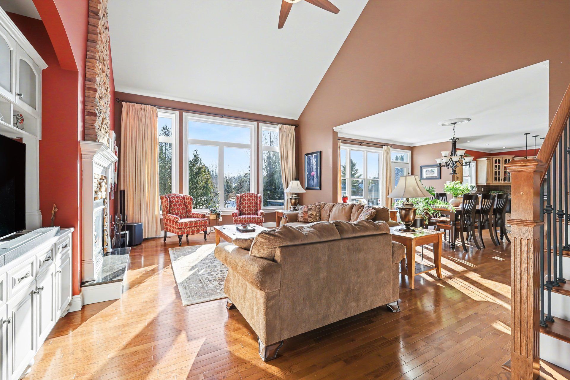 • Bright open-concept living area with cathedral ceilings and large windows.