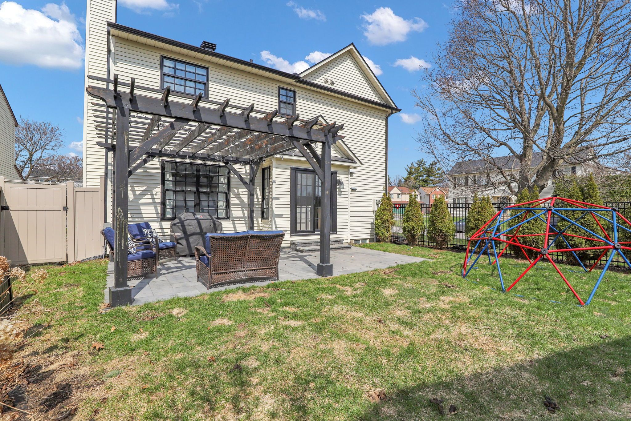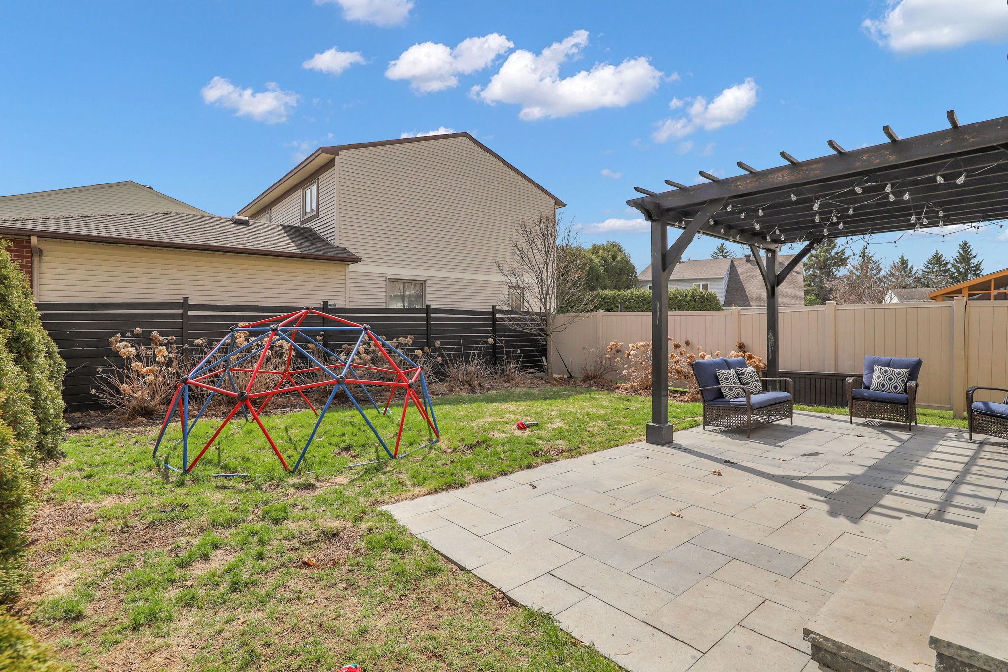 • Backyard retreat with limestone patio and custom pergola for outdoor enjoyment.