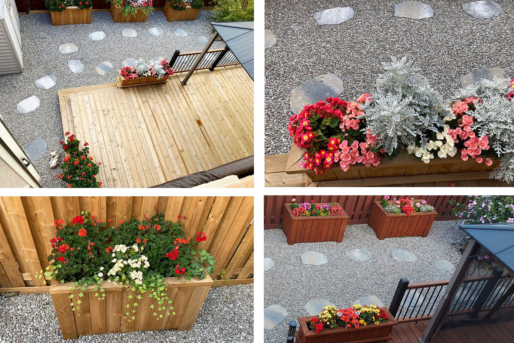 • Low-maintenance backyard features a large deck, gazebo, and patio stones.