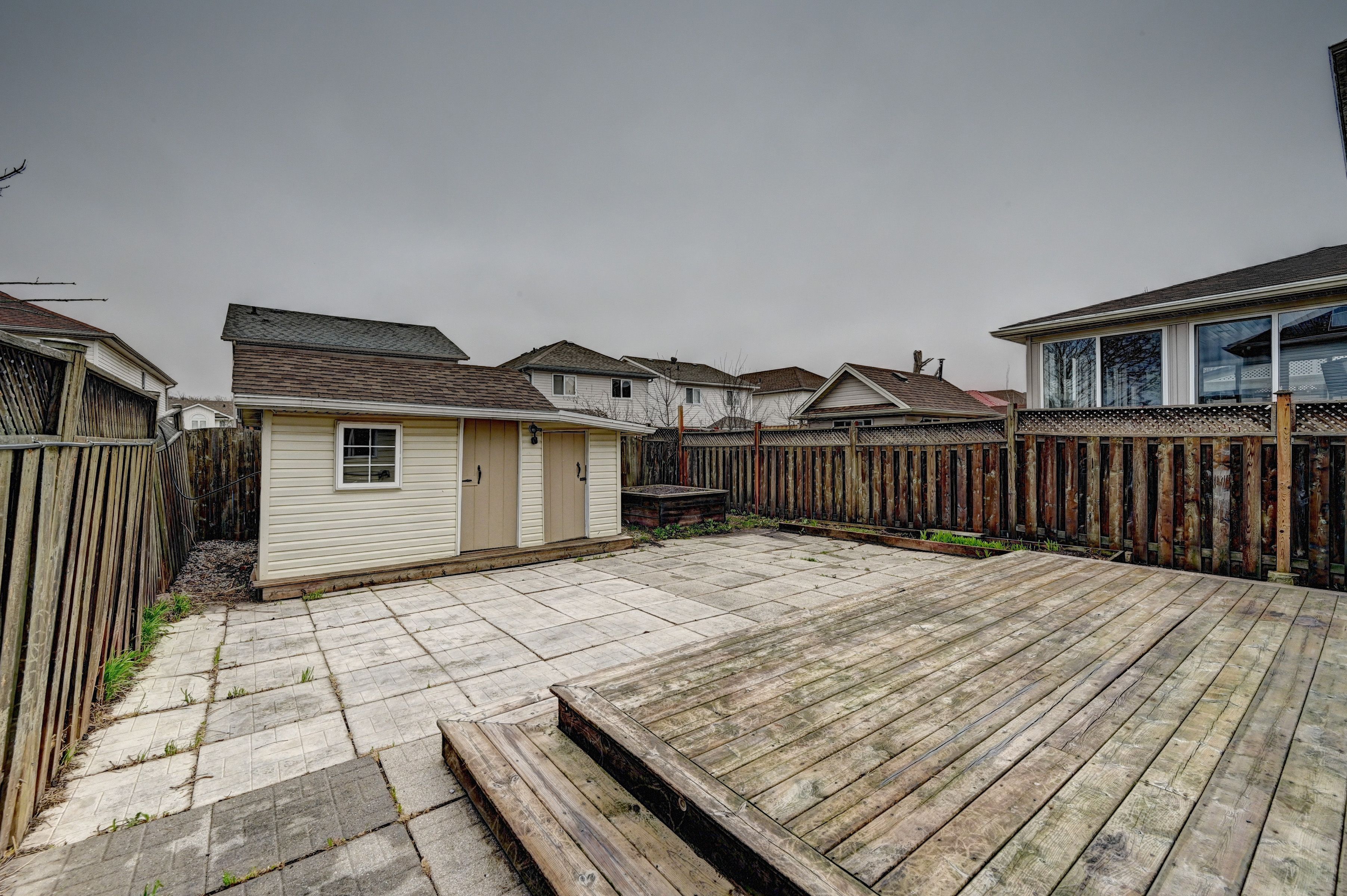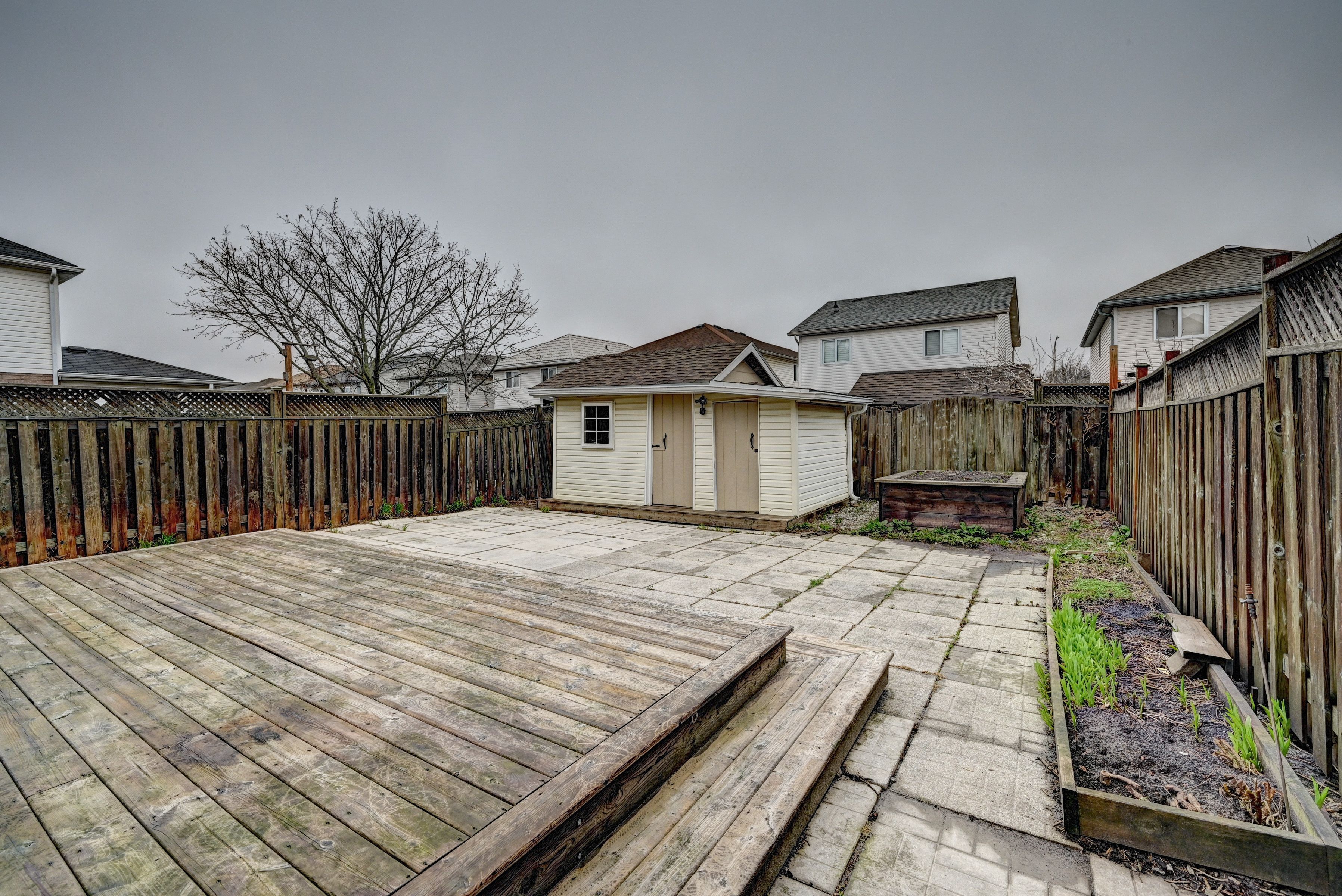 • Fully fenced backyard with shed and flower beds for gardening.