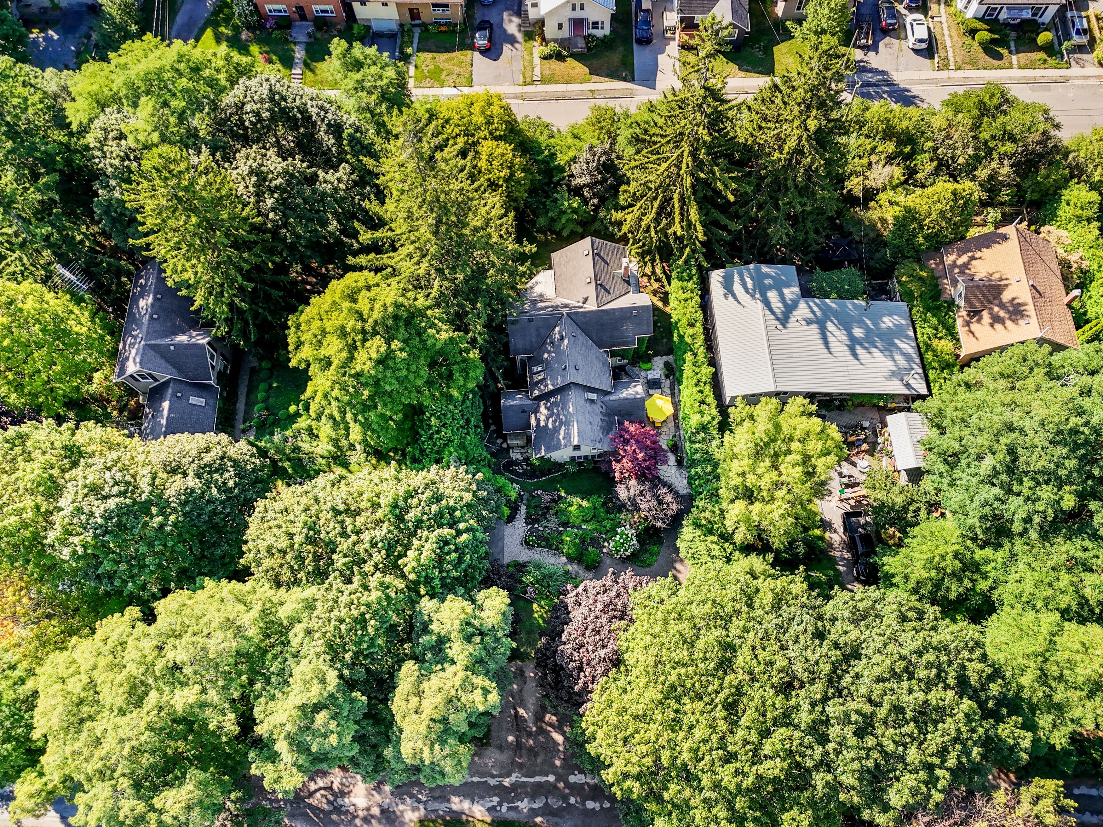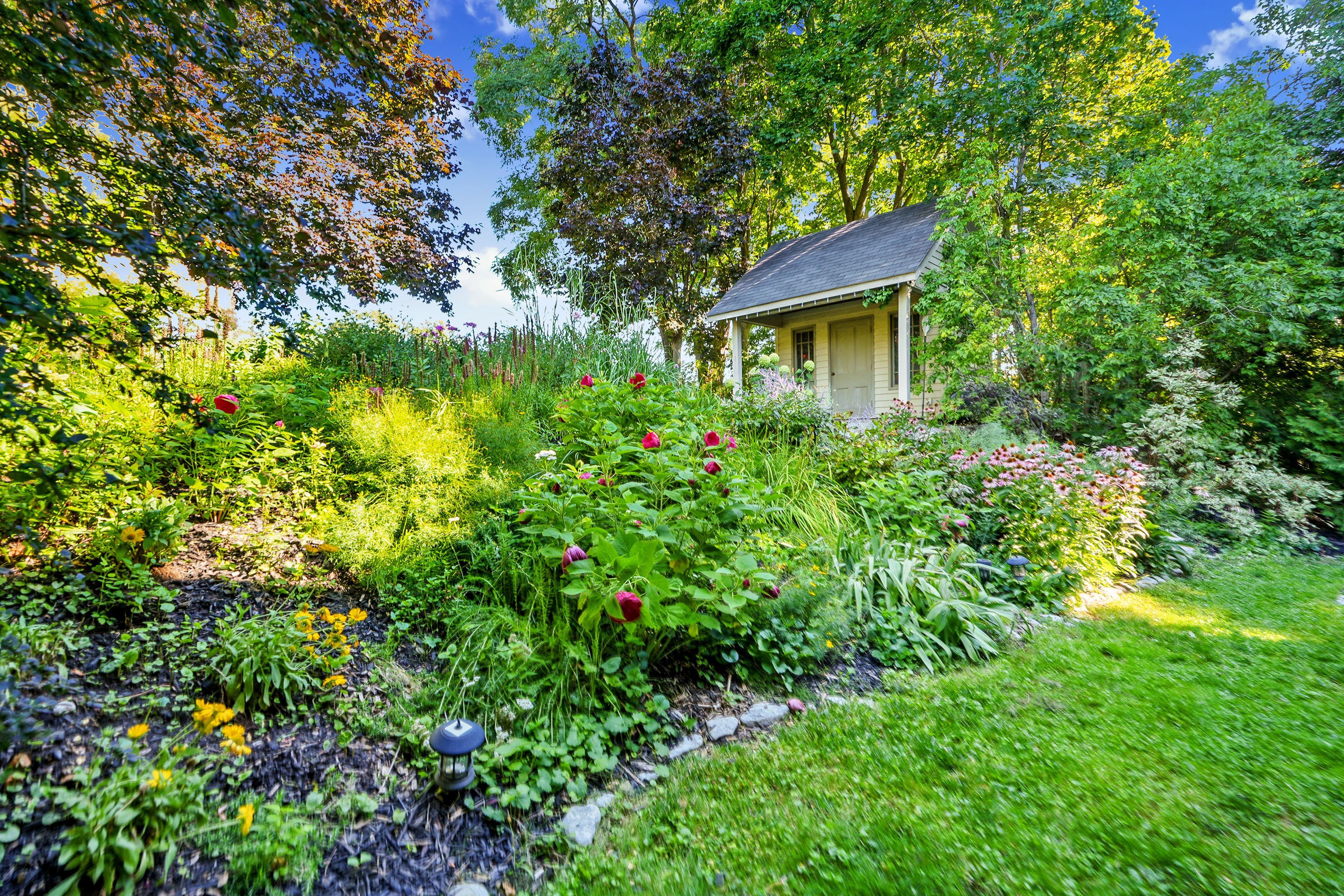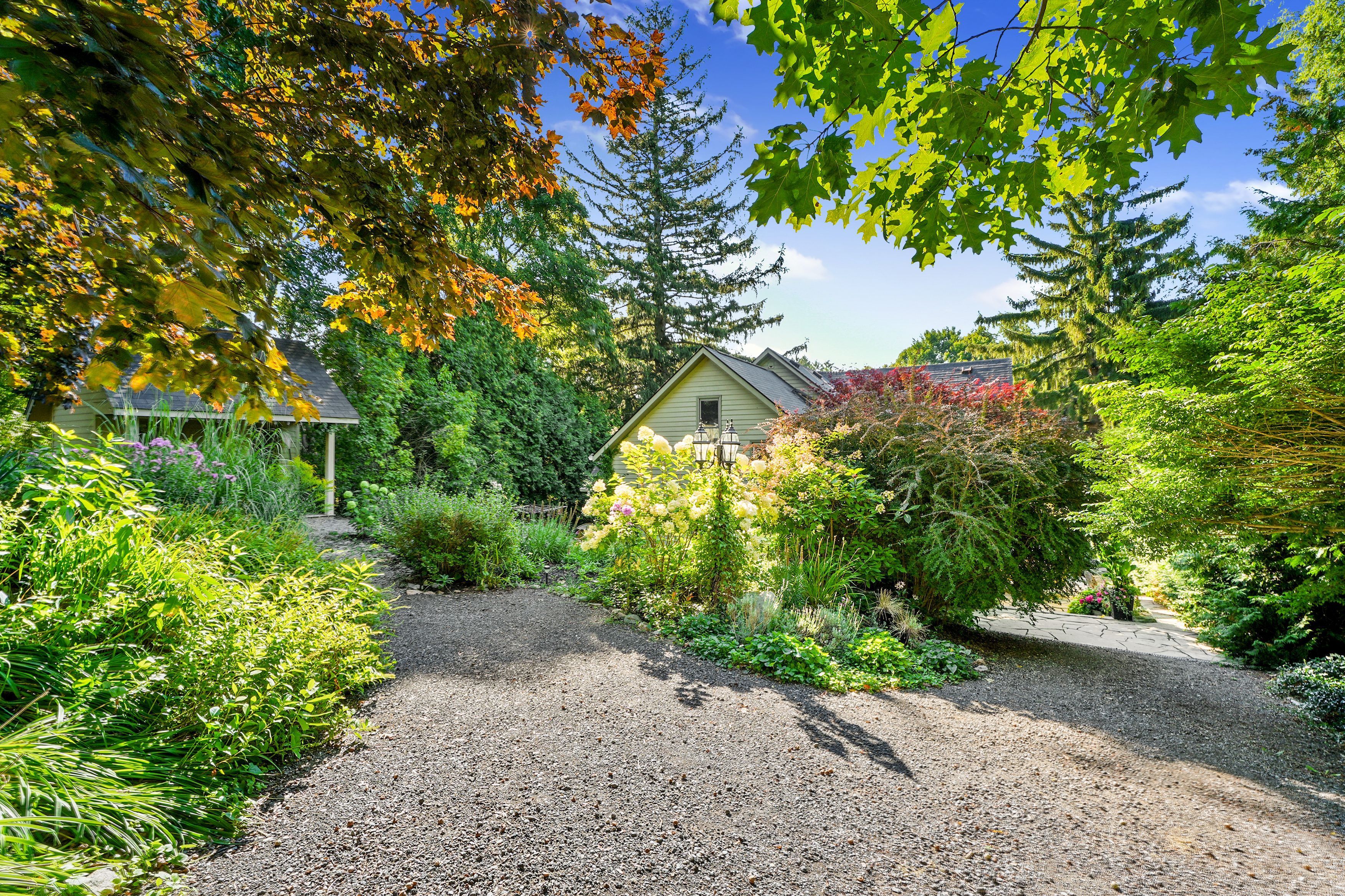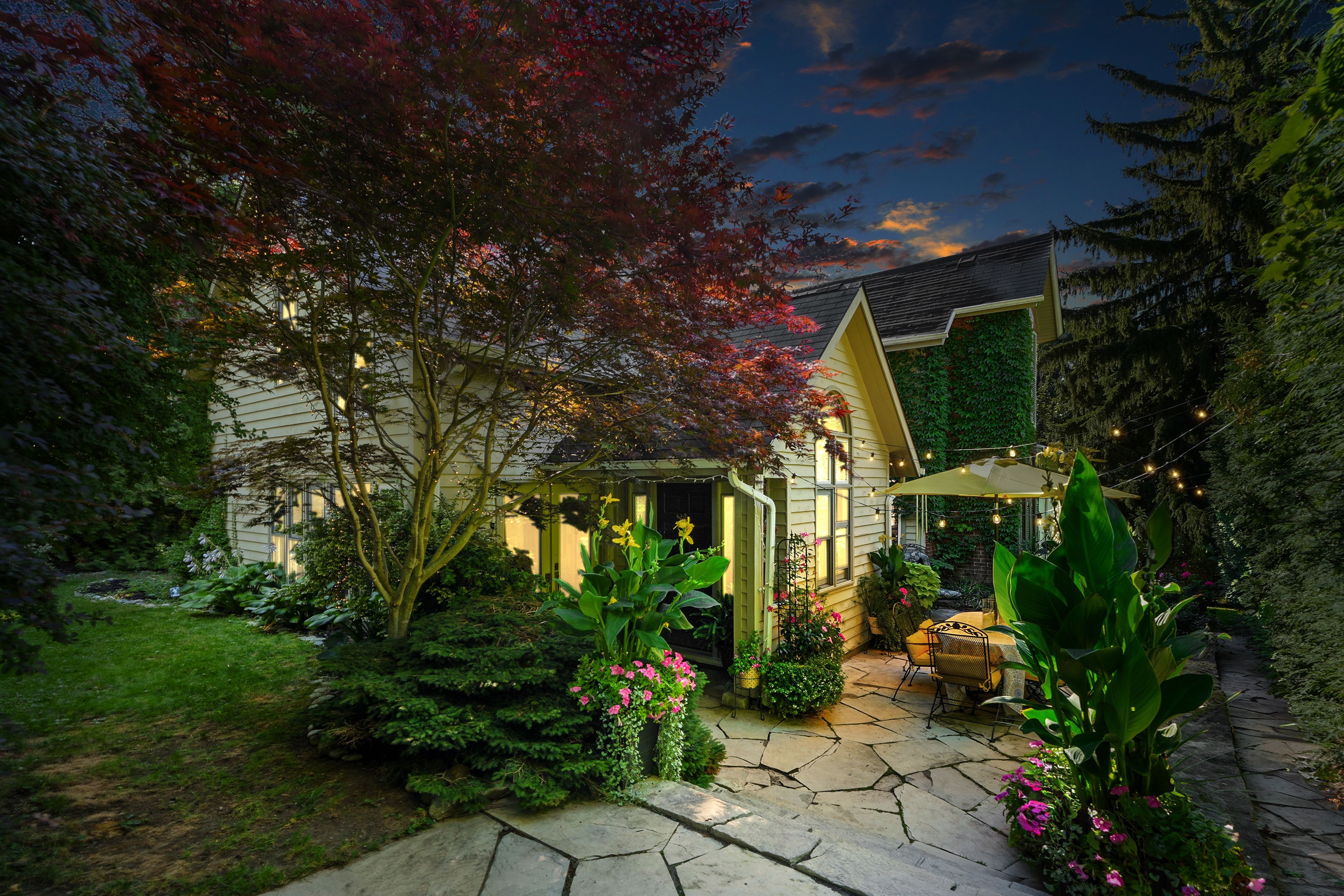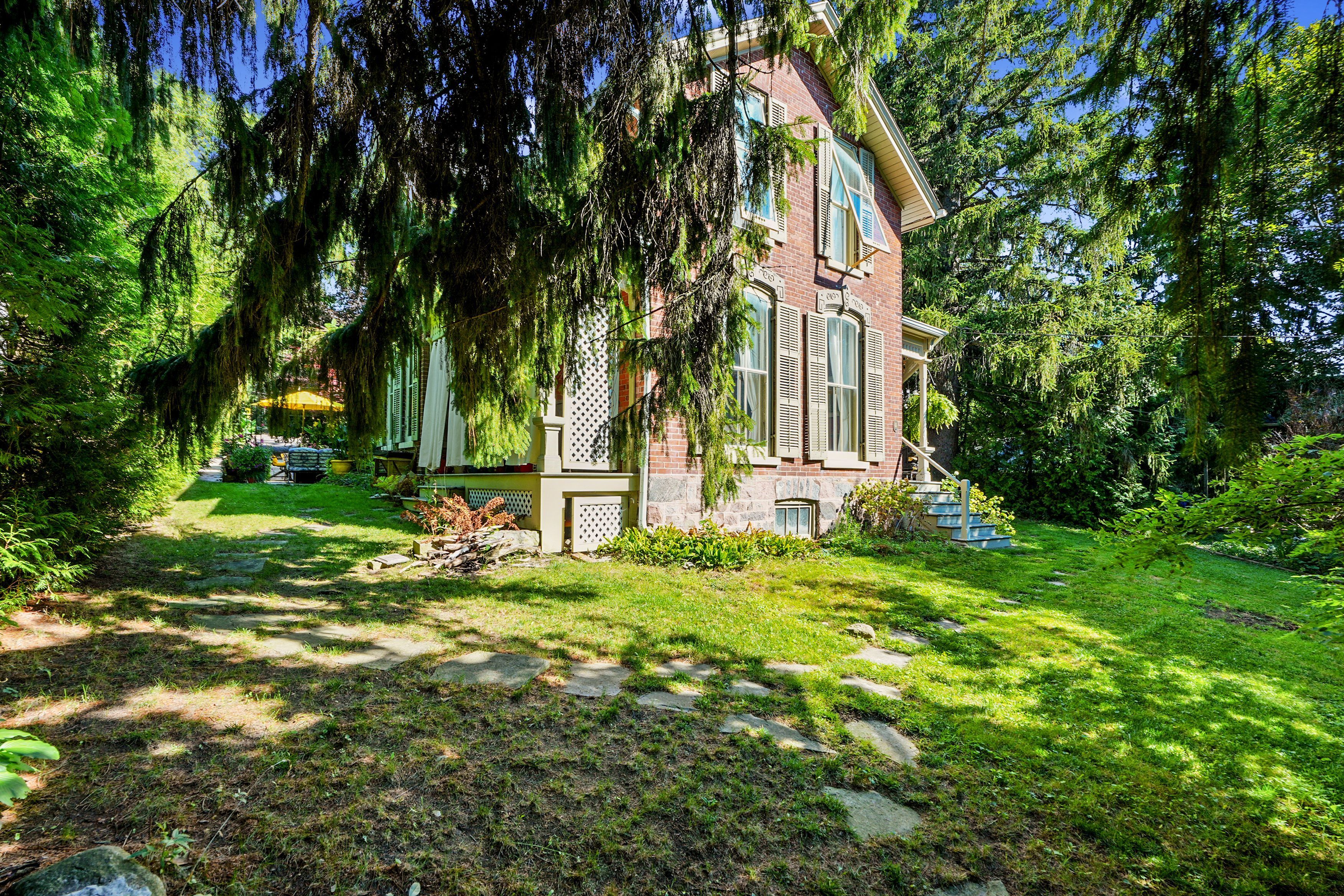 Located on a picturesque, tree-lined street in the heart of downtown port hope, this distinctive 1850s-built home blends timeless character with thoughtful modern updates. Guests are greeted by a beautiful open foyer featuring a striking floor design and large windows that flood the space with natural light. The living room impresses with a sun-soaked layout, a wall of windows, and a soaring two-storey ceiling. In contrast, the spacious dining room showcases detailed trim and high baseboards, an ideal setting for holiday gatherings and year-round entertaining. The kitchen is designed for hosting, offering generous cabinet and counter space, a coffee bar area, gas stove, breakfast bar, and a prep counter accented by pendant lighting. A character-filled sitting or music room connects to the family room through an elegant arched doorway. The cozy family room features an ornate decorative fireplace and floor-to-ceiling windows overlooking the gardens. A main-floor three-piece bathroom and a convenient laundry room complete this level. Upstairs, the primary bedroom offers a spacious retreat with dual closets featuring french doors, high ceilings, and recessed lighting. The bathroom includes skylights, a glass shower enclosure, and a relaxing soaker tub. Two well-appointed bedrooms and an open loft ideal for a home office or guest space complete the upper floor plan. Outside, a private secret garden oasis awaits. Enjoy a covered porch perfect for morning coffee in any weather, a back patio ideal for alfresco dining, and lush mature trees and gardens, all complemented by a charming bunkie. Situated moments from trinity college school local amenities, downtown shops, and restaurants, this home offers the exceptional lifestyle port hope is known for, with easy access to the 401.