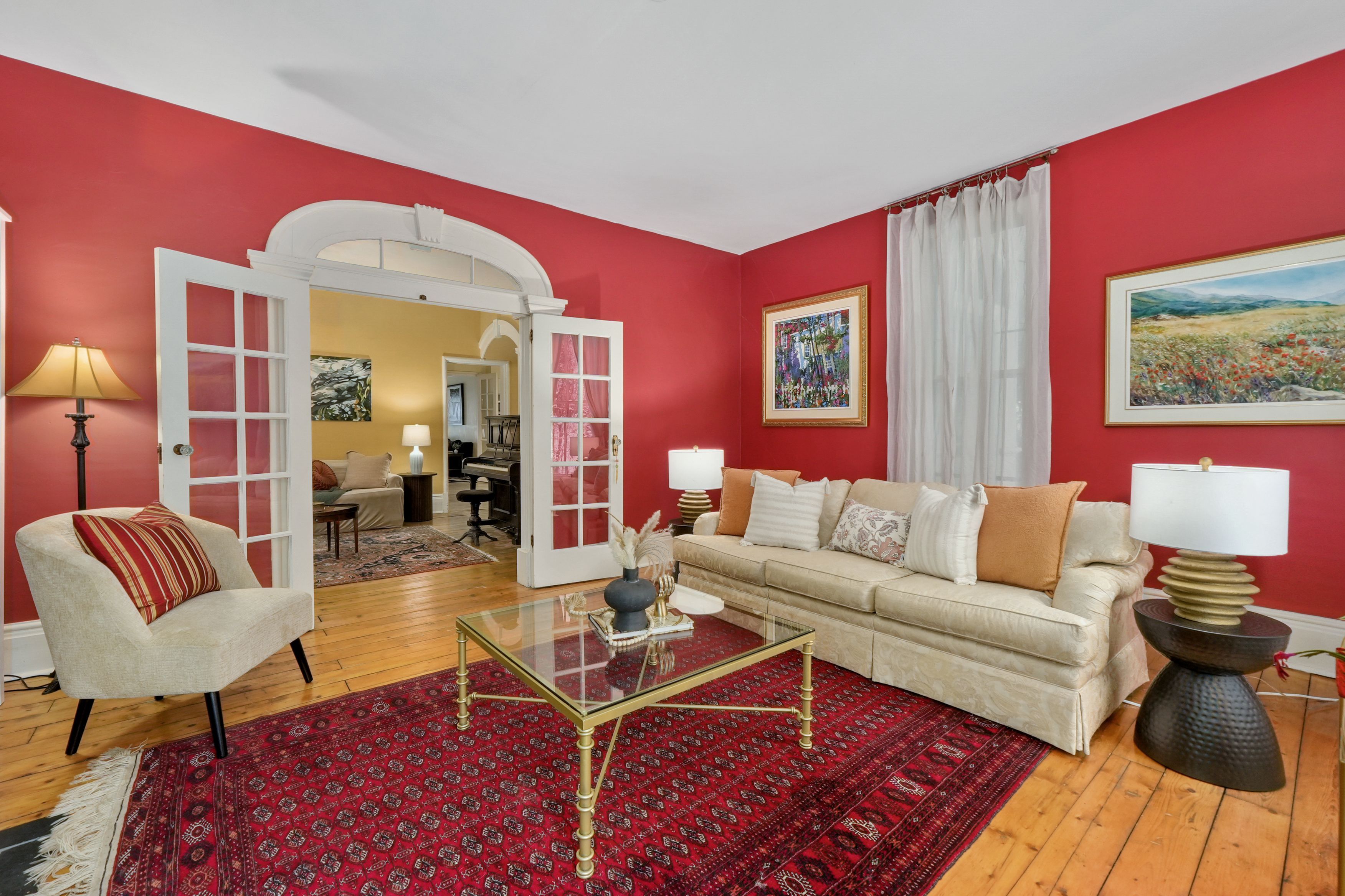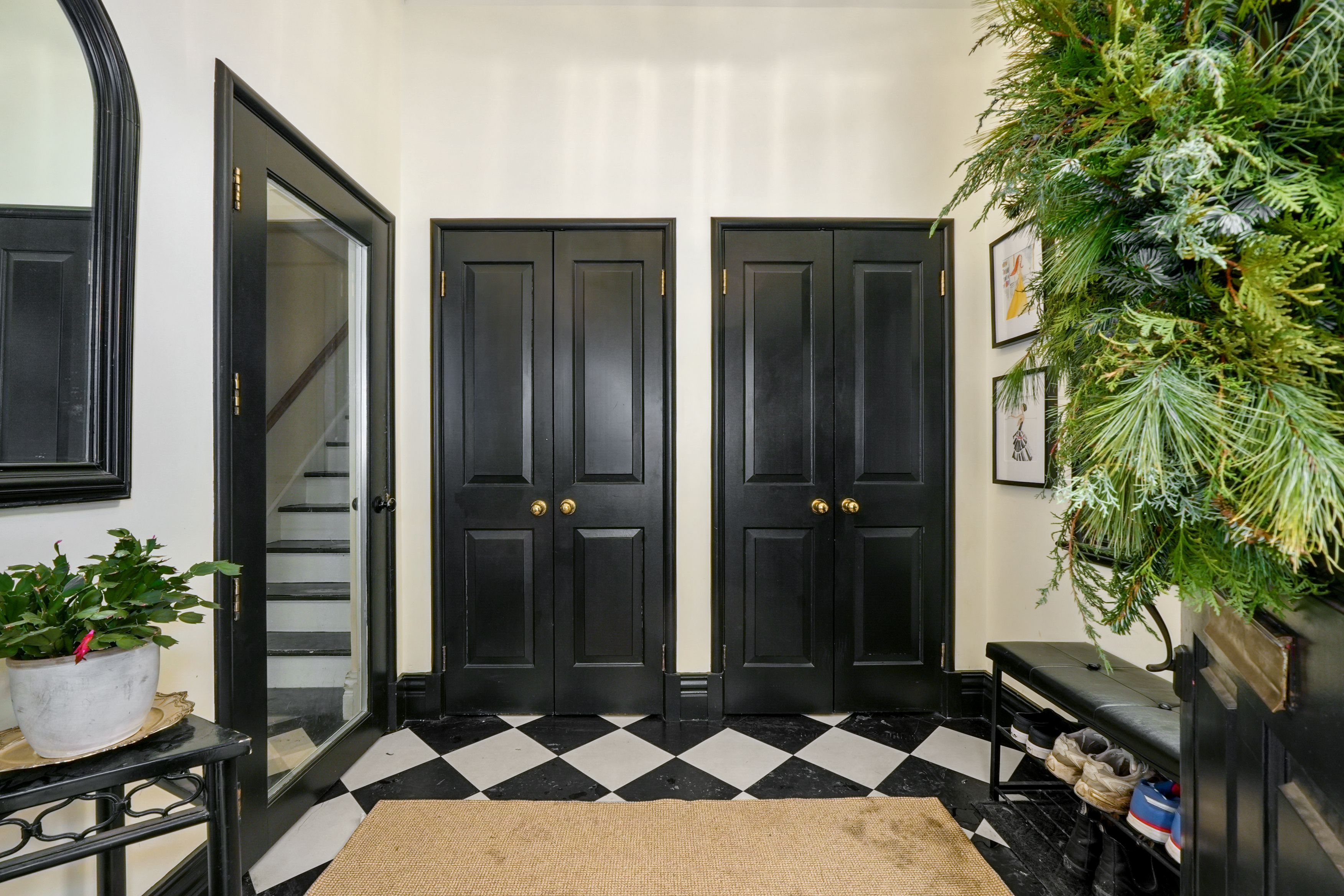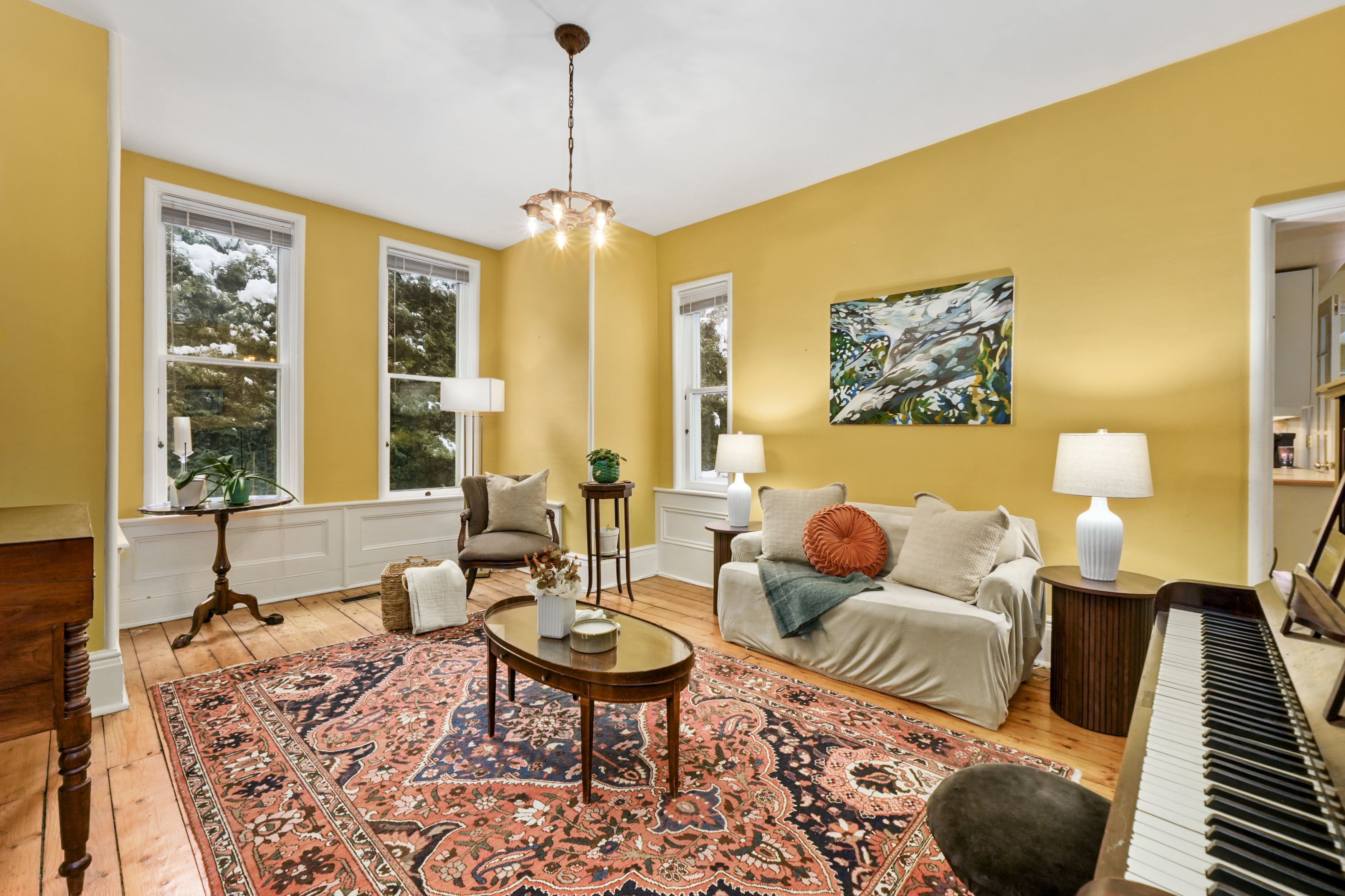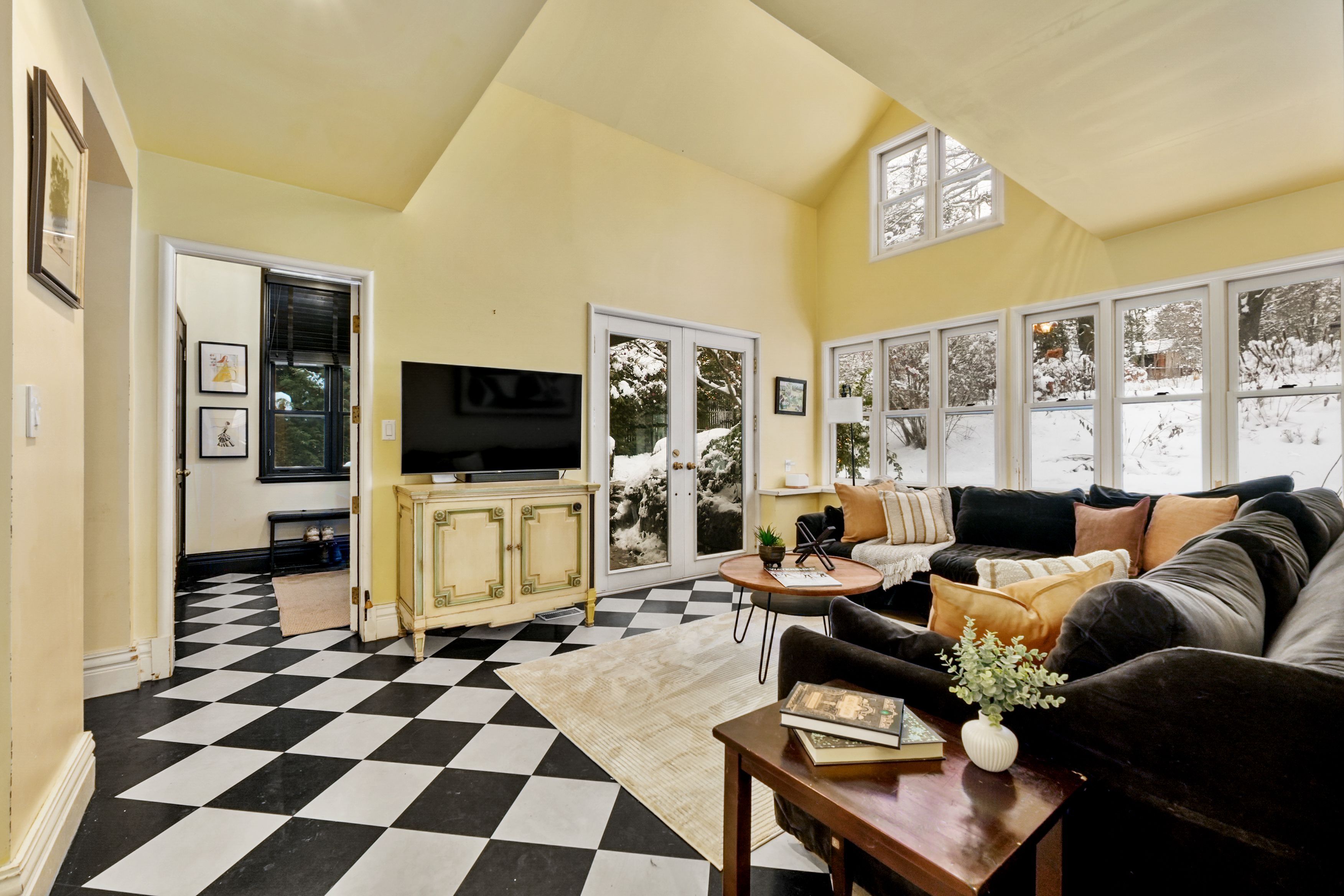 • Bright foyer and living room with large windows and a soaring ceiling.