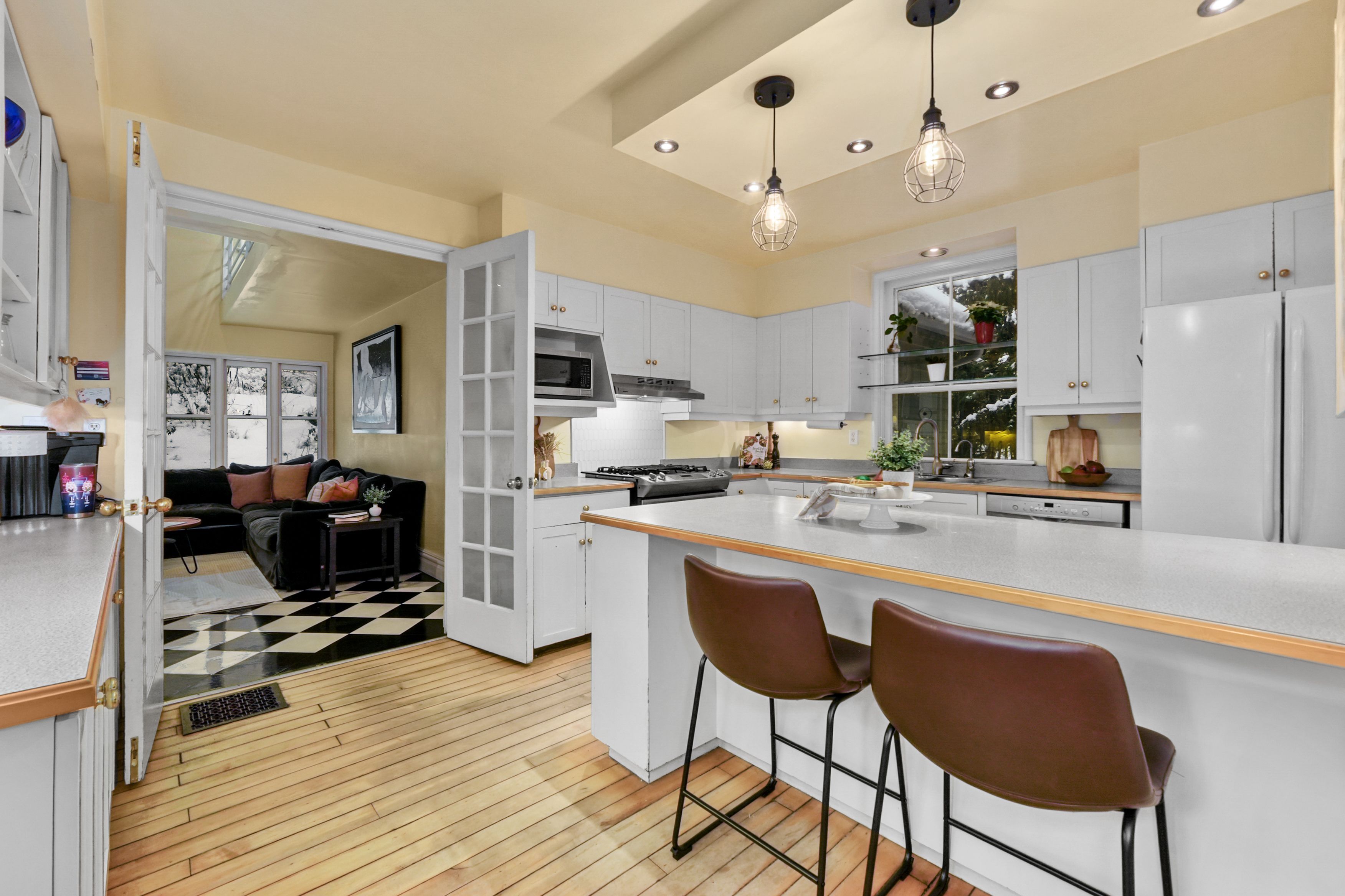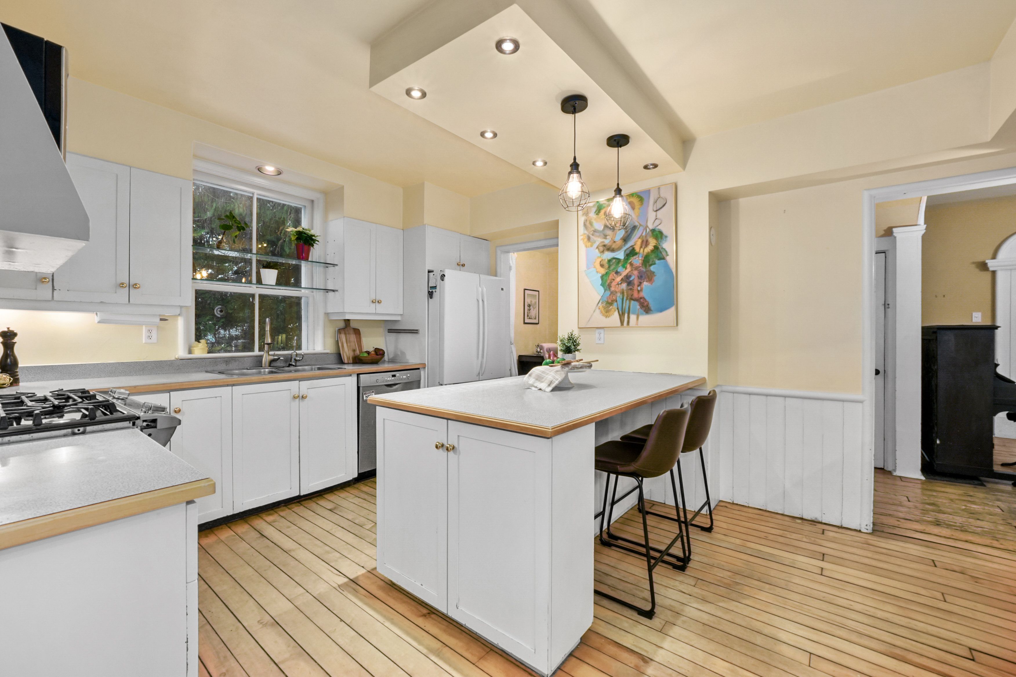 • Spacious kitchen equipped for hosting, featuring a breakfast bar and gas stove.