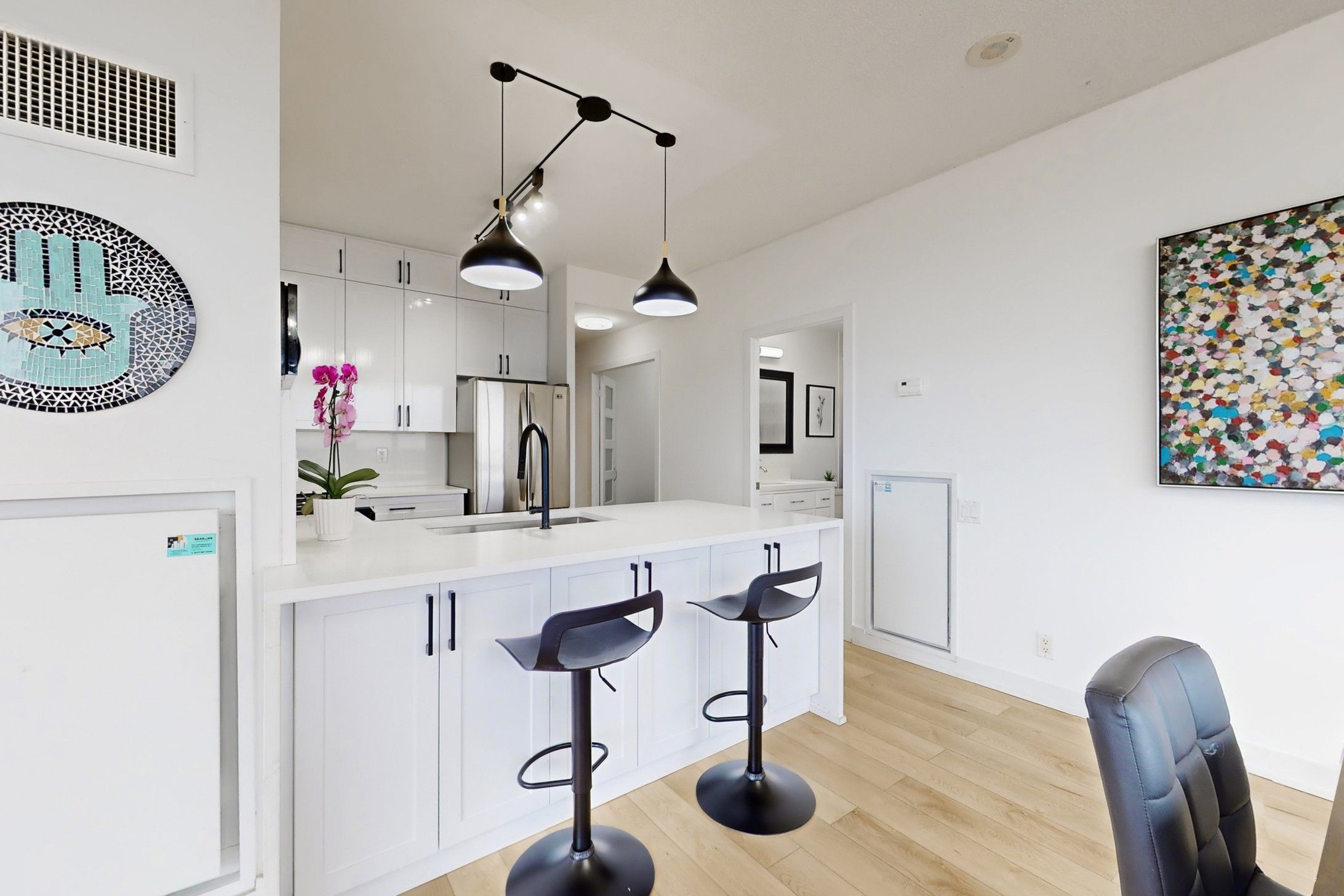 • Newly renovated kitchen with quartz countertops and stainless steel appliances.