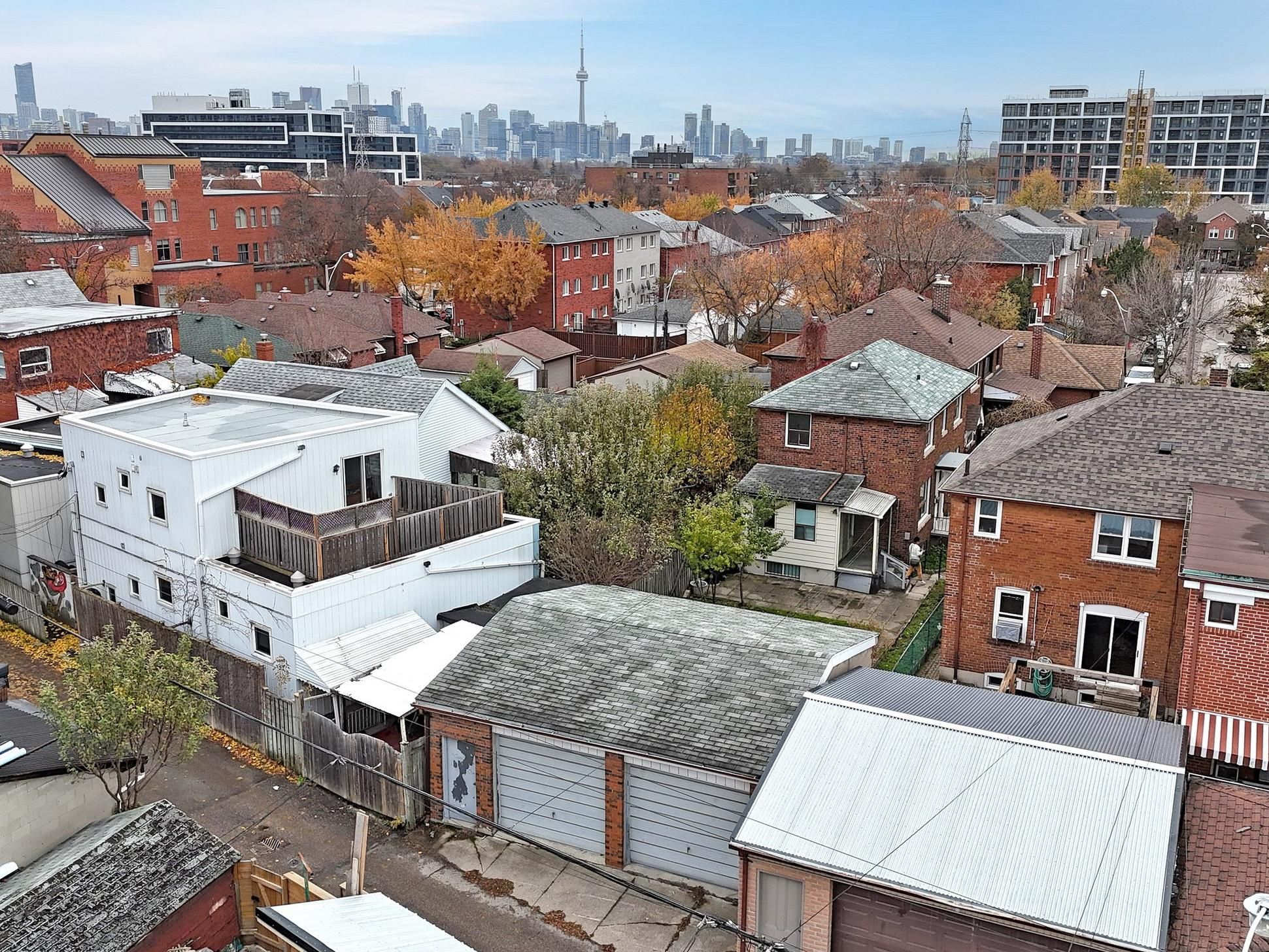 Set at the end of a quiet court with a covered front porch with wrought-iron railing, this inviting home offers thoughtfully designed indoor and outdoor living. A european-style courtyard positioned between the home and oversized two-car detached garage will be yours to enjoy. The rear grounds feature a concrete-slab patio, garden space, and covered walkout from the kitchen, ideal for everyday living and entertaining. The garage, accessed from the rear laneway, includes double-pane windows, built-in shelving, hooks, and a workshop area. The main level welcomes you with a bright foyer leading to spacious living and dining areas featuring hardwood flooring, crown moldings, oversized windows, and a decorative fireplace with wood mantle and faux-stone accents. The dining room offers a chandelier, decorative shelving, and seamless access to the kitchen. The well-appointed kitchen features wood cabinetry, tile backsplash, floor-to-ceiling wainscotting, abundant storage, multiple windows, and a walkout to the rear courtyard. A convenient powder room completes the main floor. The second level offers three bedrooms filled with natural light and a full bathroom with geometric tile flooring, ceramic finishes, and a shower/tub combination. The finished space in the lower level expands the living area with a recreation room, full bathroom, laundry area, and extensive storage, including a dedicated storage room and furnace room with workshop area. Located in a well-established, family-friendly neighbourhood, residents enjoy nearby green spaces including hillcrest village park, marian engel park, and frankel-lambert park. Convenient access to shopping and dining is available at dufferin mall, yorkville village, and stock yards village, while nearby cultural attractions include casa loma, spadina museum, and tarragon theatre.
