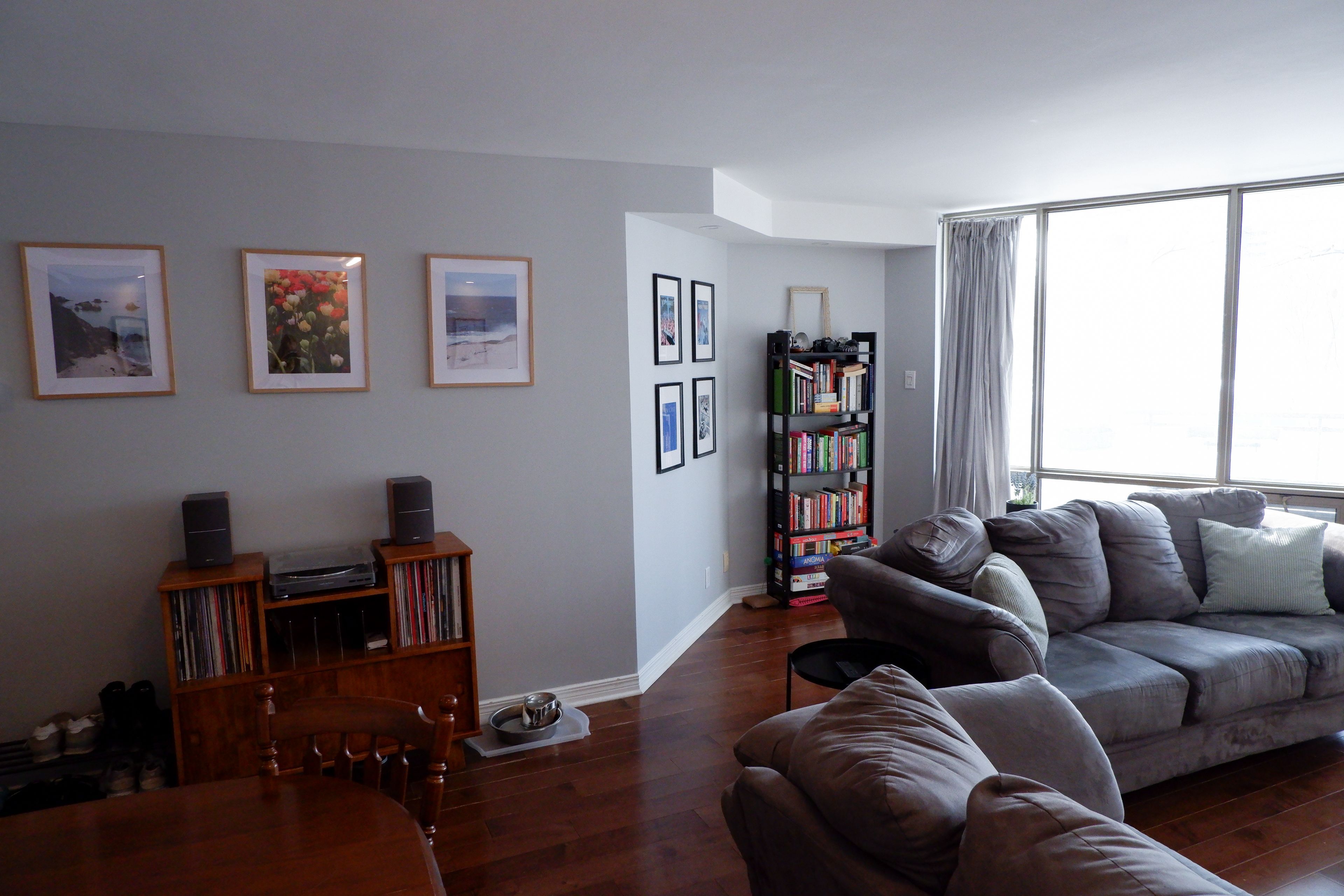 • Sun-filled open concept living and dining area with balcony access.