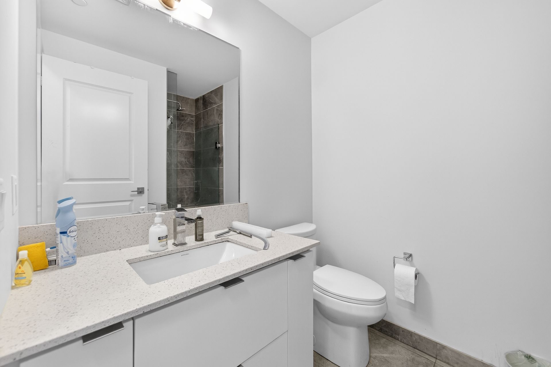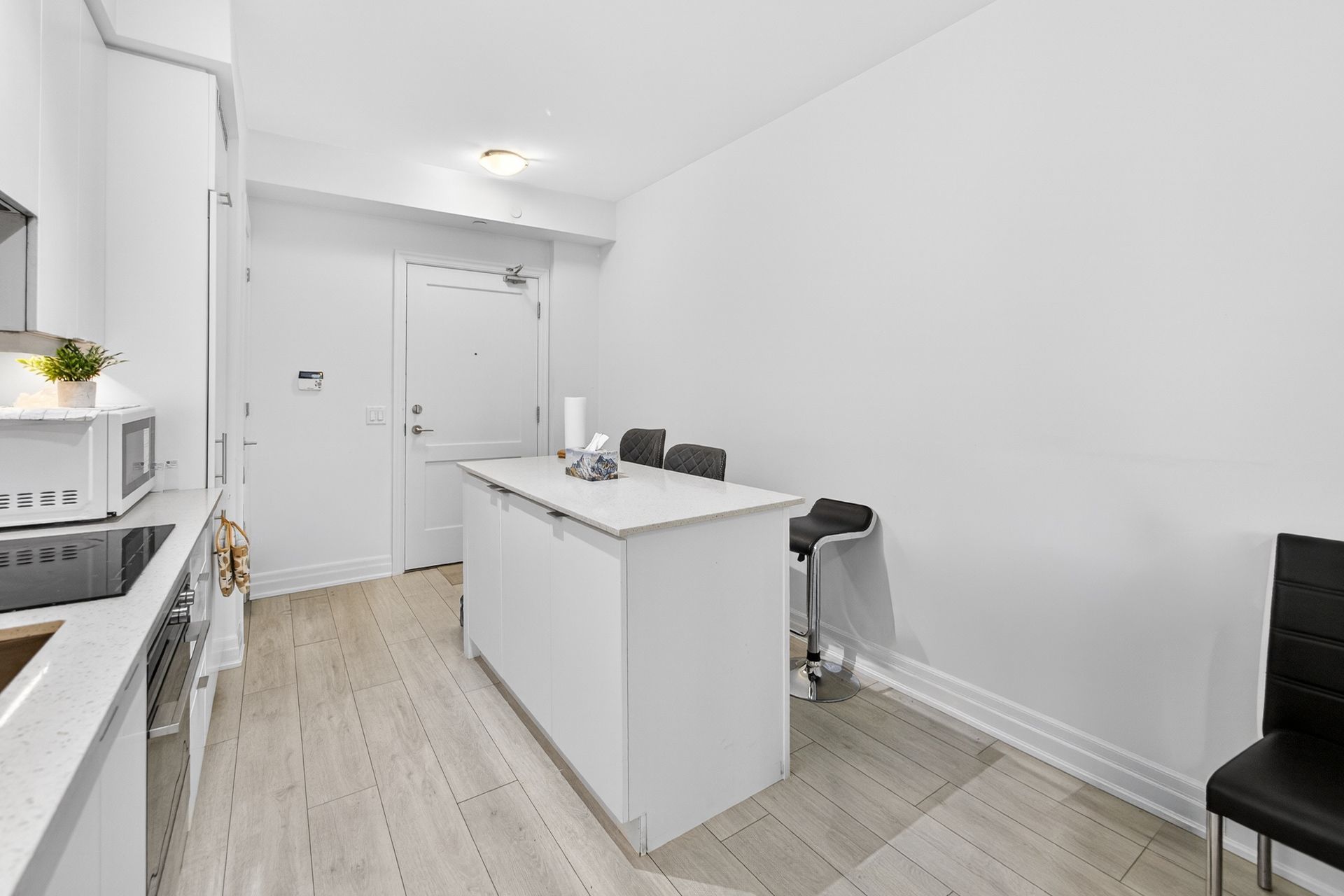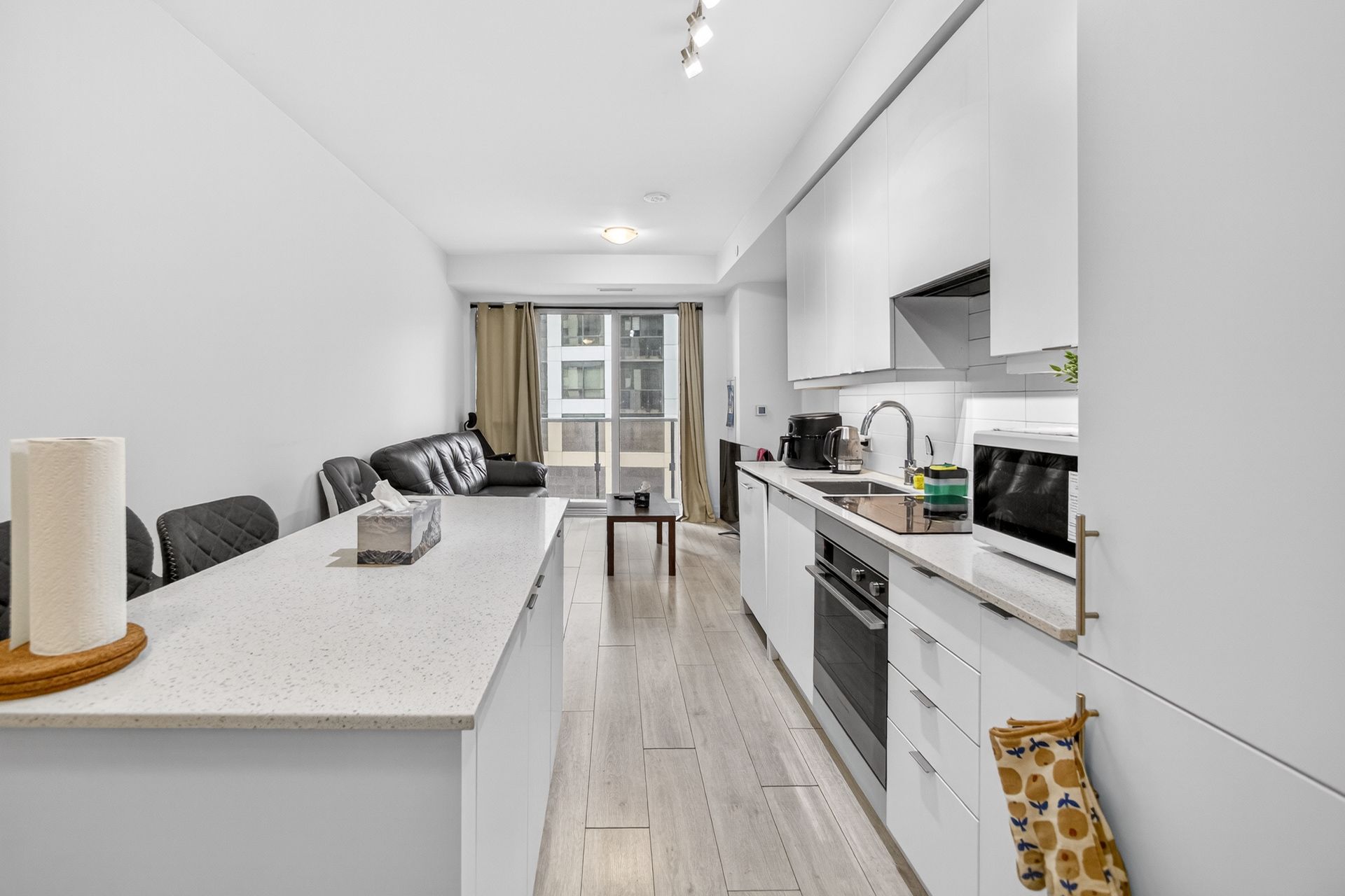 • Open-concept layout with stylish kitchen and quartz countertops.