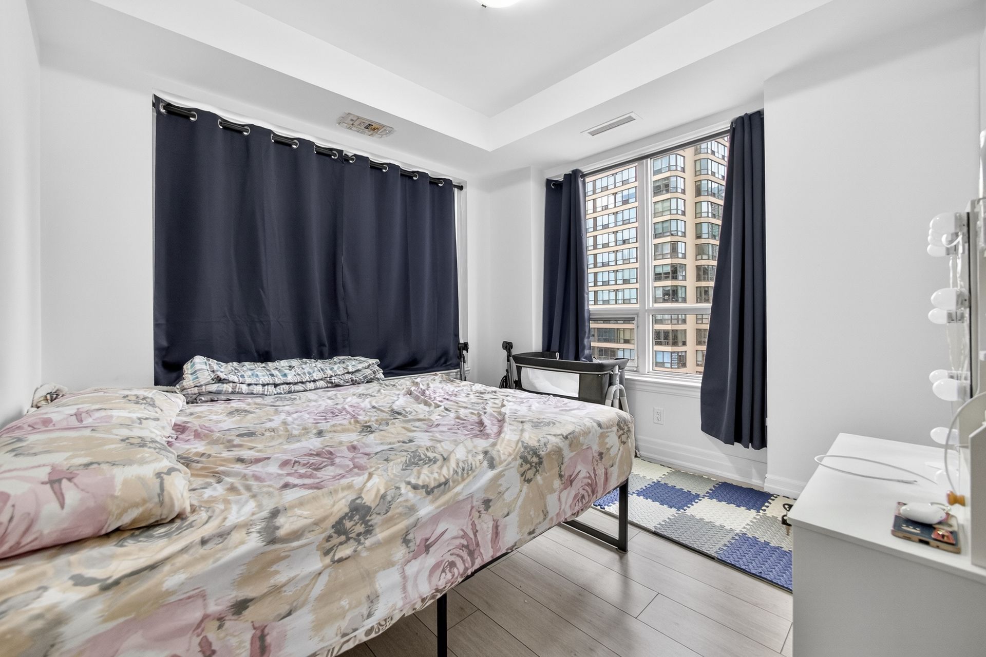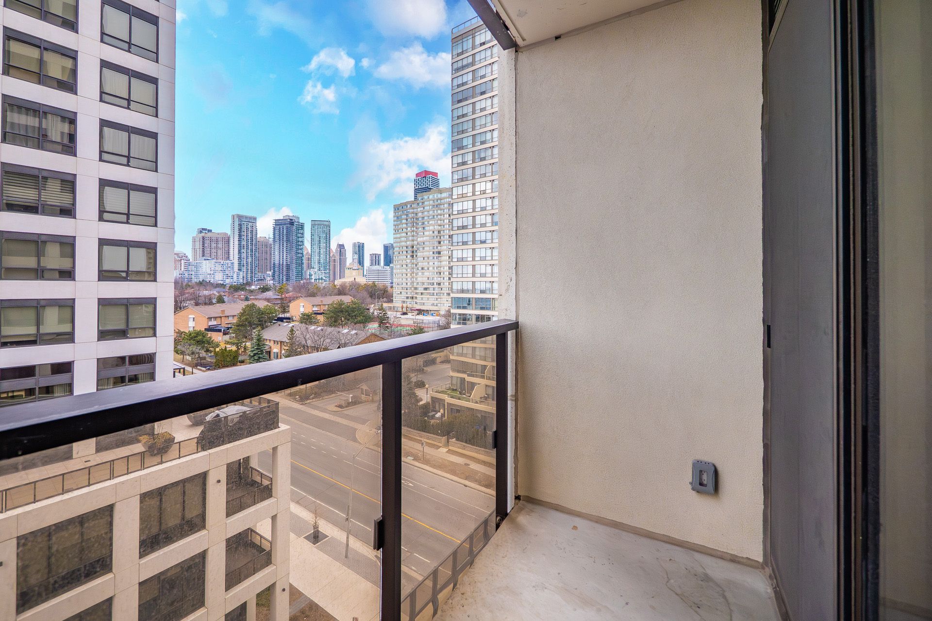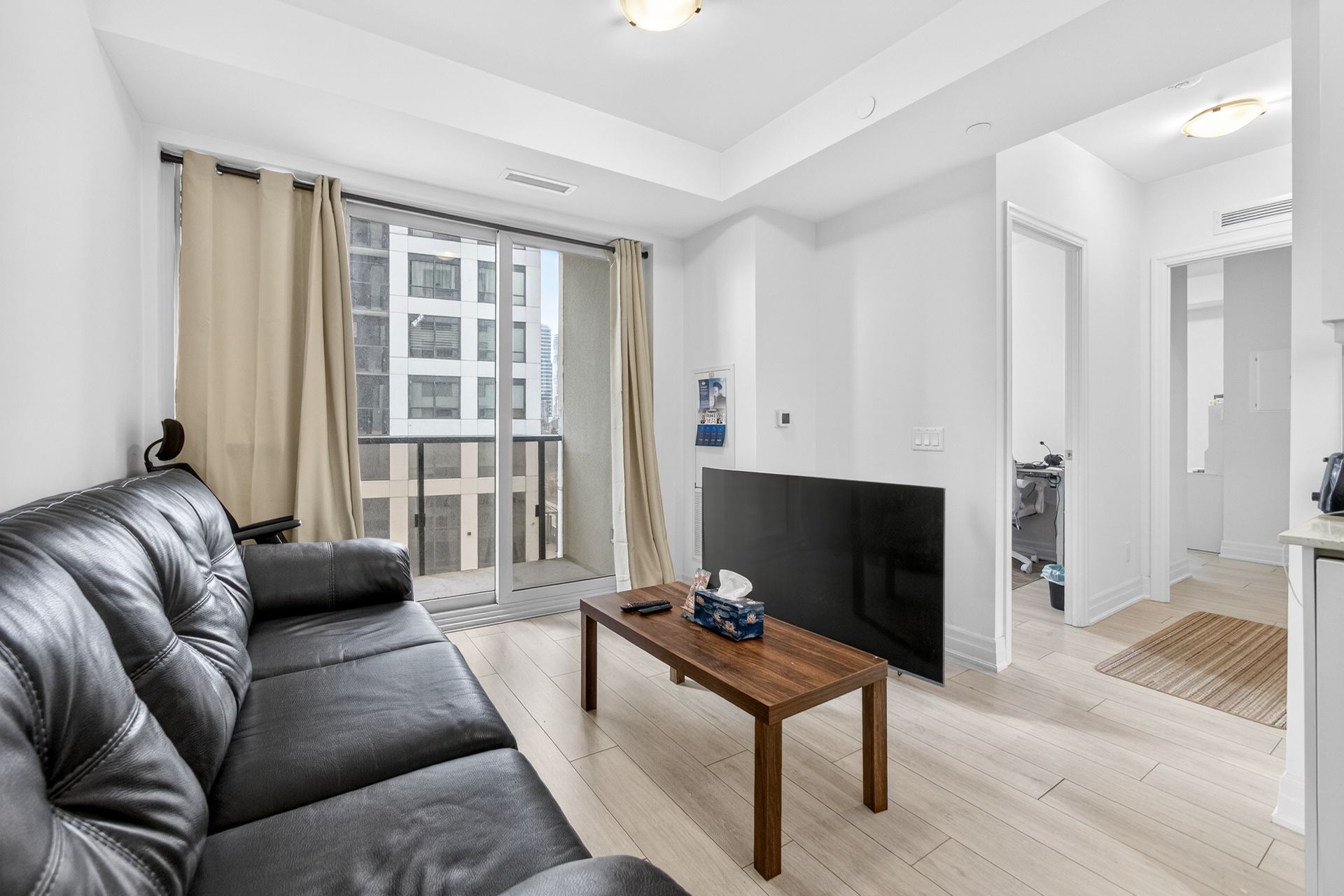 • Private balcony with city views accessible from living area and second bedroom.