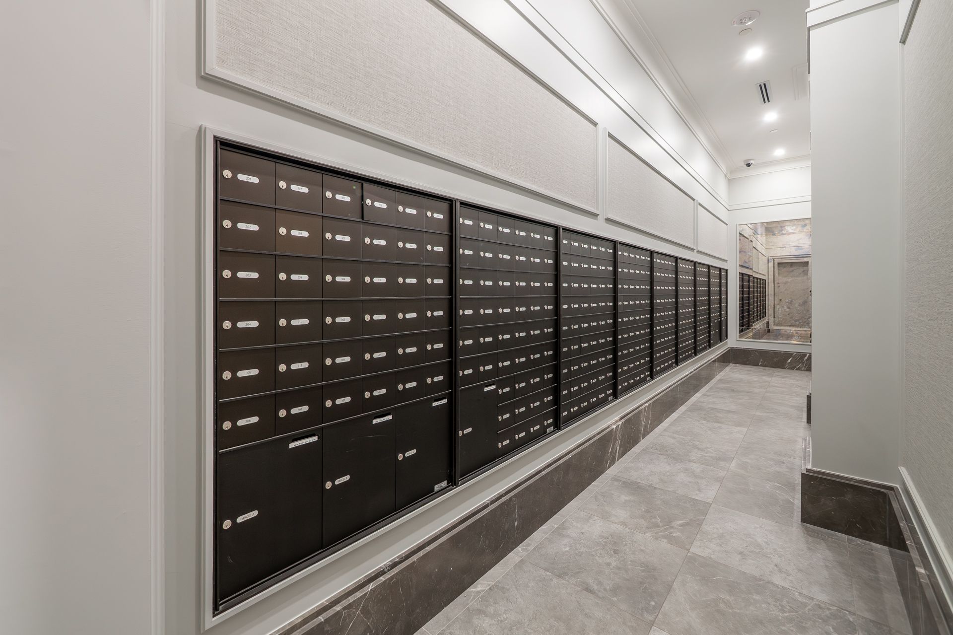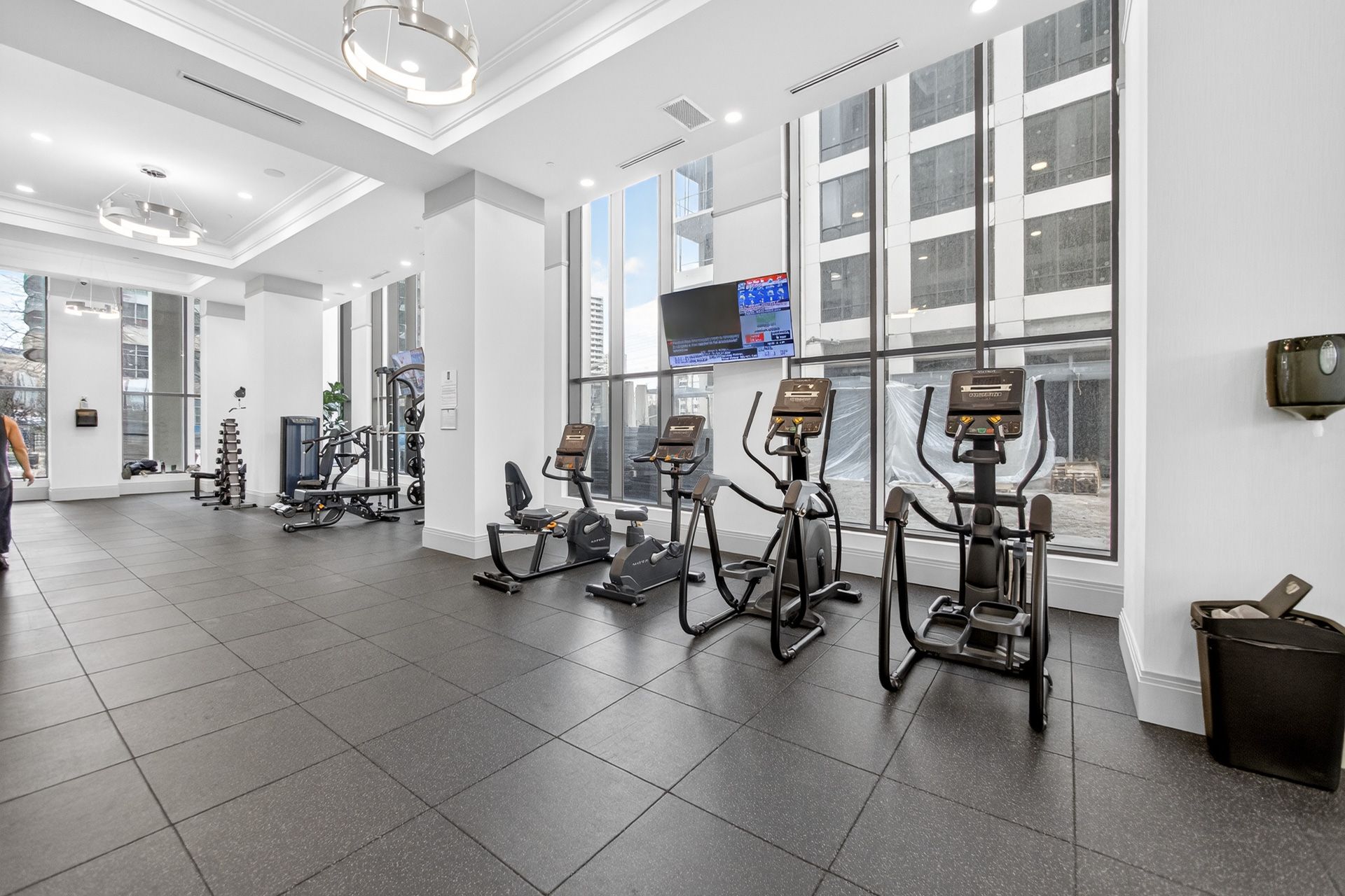 • Building amenities include gym, media room, and business center.