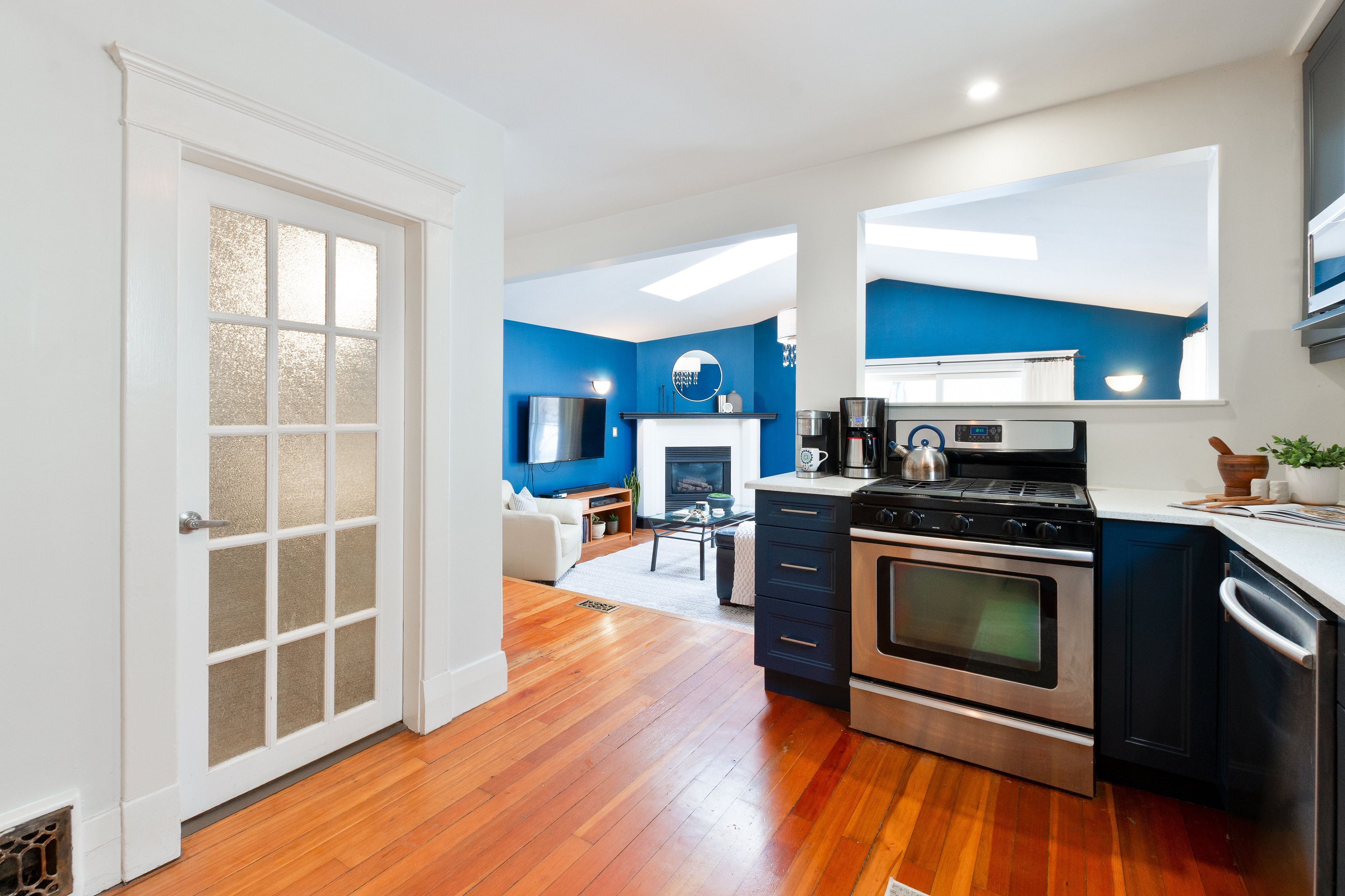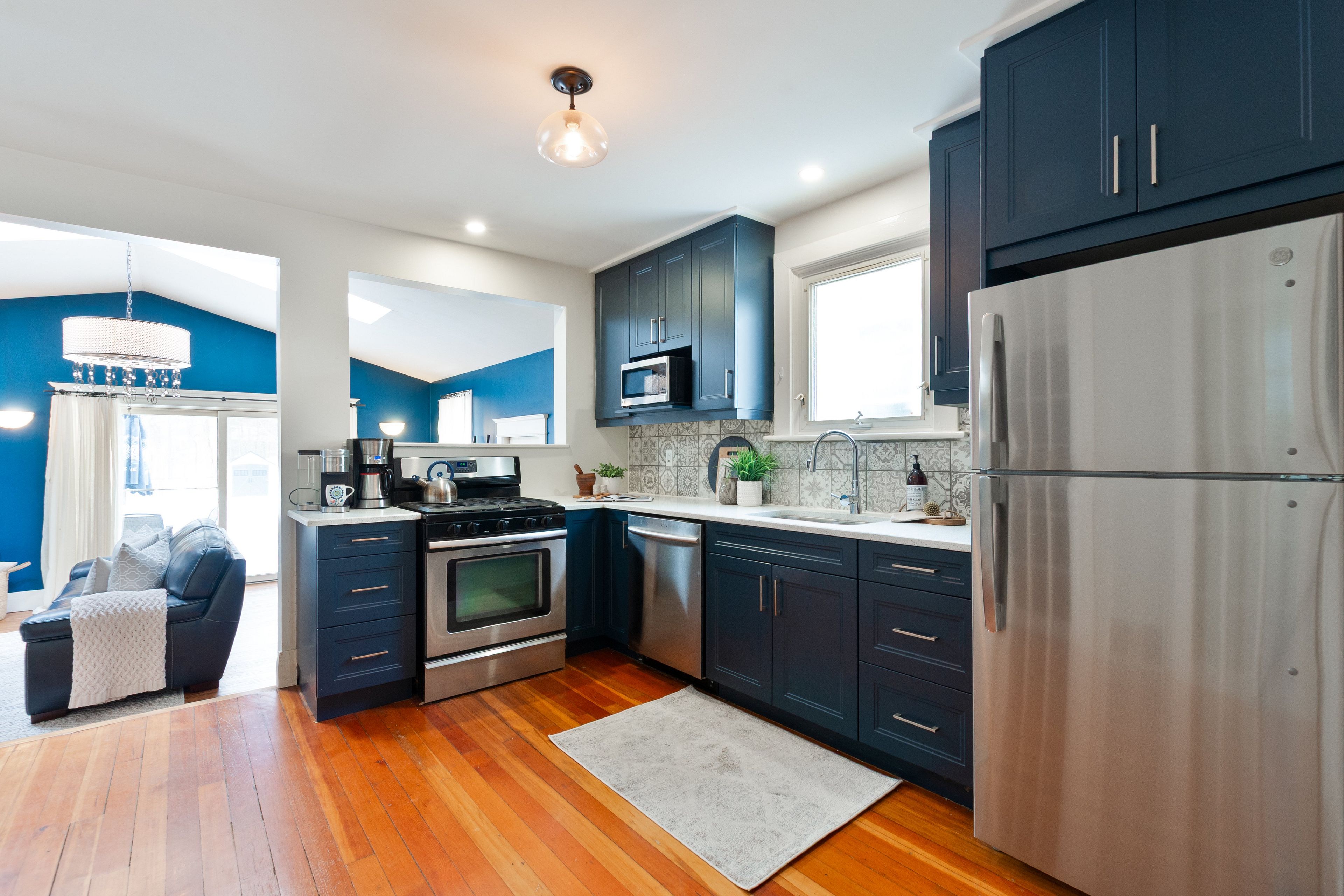 • Three bedrooms and an open concept kitchen with stainless steel appliances.