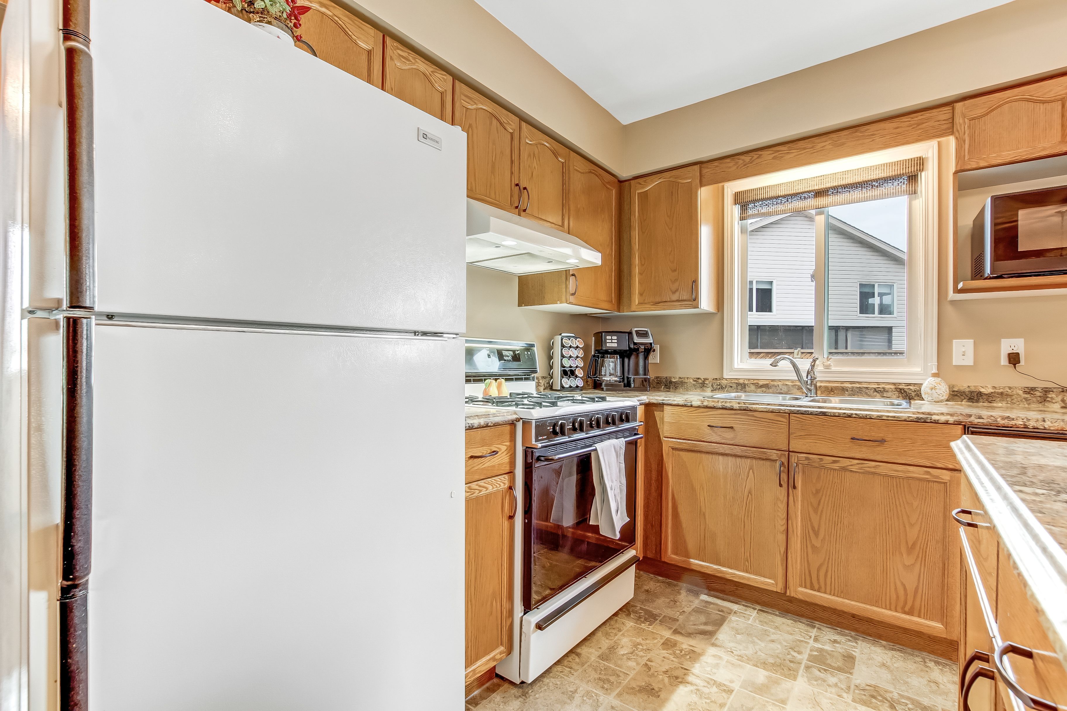 • Spacious kitchen with updated countertops and a center island for gatherings.