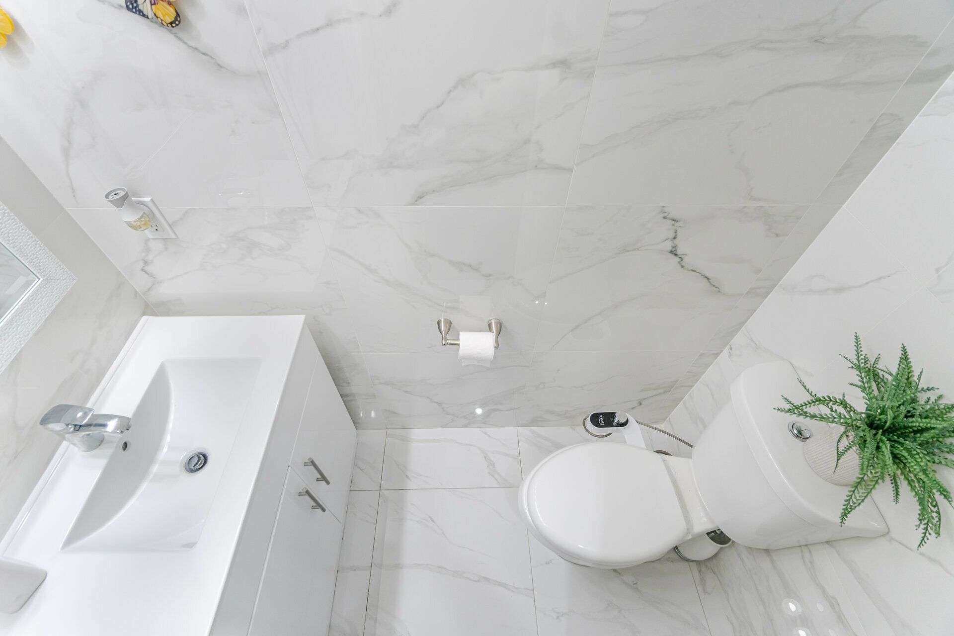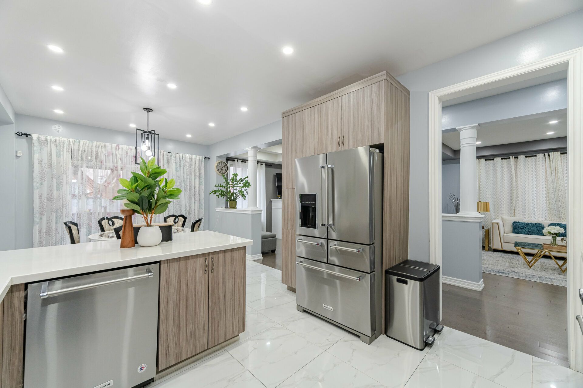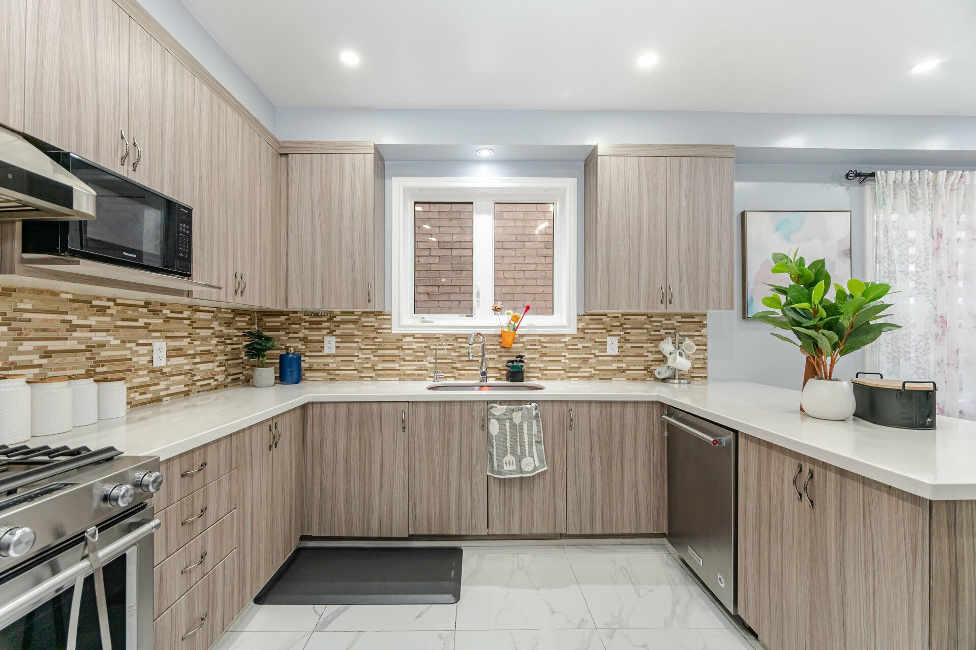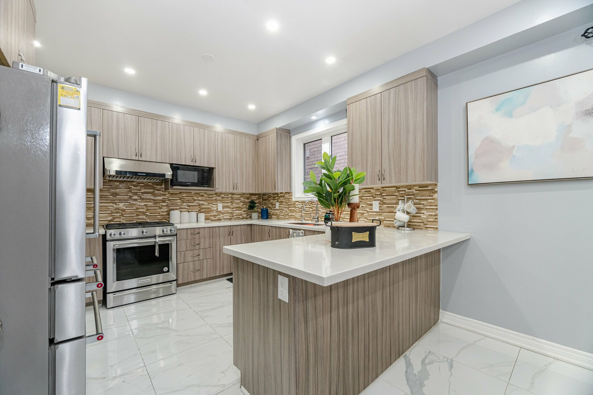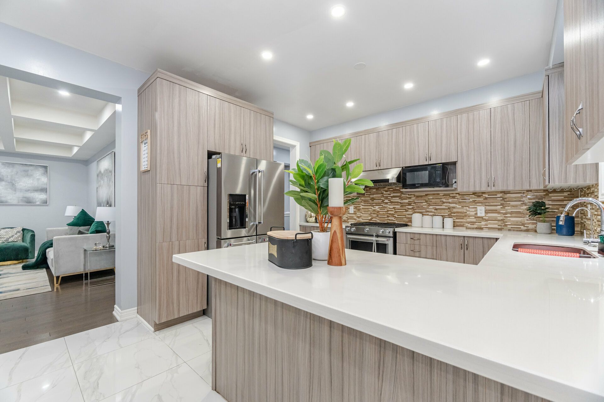 • Upgraded porcelain tiles and quartz countertops in the kitchen.