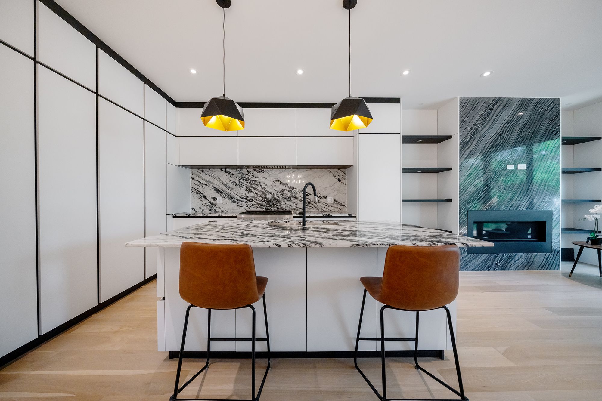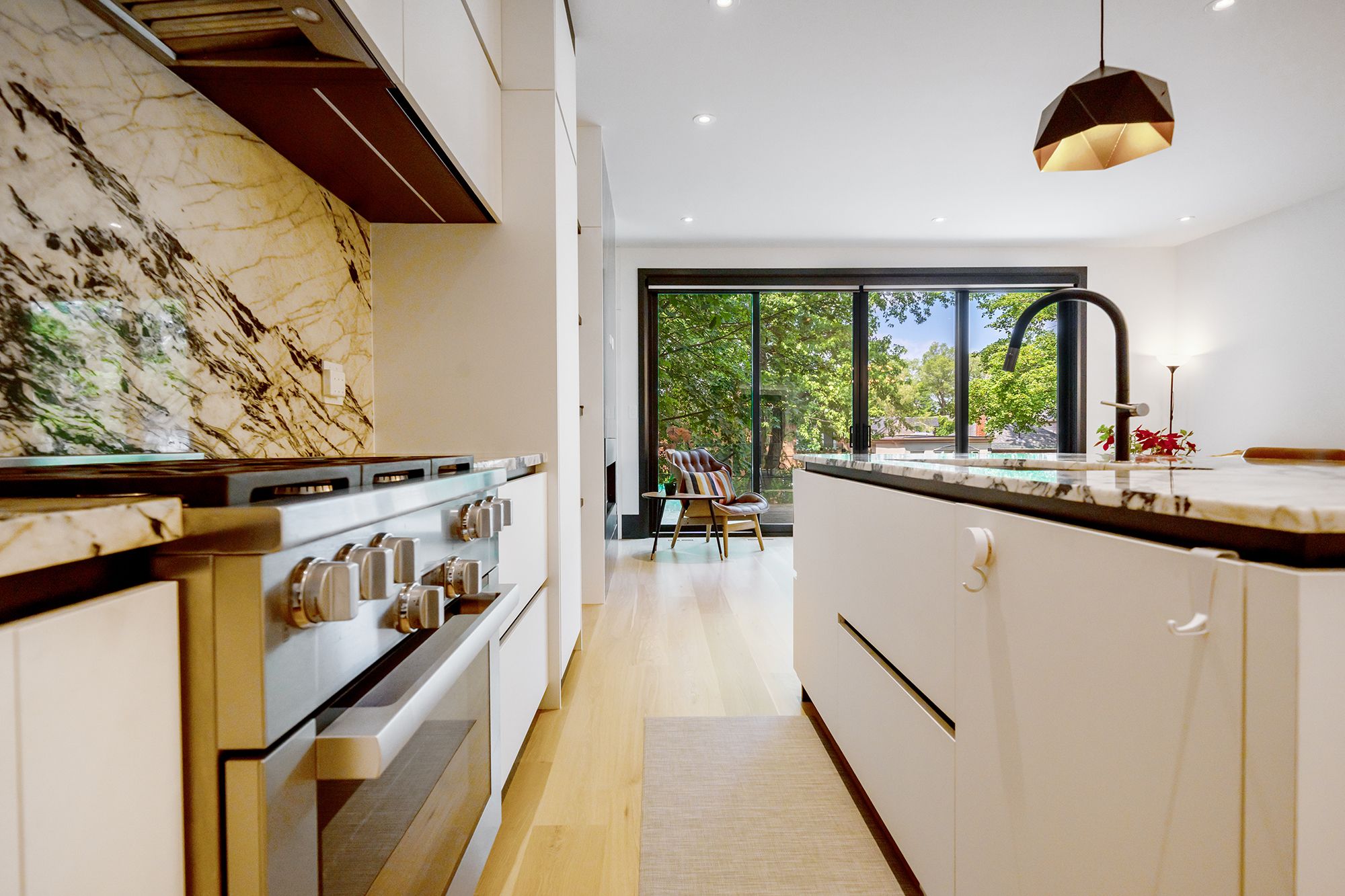 • Italian eat-in kitchen featuring integrated appliances and quartzite counters.