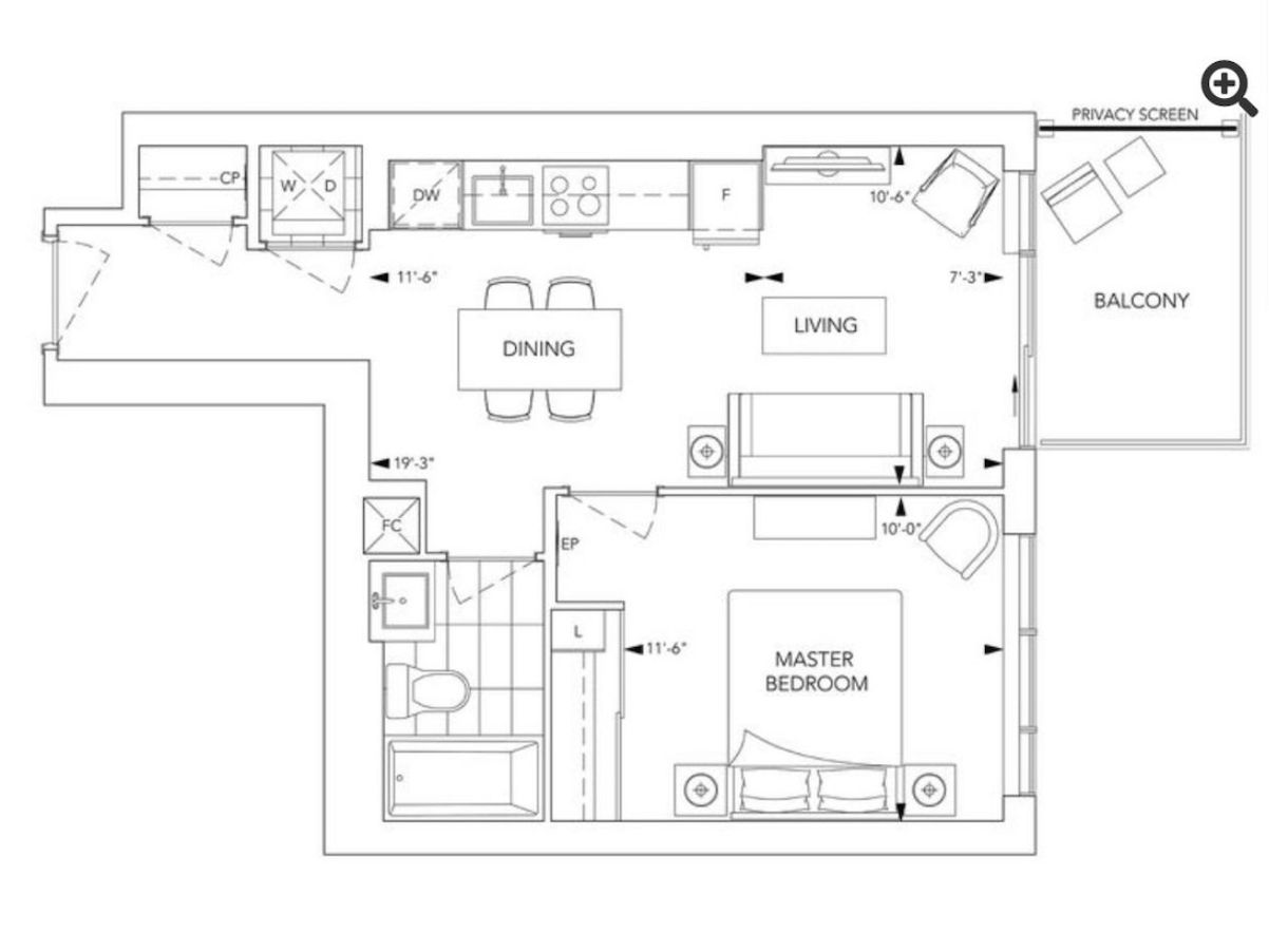 • Luxury 1-bedroom condo with open living space and high ceilings.