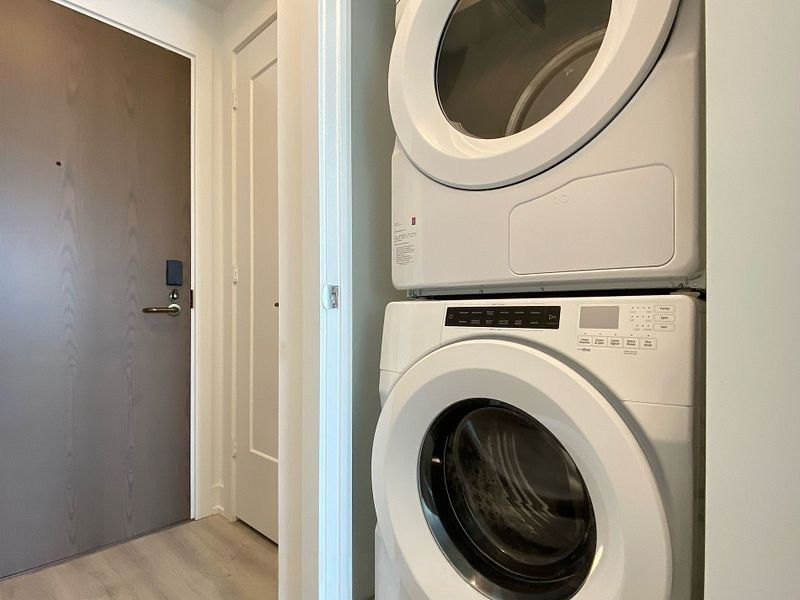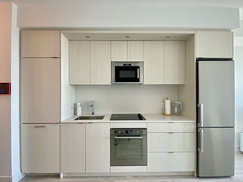 • Kitchen features modern integrated appliances and custom closet organizer.