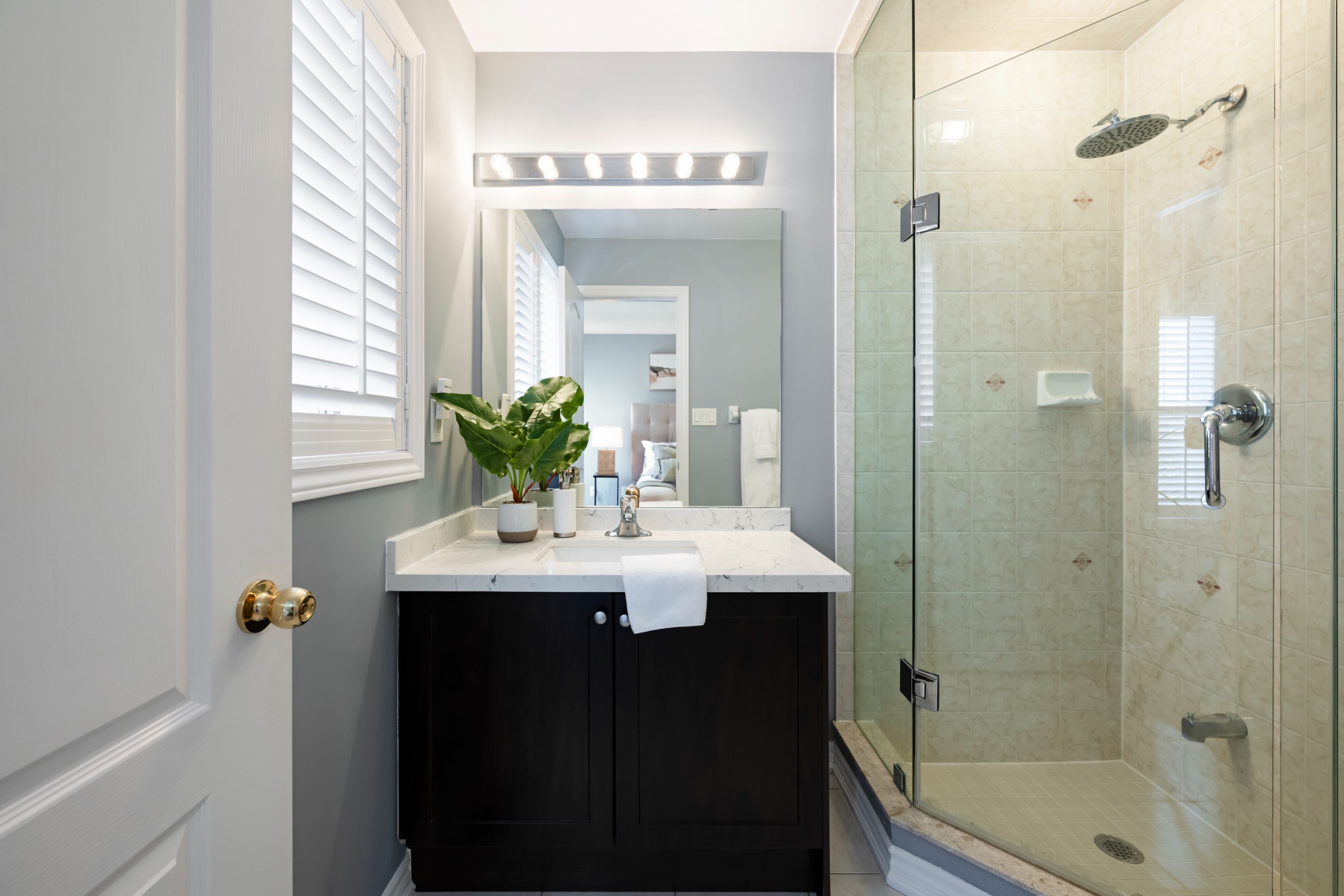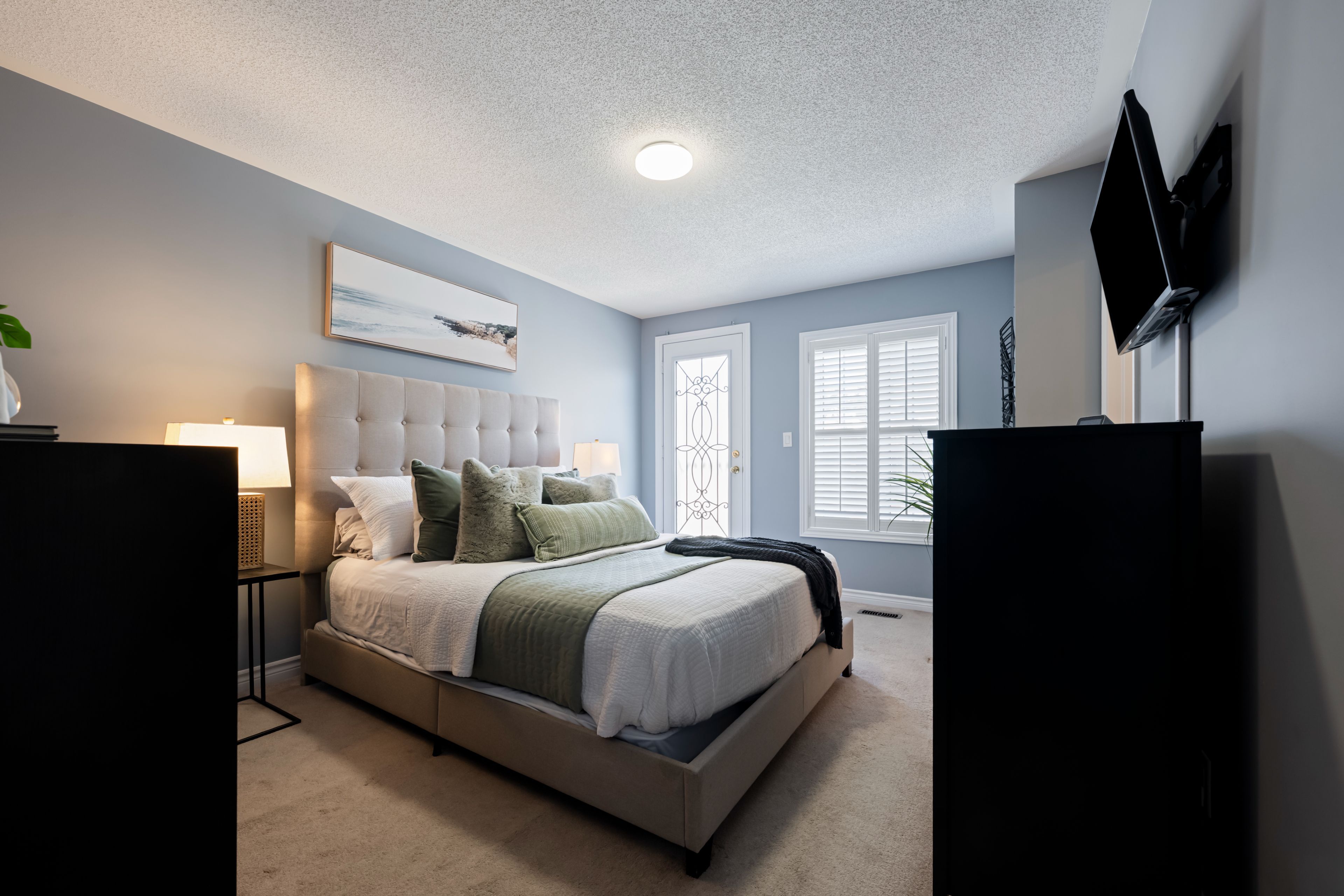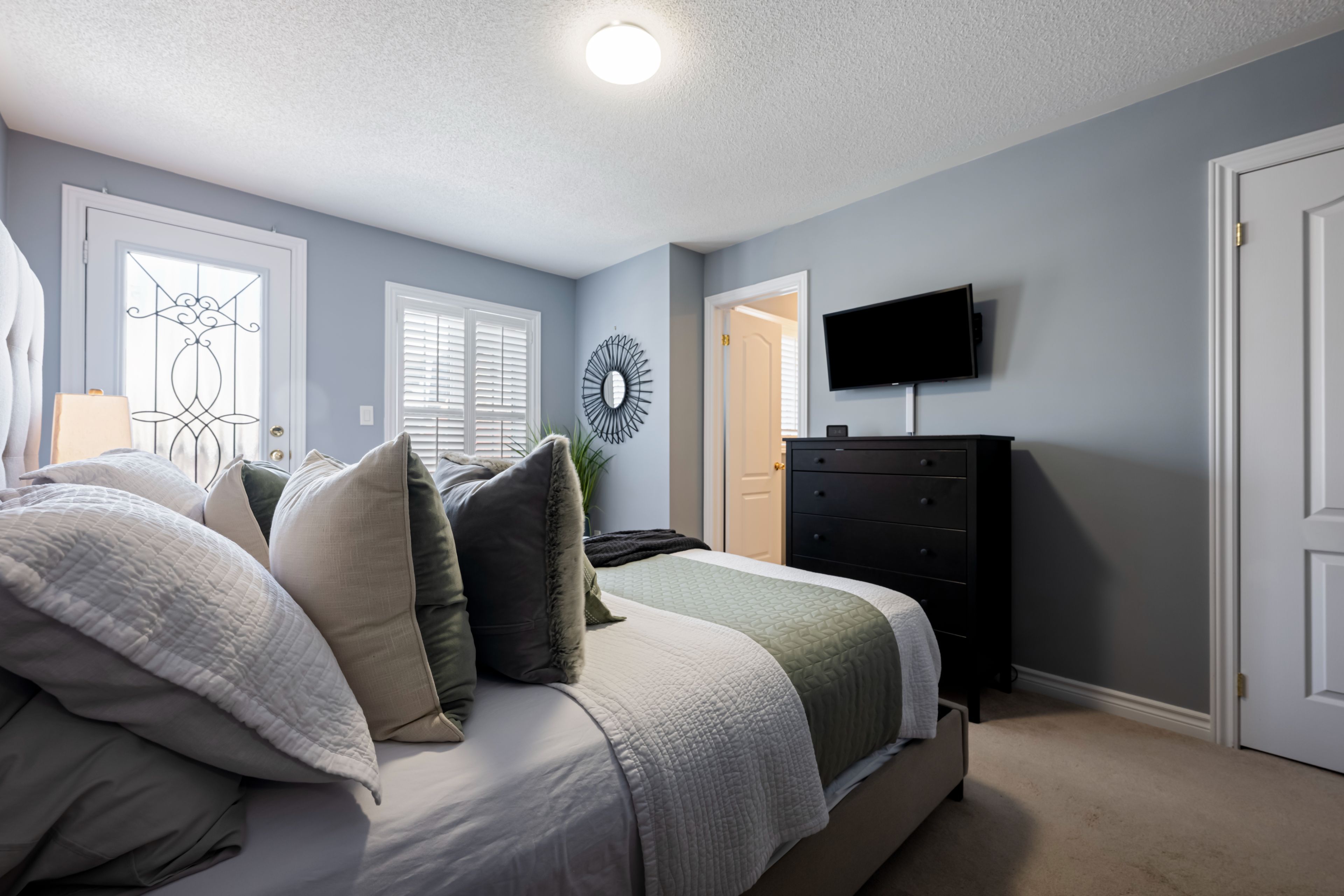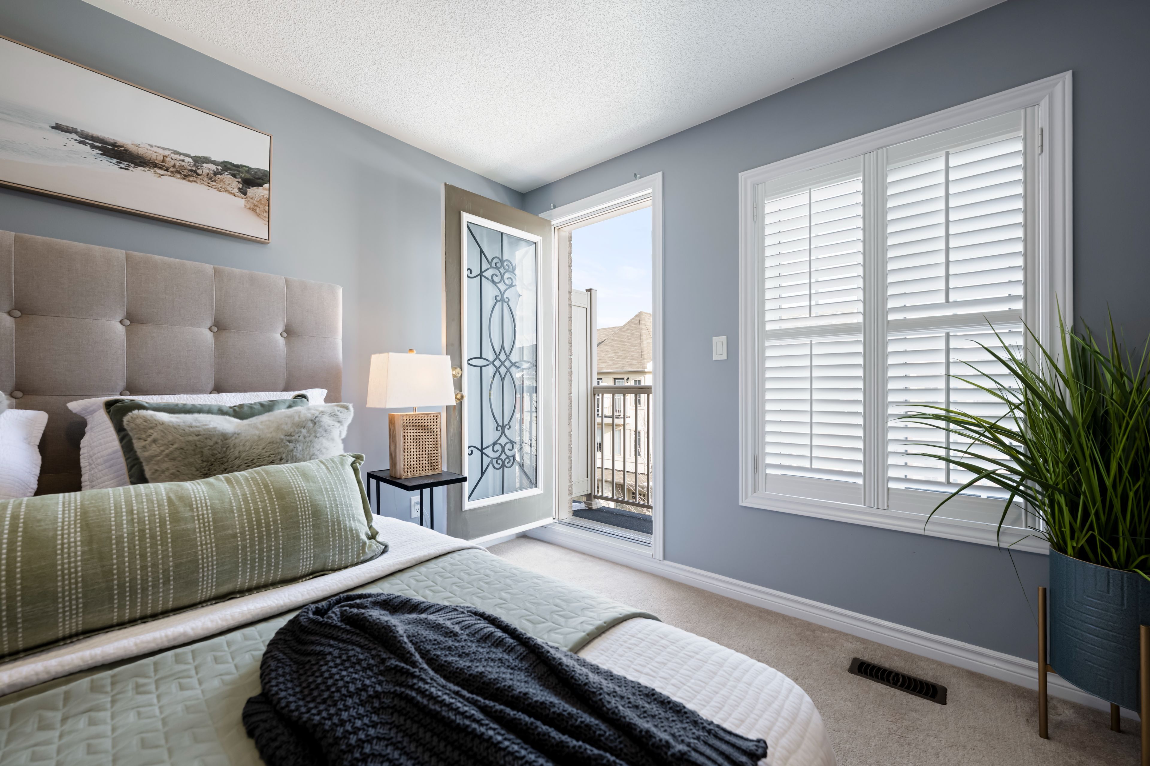 • Bright primary bedroom features a Juliet balcony and ensuite with glass shower.