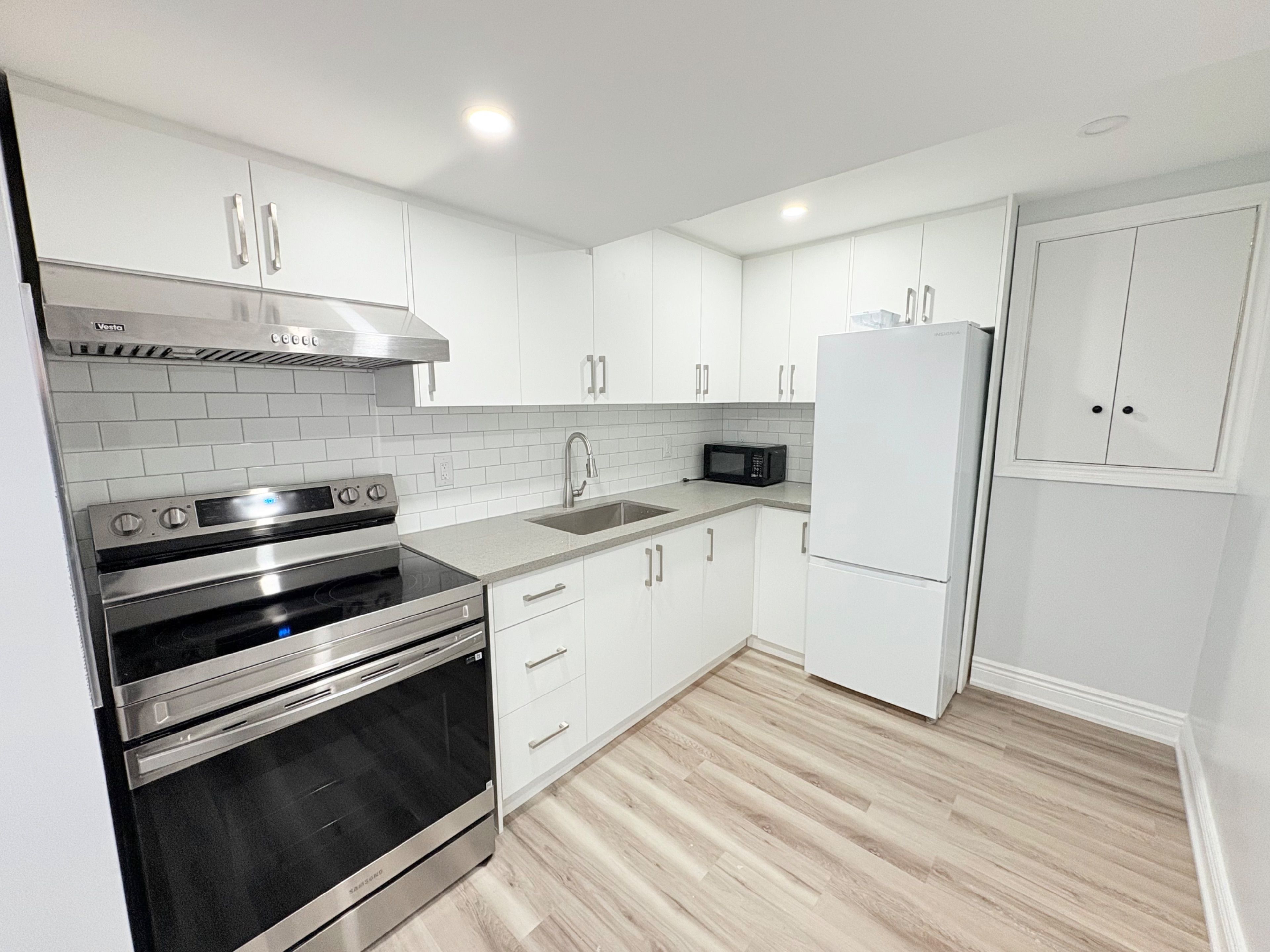 • Modern kitchen features new quartz countertops and smooth ceilings.