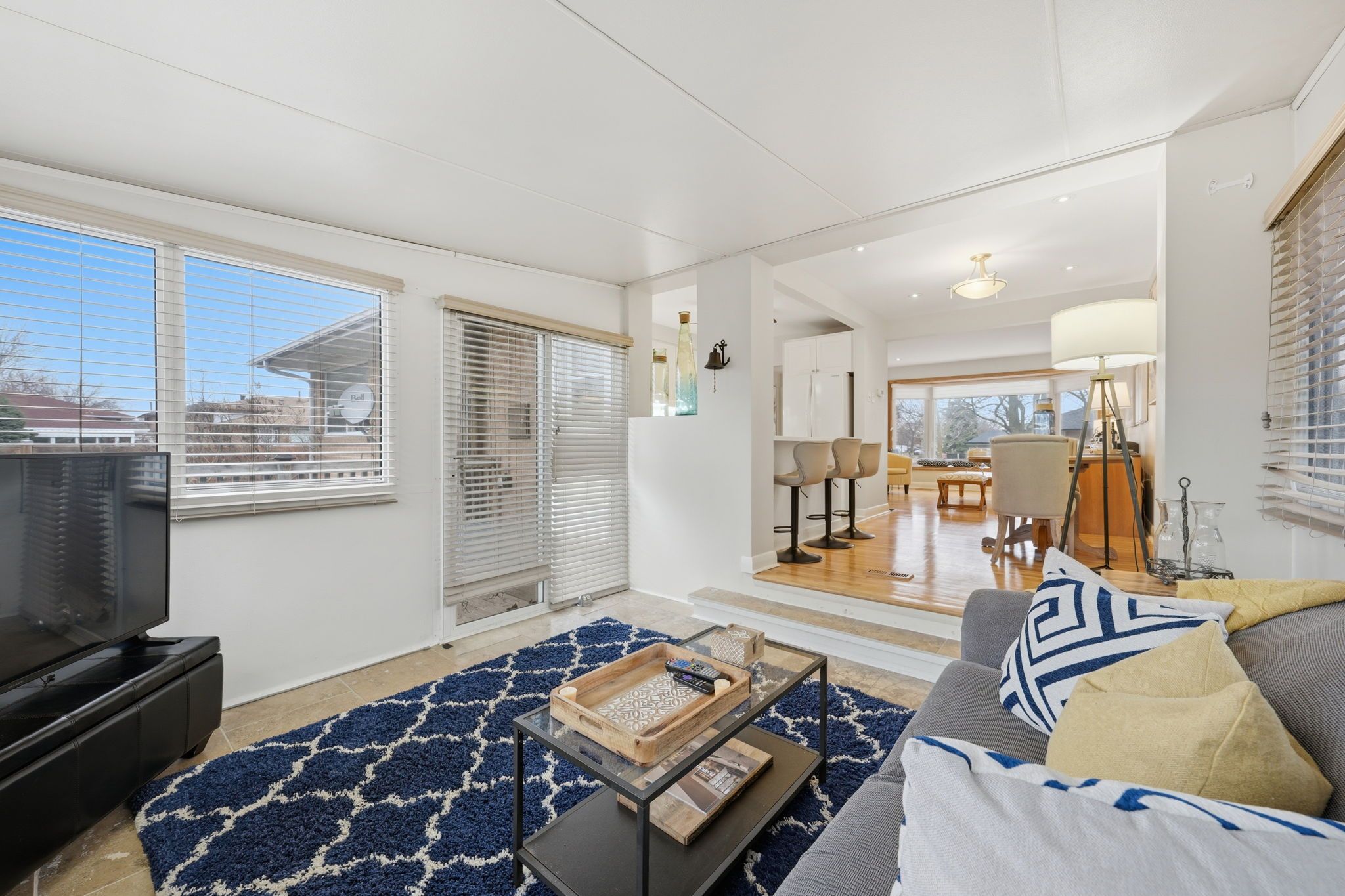 • Bright open living space with a gas fireplace and access to the deck.