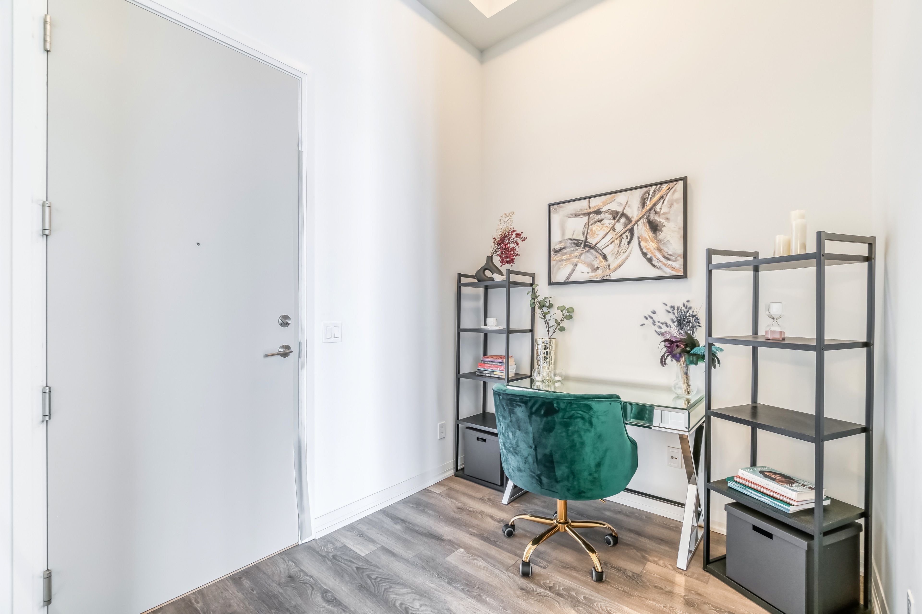 Live in the elegant lower penthouse at me living condos. This executive suite is available fully furnished or unfurnished, and offers unobstructed west-facing views of the cn tower and stunning sunsets through floor-to-ceiling windows and soaring 14-foot ceilings. A perfectly designed one-bedroom plus den with an ideal work-from-home space, private four-piece ensuite, and a separate powder room for guests. Enjoy nearly new, thoughtfully selected furniture-just move in and enjoy. Conveniently located close to public transit, highway 401, shopping, centennial college, u of t scarborough campus, and an outdoor skating rink. Amenities include gym, pool, rooftop deck, concierge, bbq area, bicycle parking, guest suites, hot tub, media and cinema rooms, meeting and function rooms, outdoor patio and garden, and 24-hour security.