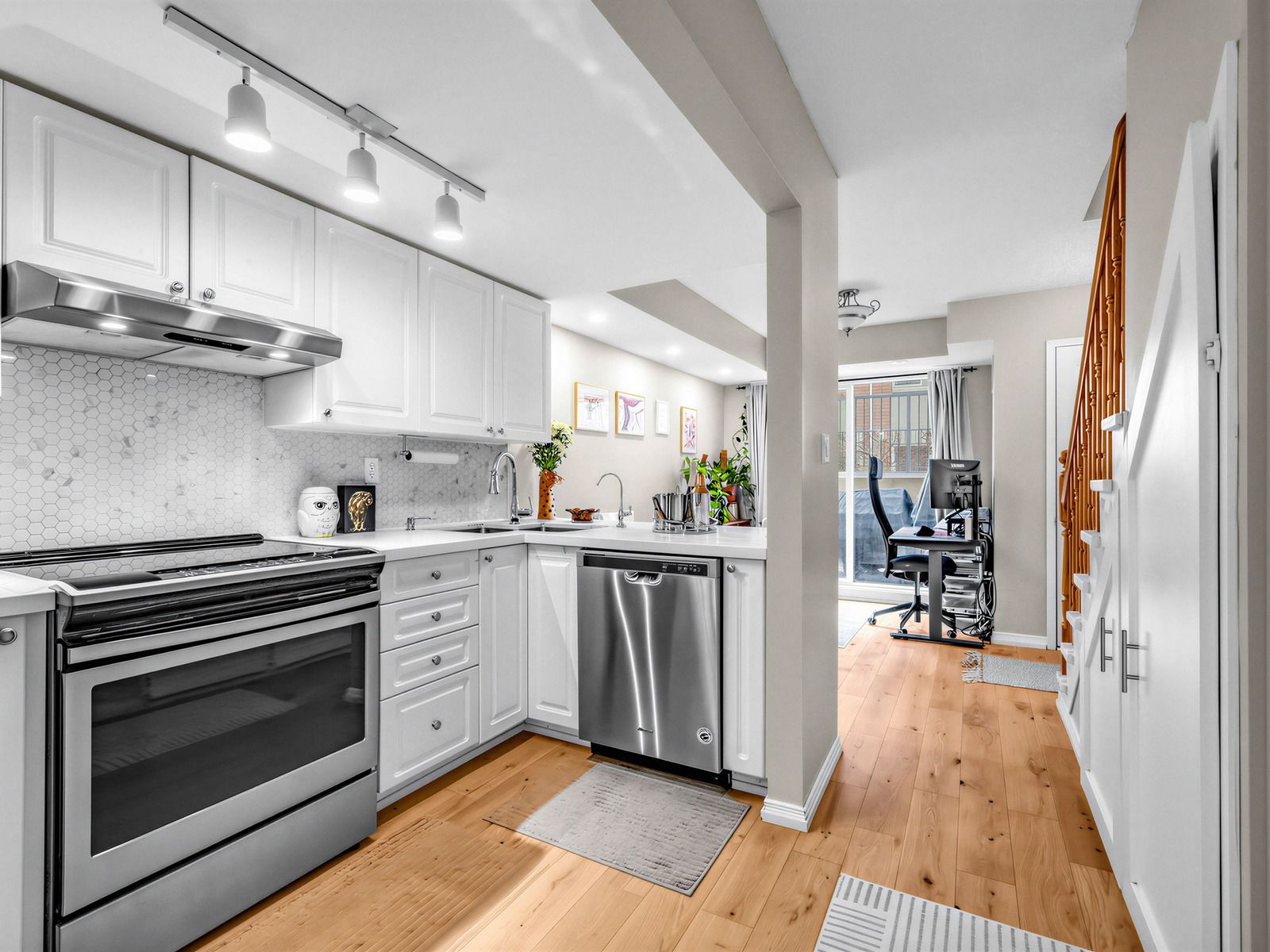 Absolutely gorgeous 2-storey townhouse in the sought-after junction triangle. The main level features a bright living room, kitchen with breakfast bar, dining area with walk-out to a private terrace, and a convenient powder room. The second floor offers 2 spacious bedrooms, each with walk-in closets, a full bathroom, laundry on the 2nd floor. Recent upgrades include new engineered hardwood flooring throughout, new washer & dryer, and a new stair runner. Ideally situated in toronto's vibrant west end, steps to parks, cafes, restaurants, and shops. Enjoy easy access to dundas west station and the up express for a quick downtown commute. Located in a quiet, family-friendly community with excellent nearby schools, plus a private on-site dog park and playground.