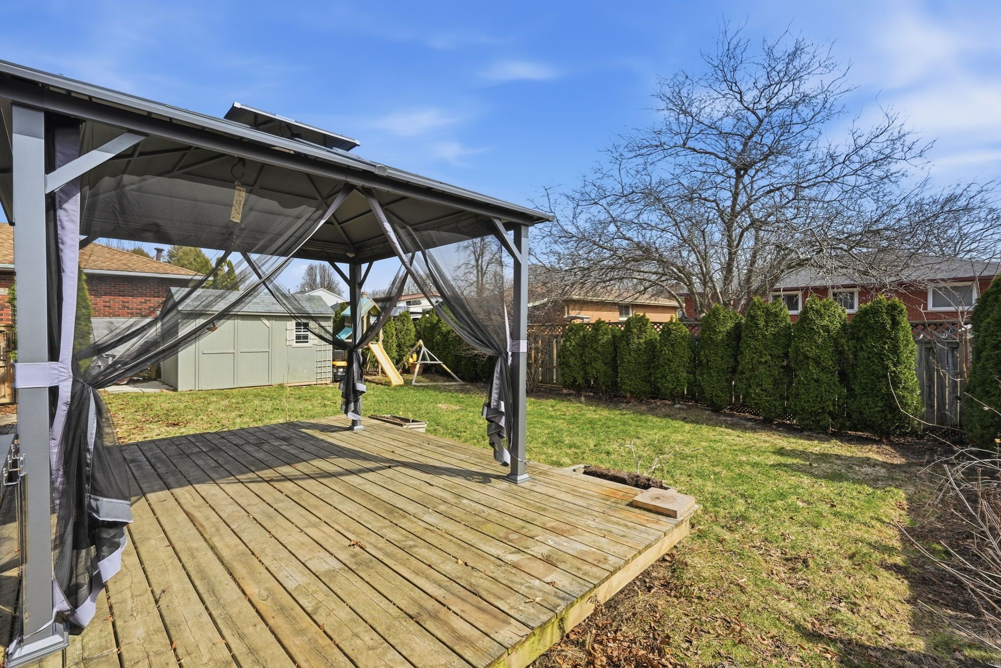 • Sunny private backyard featuring a deck, gazebo, and storage shed.
