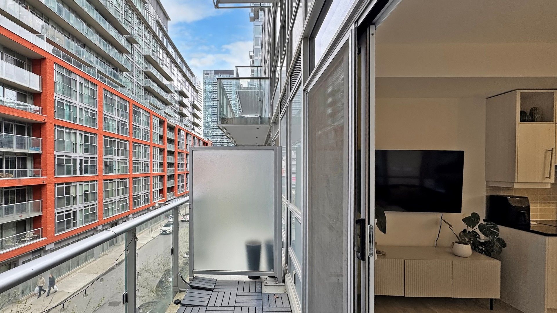 Welcome to this bright and modern 1 bed + den corner suite at the highly sought-after studio 2 condos in the heart of downtown toronto. With 694 sq ft of wide, functional living space, this layout is rare and thoughtfully designed. Enjoy 2 private balconies, floor-to-ceiling windows, and an abundance of natural light throughout. Upgraded with new paint, custom lighting, and integrated appliances, this unit is move-in ready. The den is ideal for a home office or guest space. The kitchen features quartz countertops, sleek cabinetry, and a built-in cooktop for a seamless finish. Located right next to the stairs, you'll love the convenience of avoiding elevator wait times-perfect for busy urban living. Comes with 1 locker and underground parking. Situated in the heart of the entertainment and financial districts, with a walk score of 99 and transit score of 100. Steps to ttc, the path, queen st., king west, dining, shops, and more. Building amenities include 24-hr concierge, gym, sauna, party room, outdoor terrace, guest suites & more.