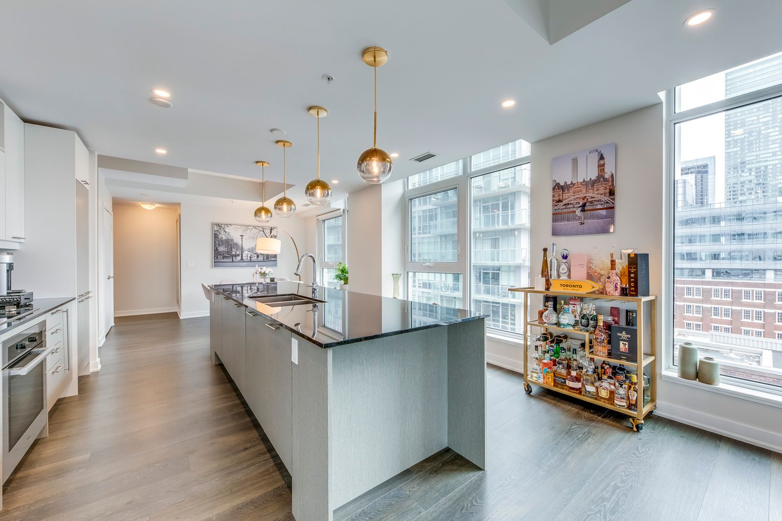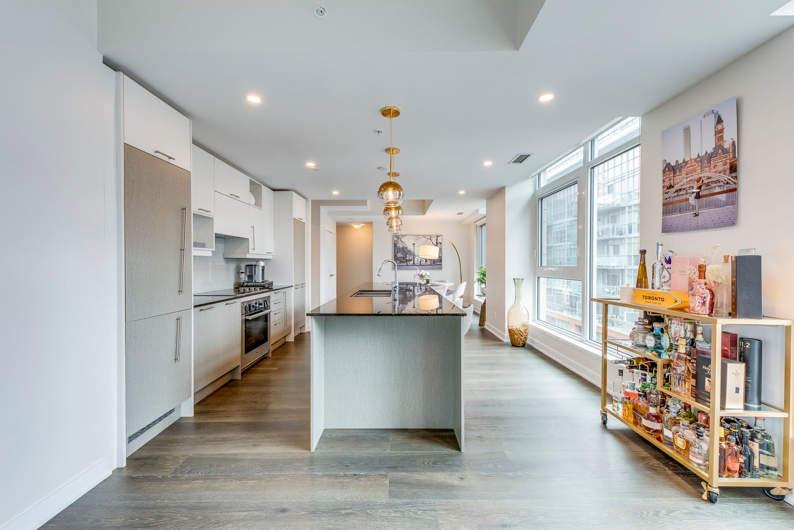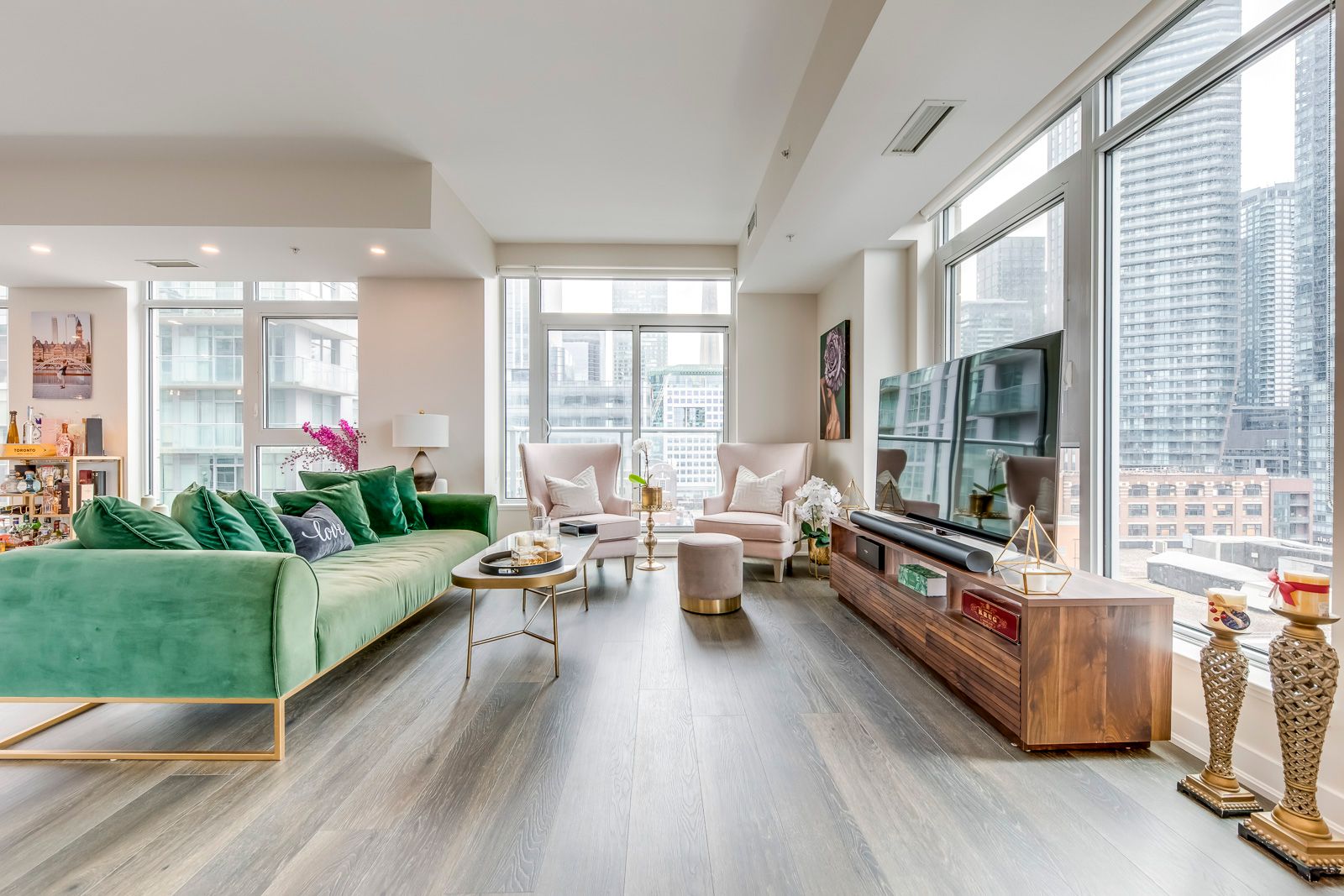 Welcome to suite 807 at 30 nelson street, a rare and beautifully scaled corner residence offering sophisticated downtown living, sun-filled southwest exposure, and an enviable address in the heart of toronto's entertainment district. Offering approximately 1,357 square feet of refined interior space, this 2-bedroom, 2-bathroom suite combines scale, natural light, and sophisticated city living. Thoughtfully designed with an open-concept layout, the home features a large chef-inspired kitchen anchored by an impressive island ideal for casual dining, elegant entertaining, and everyday living. With southwest exposure, floor-to-ceiling light, and two private balconies, the suite captures the energy of the city while offering a bright and elevated retreat above it all. A coveted corner-unit layout enhances both privacy and flow, while parking and locker add everyday convenience. Set within studio 2, a sought-after luxury condominium residence, this address places you moments from tiff lightbox, roy thomson hall, the cn tower, ripley's aquarium, the ago, fine dining, premier shopping, and the financial district. Residents also benefit from exceptional connectivity to the ttc, union station, go transit, and up express, with seamless access to toronto's major highways. Building amenities include concierge service, a rooftop terrace with bbqs, fitness facilities, sauna, guest suites, entertaining spaces, and more, creating a complete downtown lifestyle experience. A rare opportunity to lease or own a generous, design-forward residence in one of toronto's most vibrant and internationally recognized neighbourhoods.