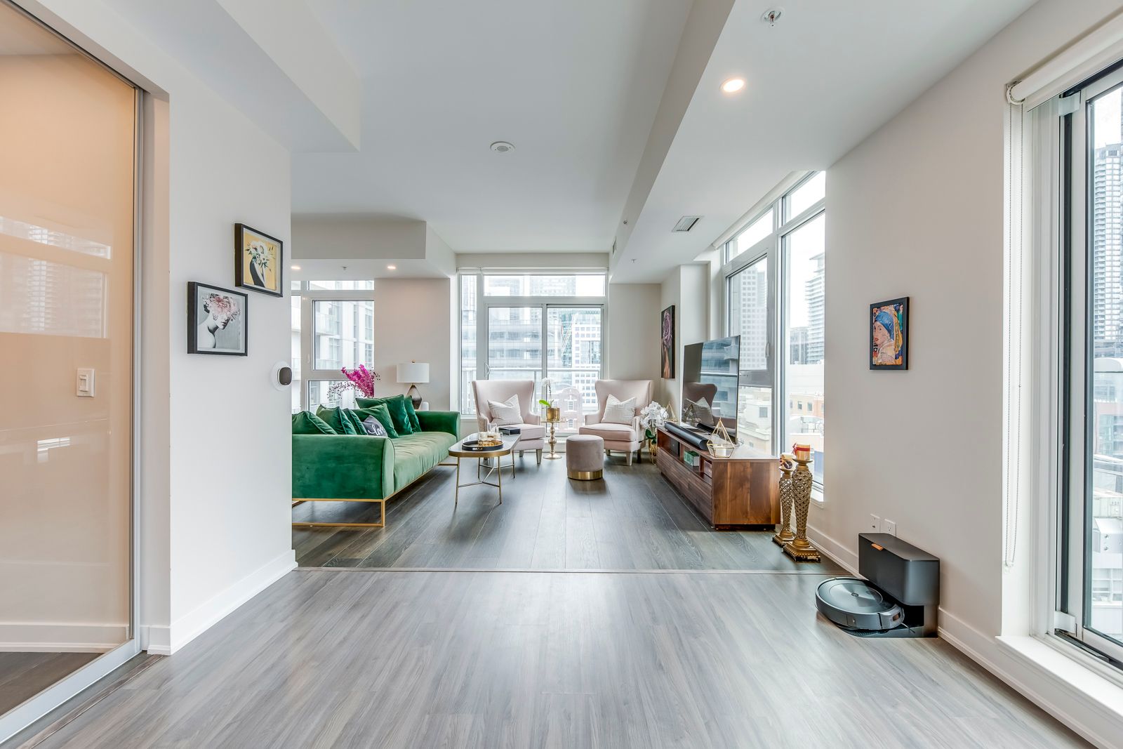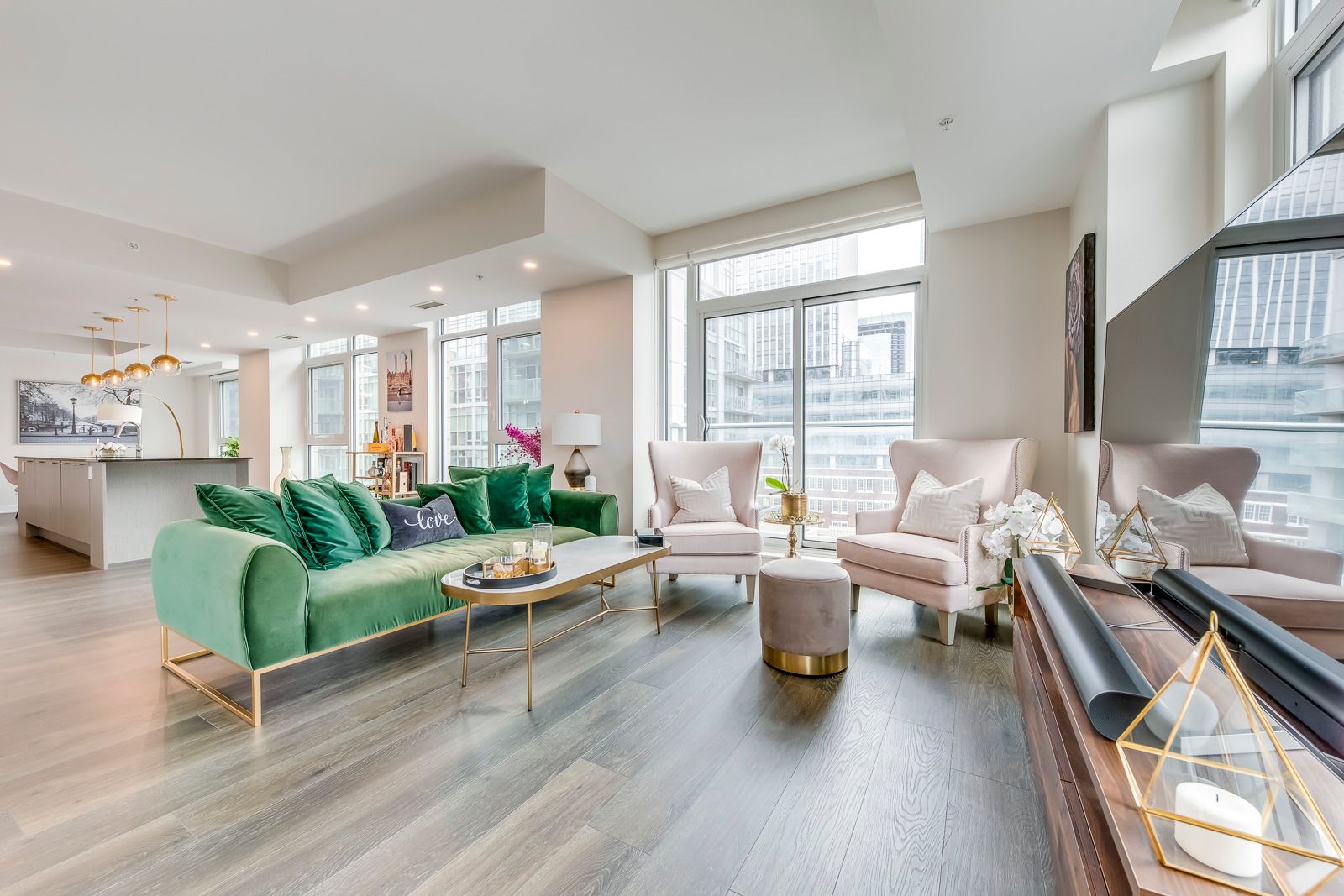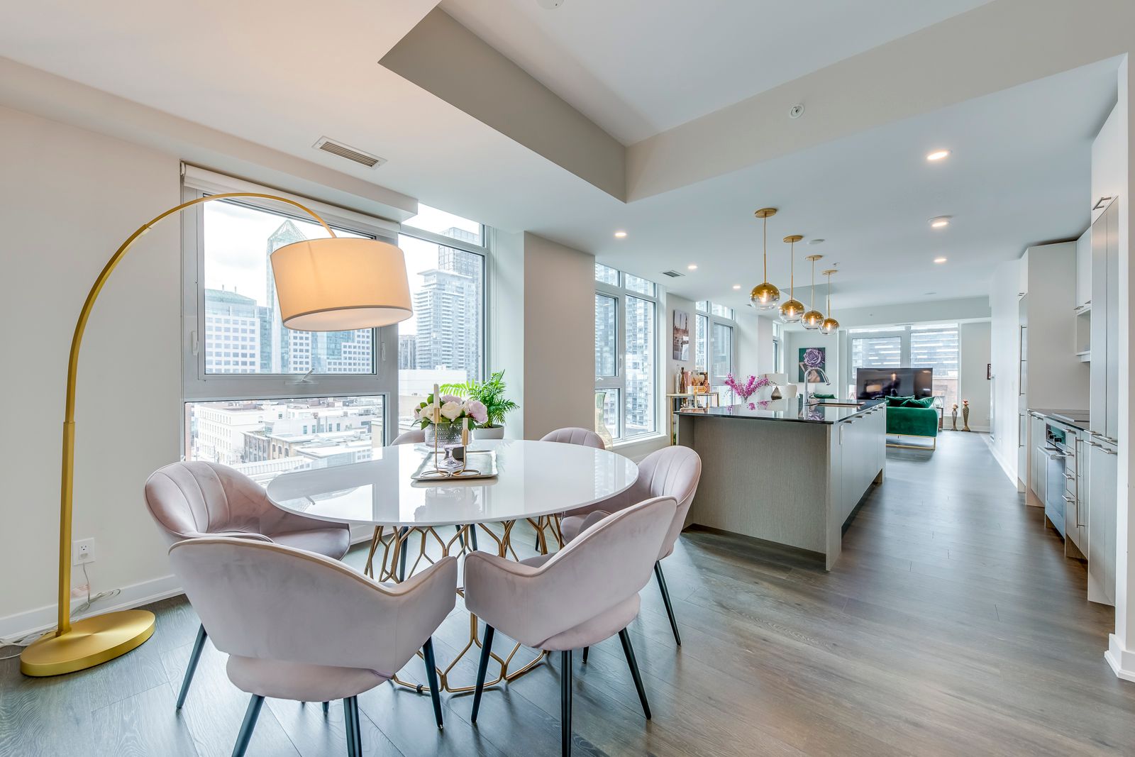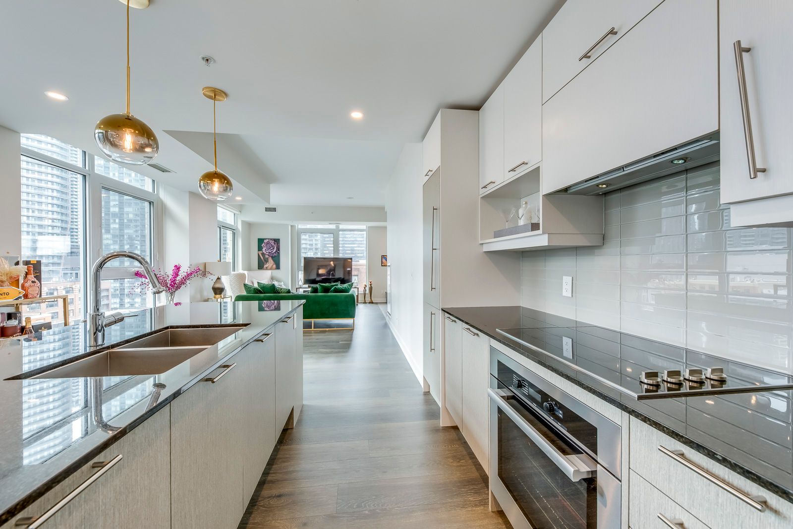 Welcome to suite 807 at 30 nelson street, a rare and beautifully scaled corner residence offering sophisticated downtown living, sun-filled southwest exposure, and an enviable address in the heart of toronto's entertainment district. Offering approximately 1,357 square feet of refined interior space, this 2-bedroom, 2-bathroom suite combines scale, natural light, and sophisticated city living. Thoughtfully designed with an open-concept layout, the home features a large chef-inspired kitchen anchored by an impressive island ideal for casual dining, elegant entertaining, and everyday living. With southwest exposure, floor-to-ceiling light, and two private balconies, the suite captures the energy of the city while offering a bright and elevated retreat above it all. A coveted corner-unit layout enhances both privacy and flow, while parking and locker add everyday convenience. Set within studio 2, a sought-after luxury condominium residence, this address places you moments from tiff lightbox, roy thomson hall, the cn tower, ripley's aquarium, the ago, fine dining, premier shopping, and the financial district. Residents also benefit from exceptional connectivity to the ttc, union station, go transit, and up express, with seamless access to toronto's major highways. Building amenities include concierge service, a rooftop terrace with bbqs, fitness facilities, sauna, guest suites, entertaining spaces, and more, creating a complete downtown lifestyle experience. A rare opportunity to lease or own a generous, design-forward residence in one of toronto's most vibrant and internationally recognized neighbourhoods.