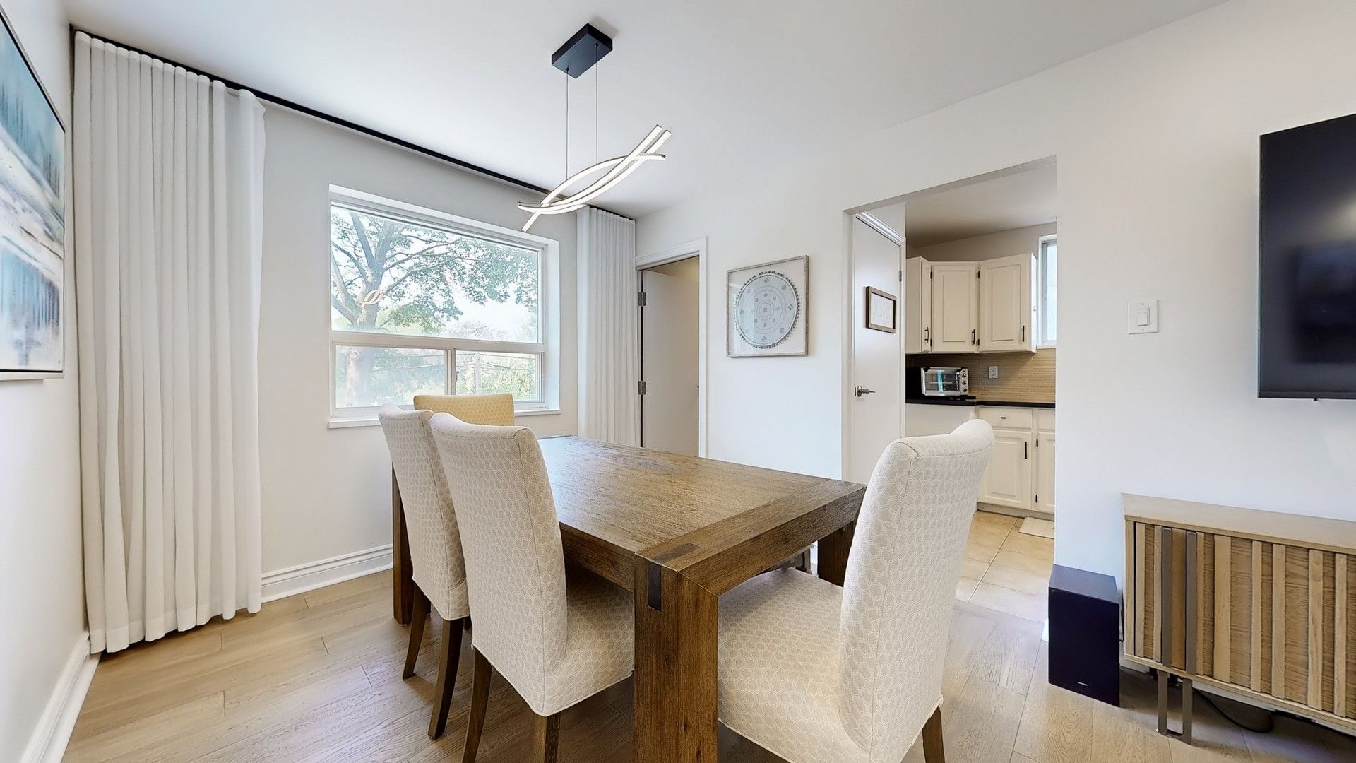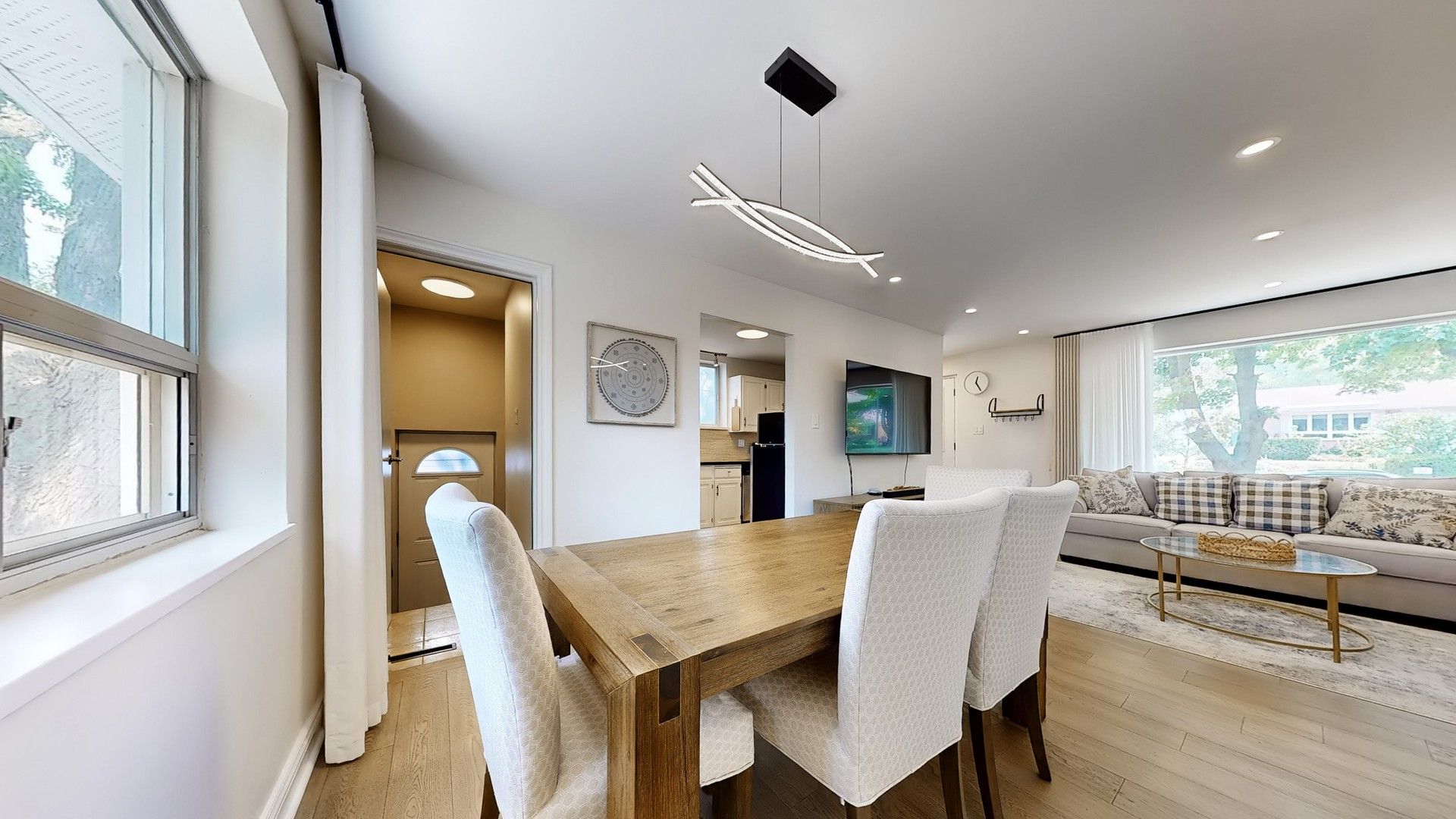 • Bright open-concept living and dining area with new hardwood floors.