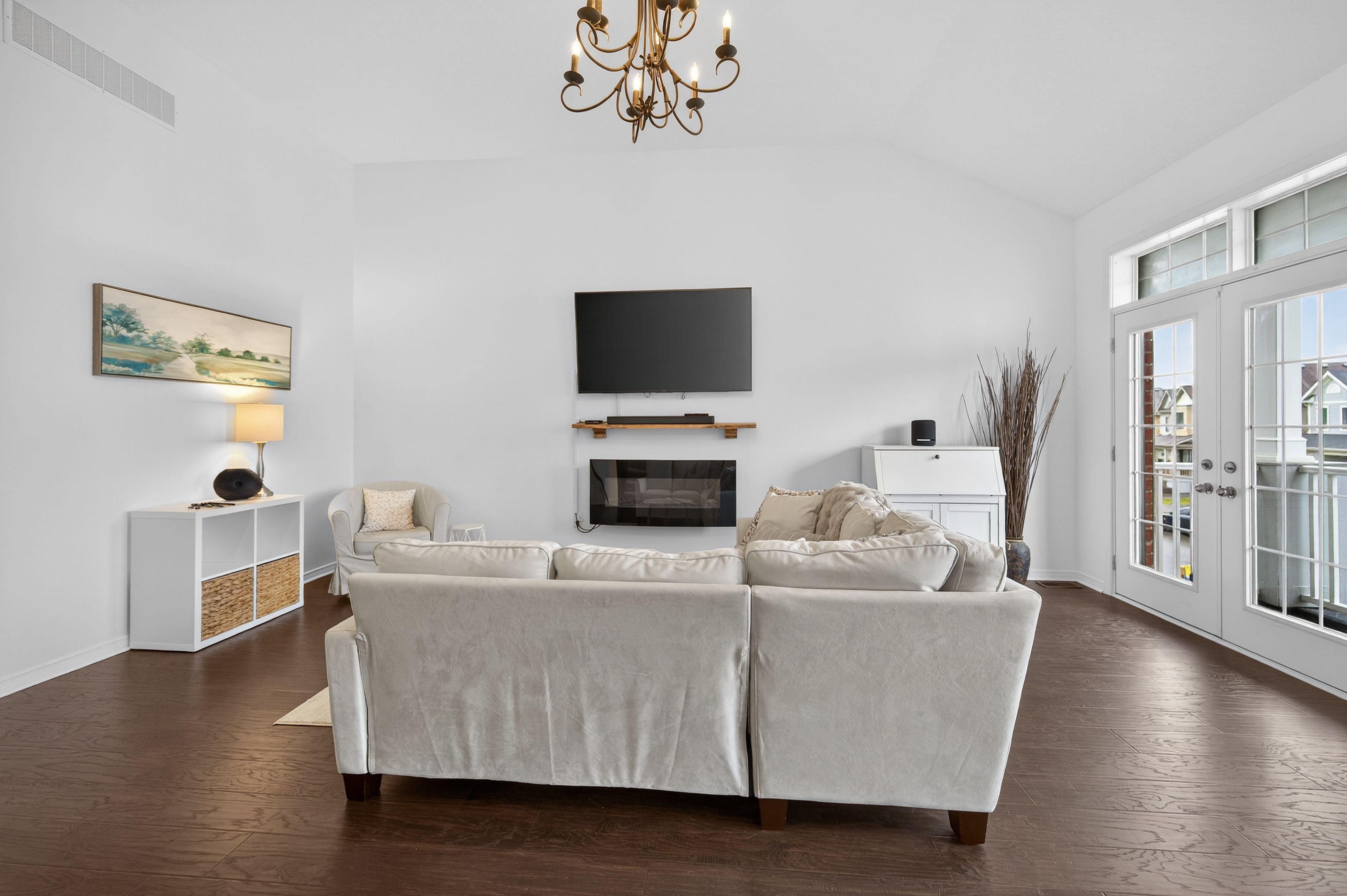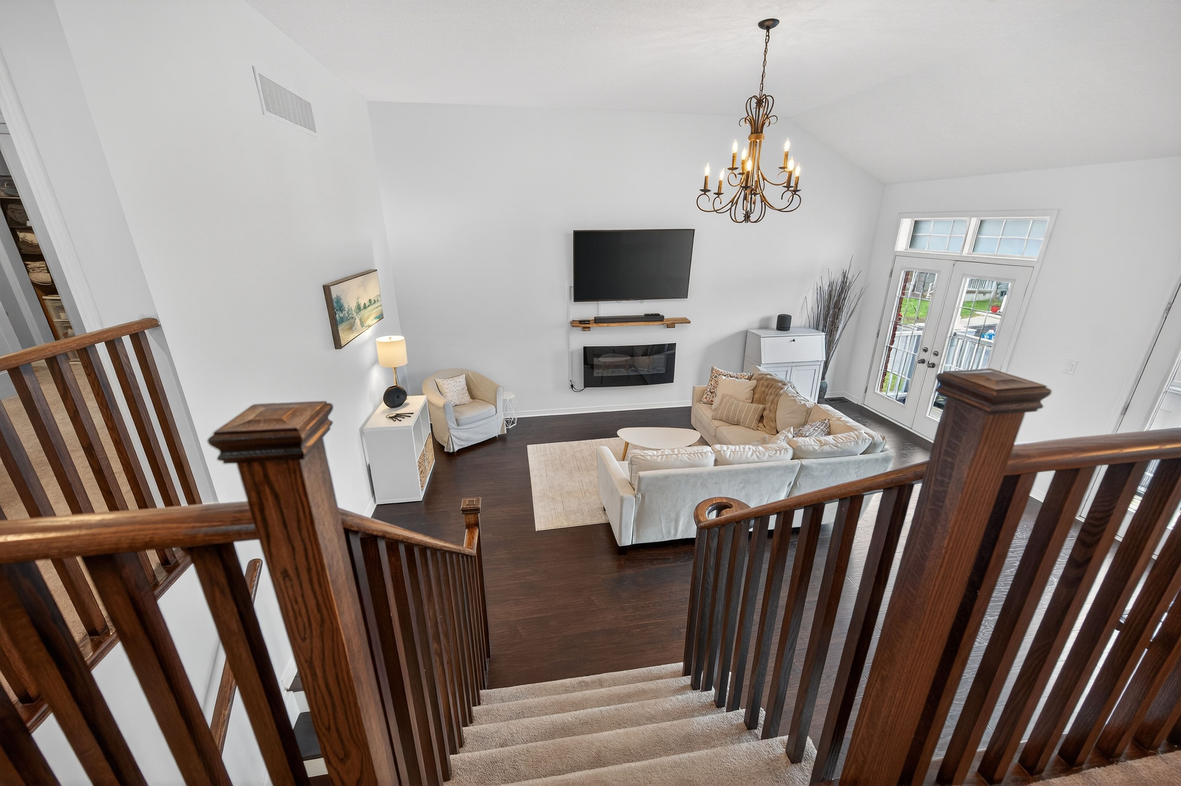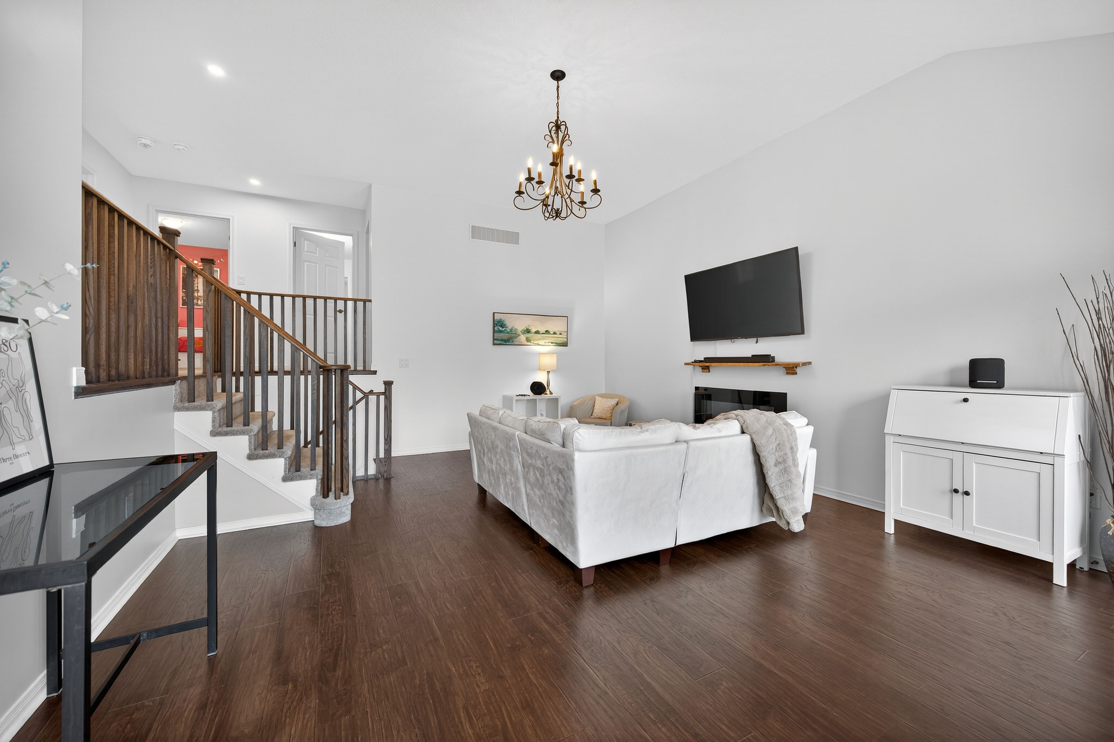 • Great room with high ceilings and electric fireplace for cozy gatherings.