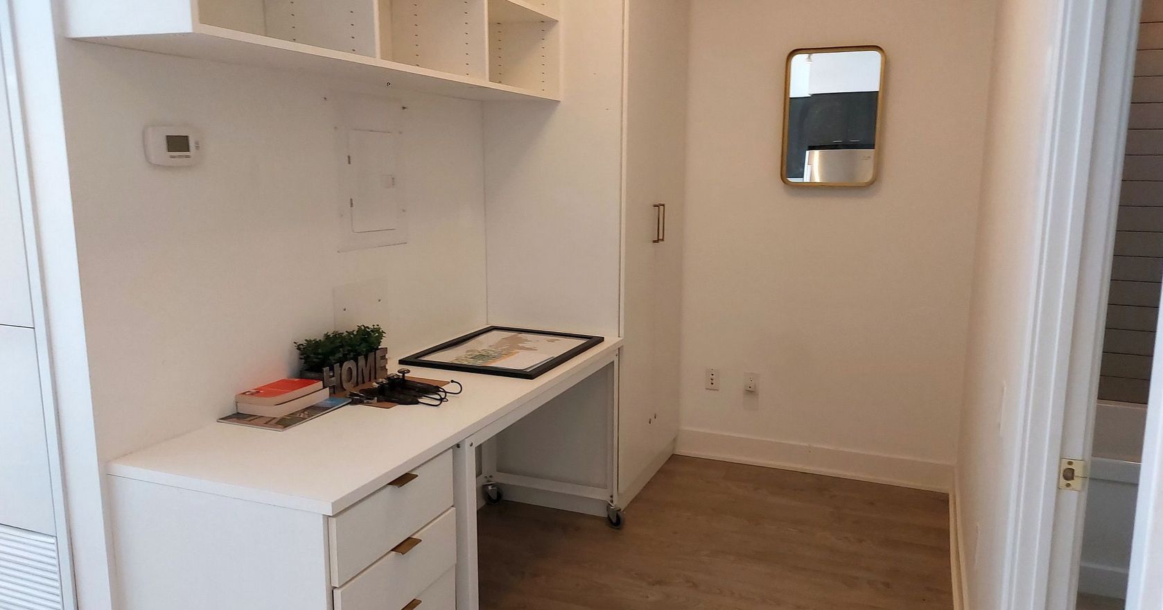 • Partially furnished with built-in home office and essential furniture.