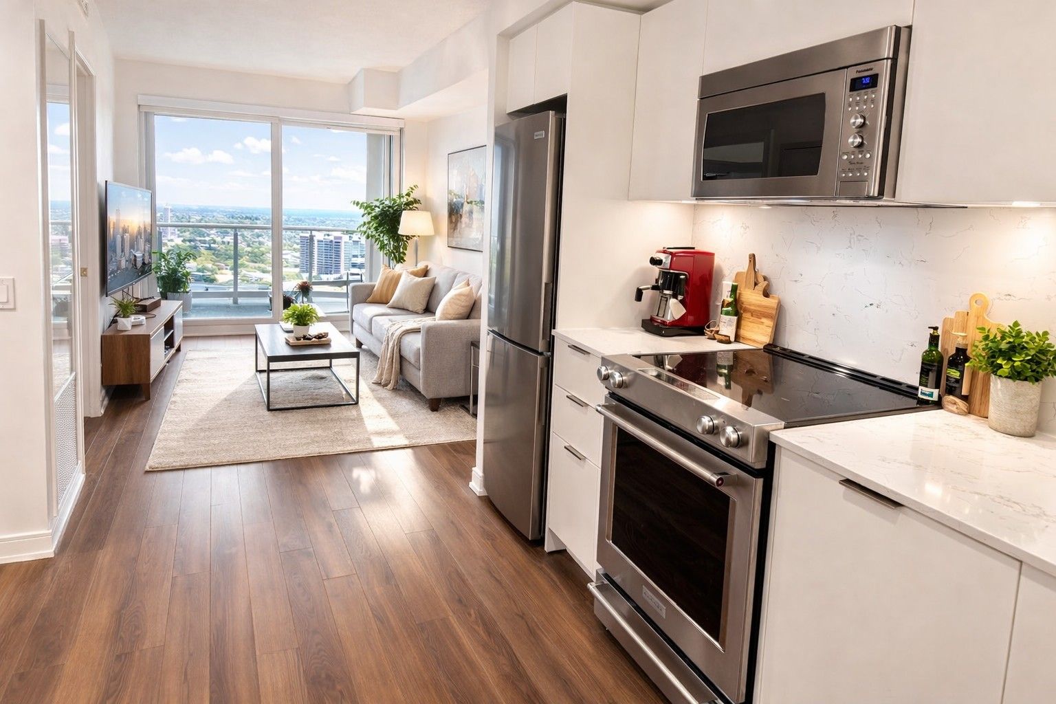 • Charming 1-bedroom condo with modern cabinetry and spacious balcony.