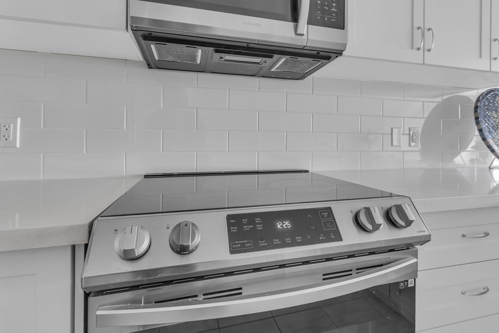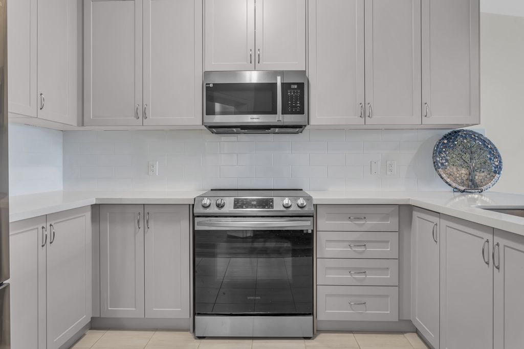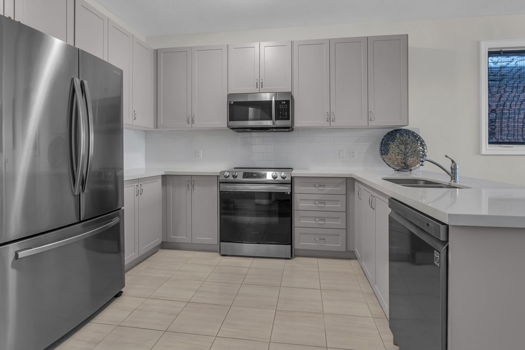 • Modern kitchen features stainless steel appliances and a convenient eat-at island.