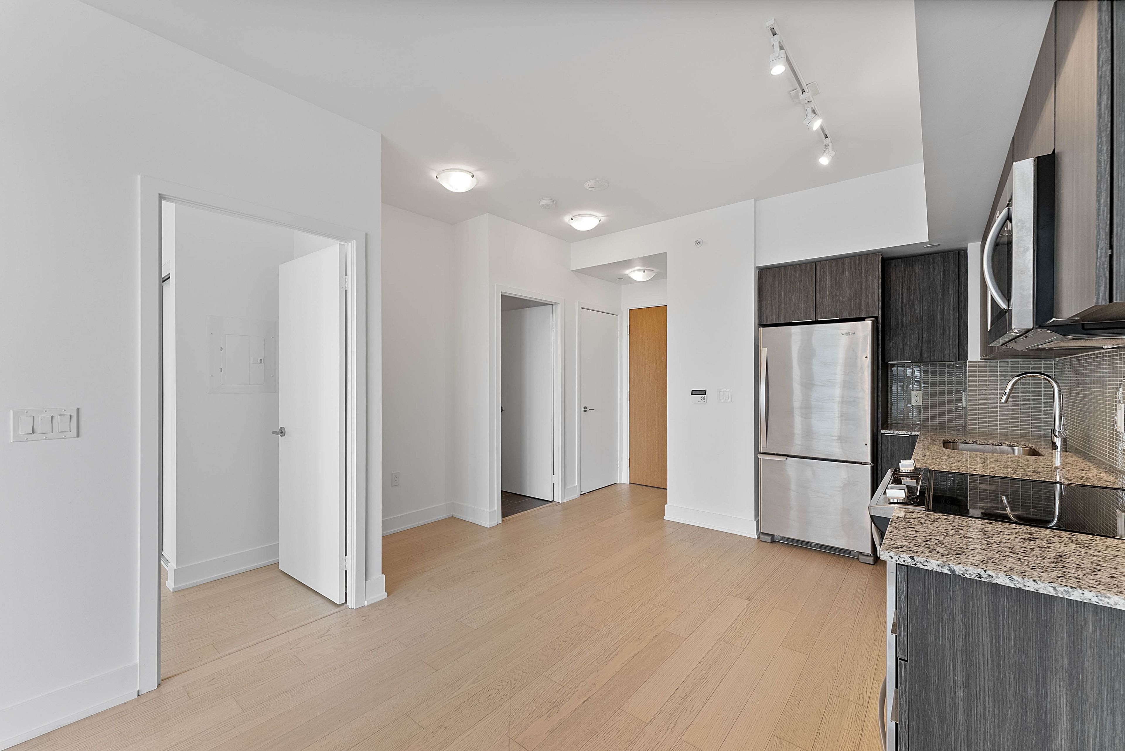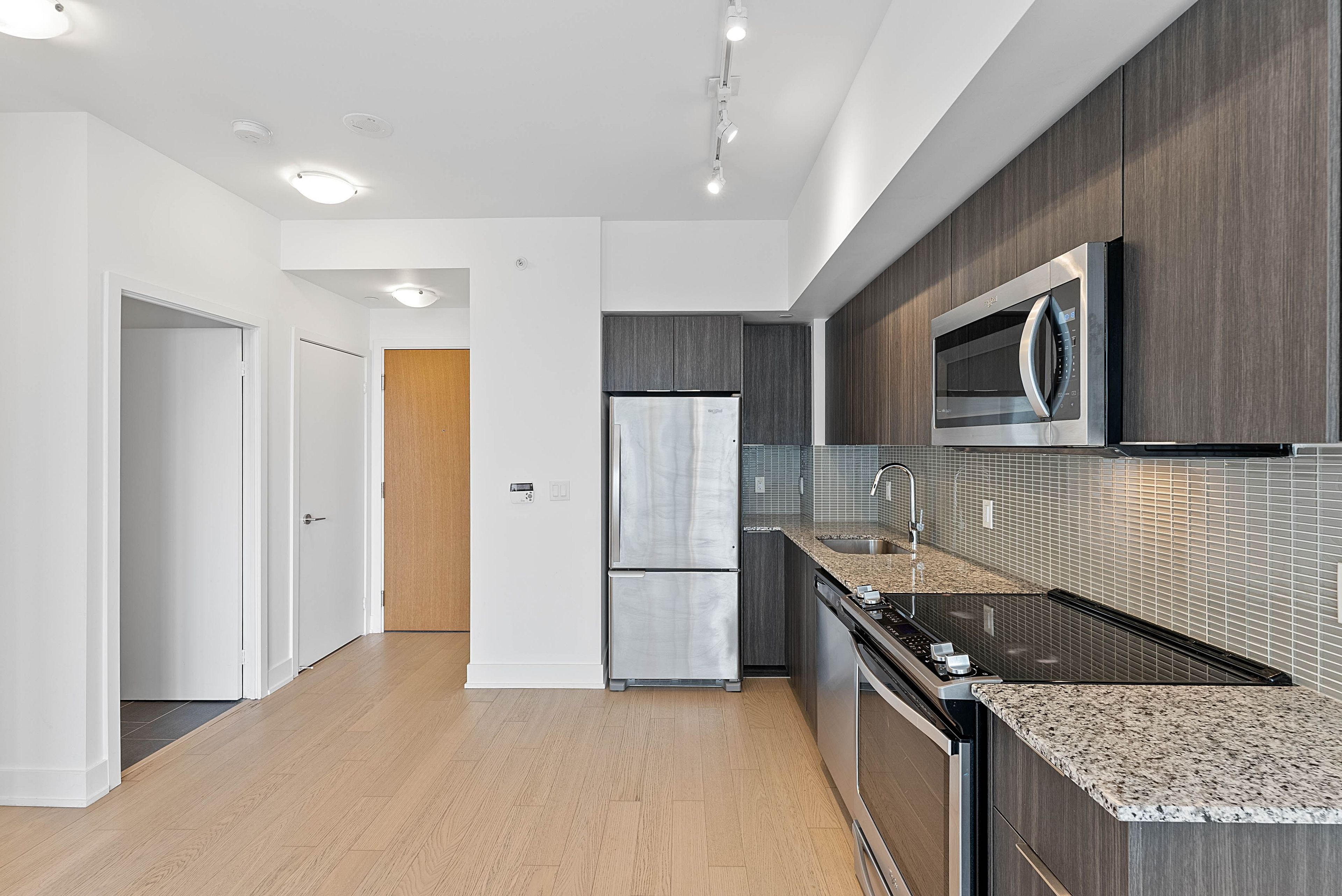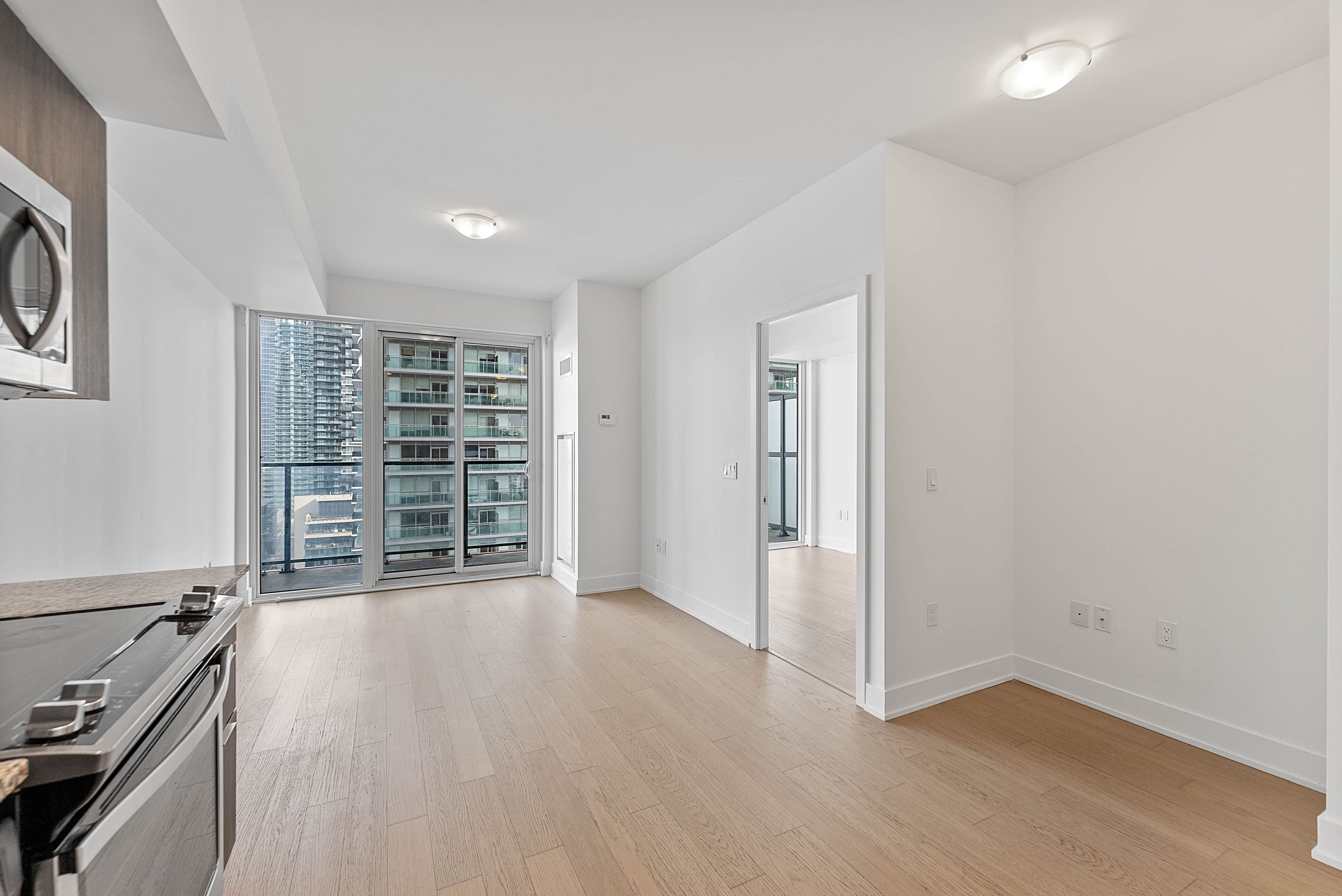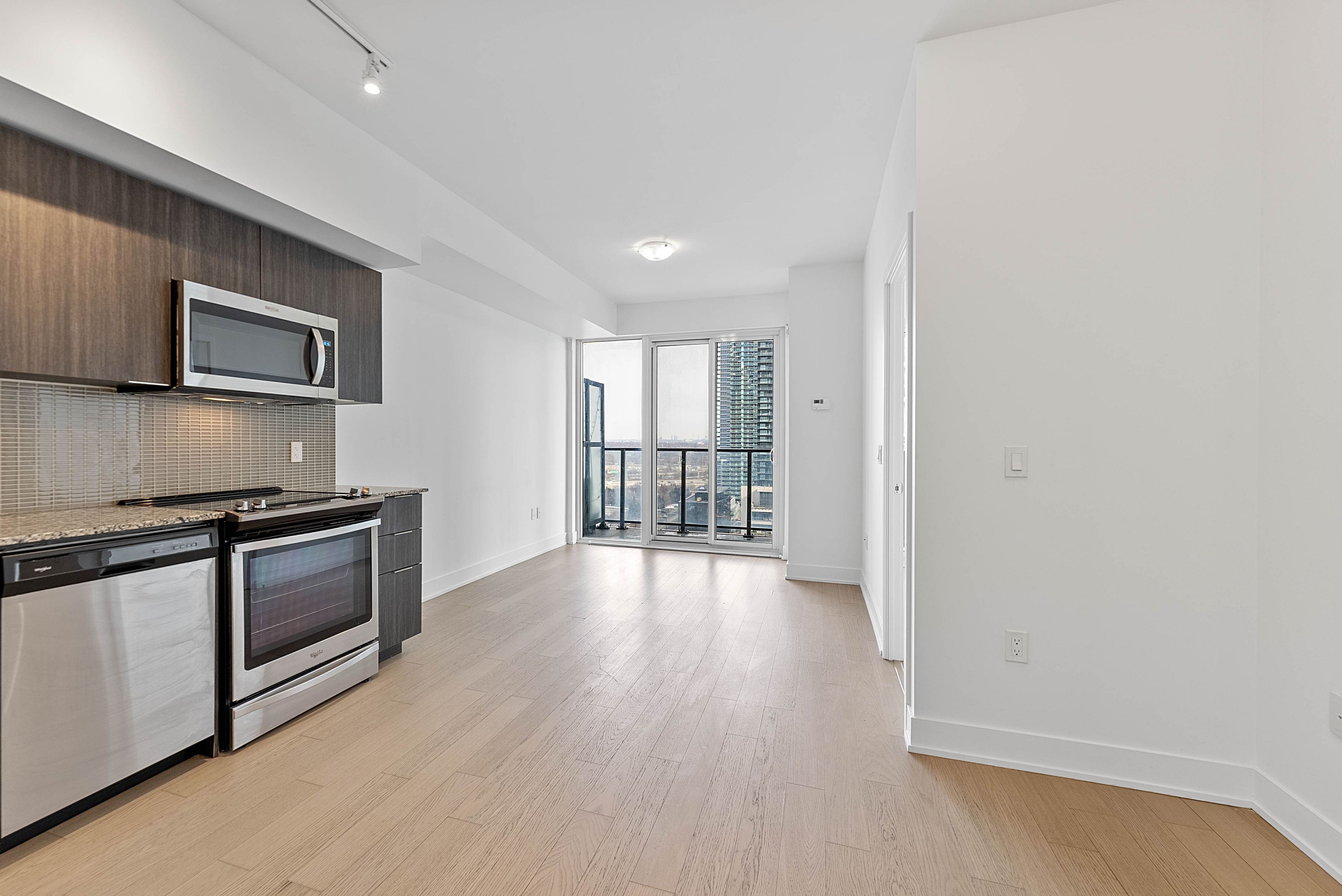 Welcome to eau du soleil sky tower in humber bay shores, in the heart of etobicoke's vibrant waterfront community. This beautifully maintained 1 bedroom + tech suite offers east-facing city and lake views, soaring 9-foot ceilings and floor-to-ceiling windows that fill the space with natural light. Freshly painted and professionally cleaned, this move-in ready unit features a modern open-concept layout with wide-plank engineered hardwood flooring throughout. This superb unit includes a chef-inspired kitchen with stone countertops, stainless steel appliances and a mini glass subway tile backsplash, a spacious living area, ideal for both everyday living and entertaining, with a walk-out to a large 4'7" x 19'10" balcony overlooking the city and lake, a generous bedroom with a double closet and a second walk-out to the balcony, a modern 4-piece bathroom and convenient ensuite laundry. One underground parking space is included! Residents enjoy exceptional resort-style amenities including a 24-hour concierge, indoor saltwater pool, fully equipped fitness centre, yoga and pilates studio, sauna, theatre room, games and party rooms, guest suites, rooftop deck and outdoor lounge with bbqs and cabanas and more! Located in the highly sought-after humber bay shores neighbourhood, steps to boutique shopping, cafes and popular restaurants including la vecchia, firkin on bay, eden trattoria, huevos gourmet and birds & beans cafe. Enjoy nearby jean augustine park, the scenic martin goodman trail along the waterfront and the popular hbsca seasonal farmers' market held on saturdays. Westlake village is directly across the street with metro, lcbo, starbucks and everyday conveniences. Ttc at your doorstep, easy access to mimico go station and the gardiner expressway for commuting downtown. Experience the best of lakeside city living in one of etobicoke's most dynamic waterfront communities!