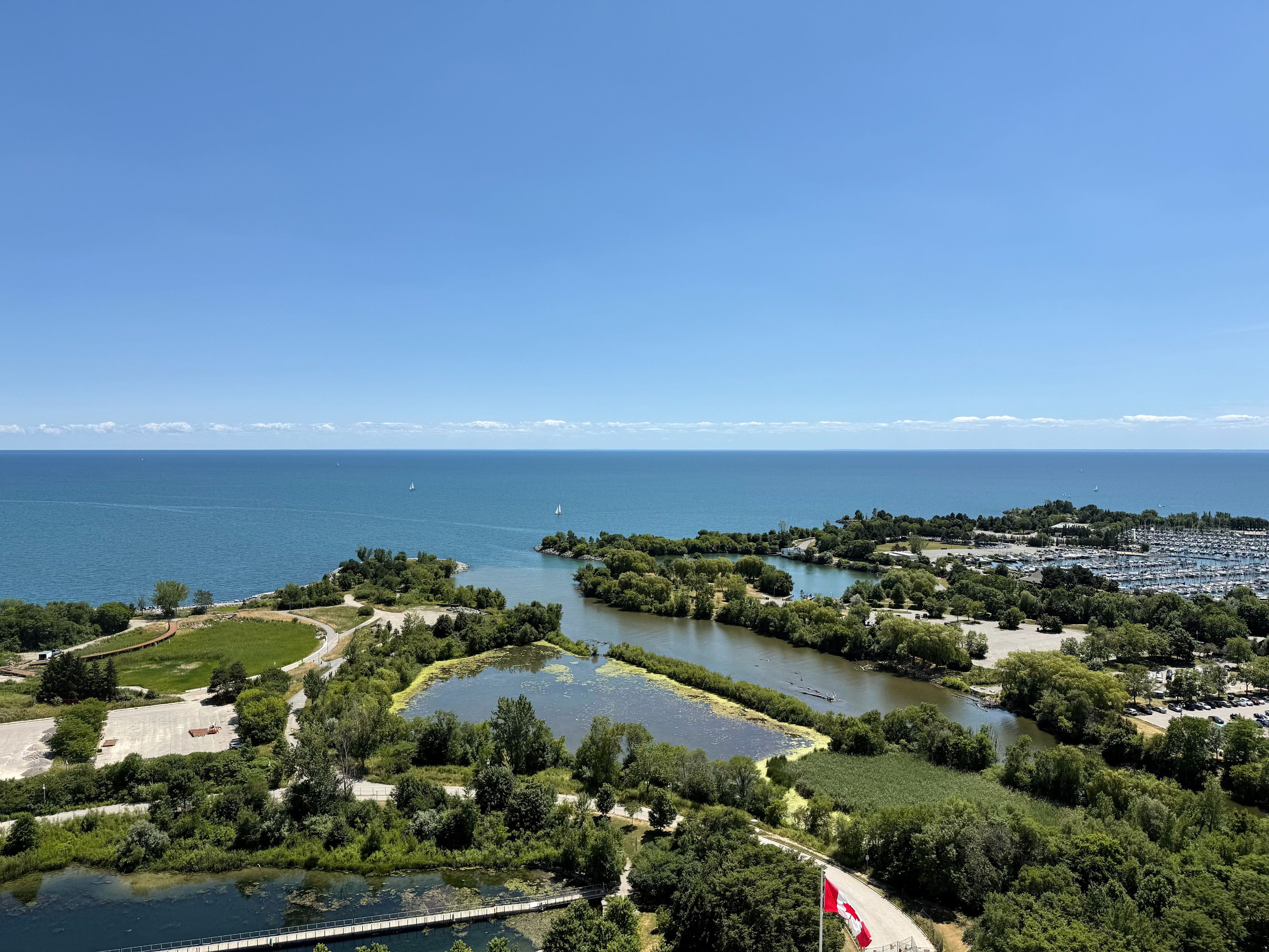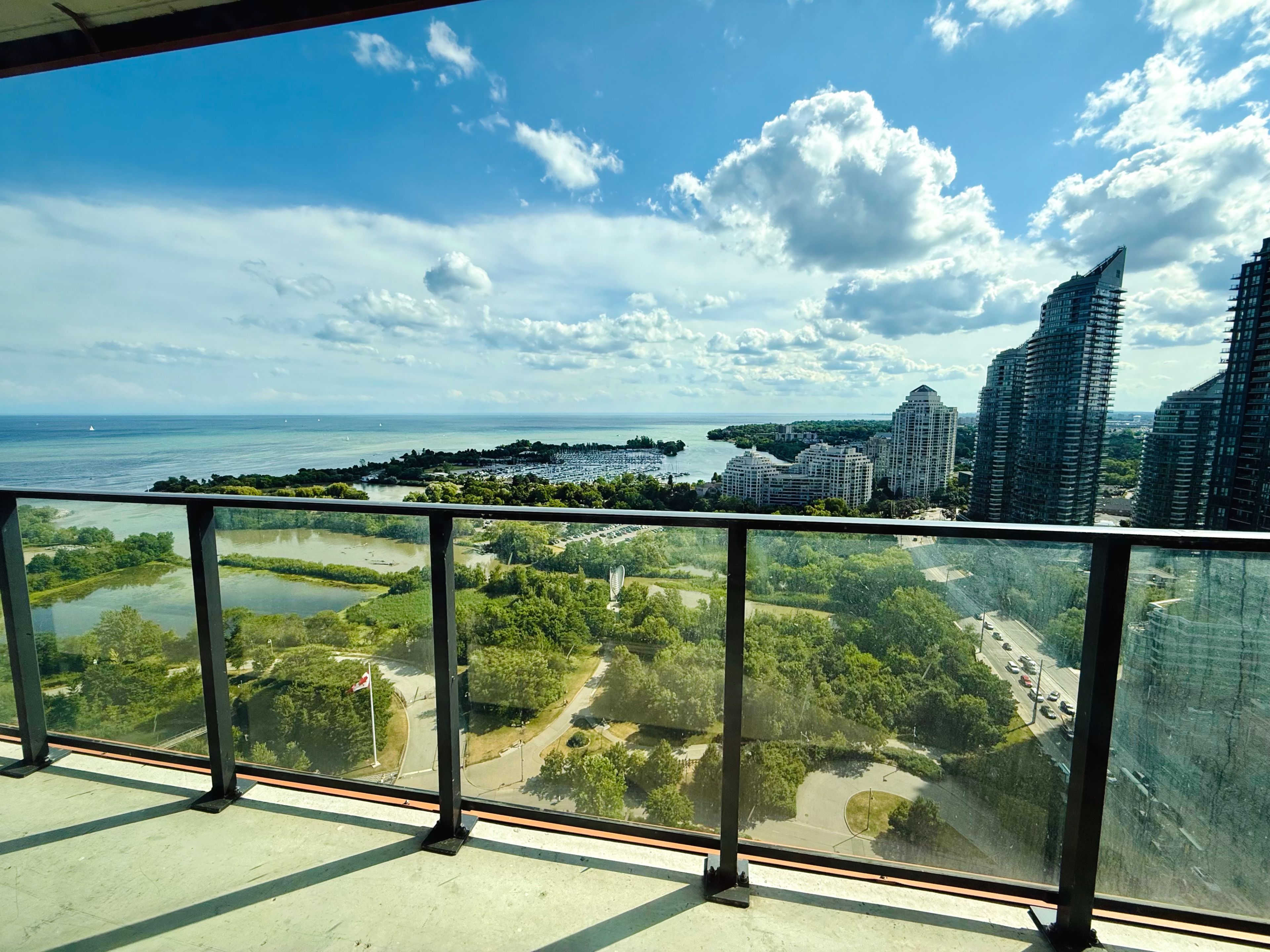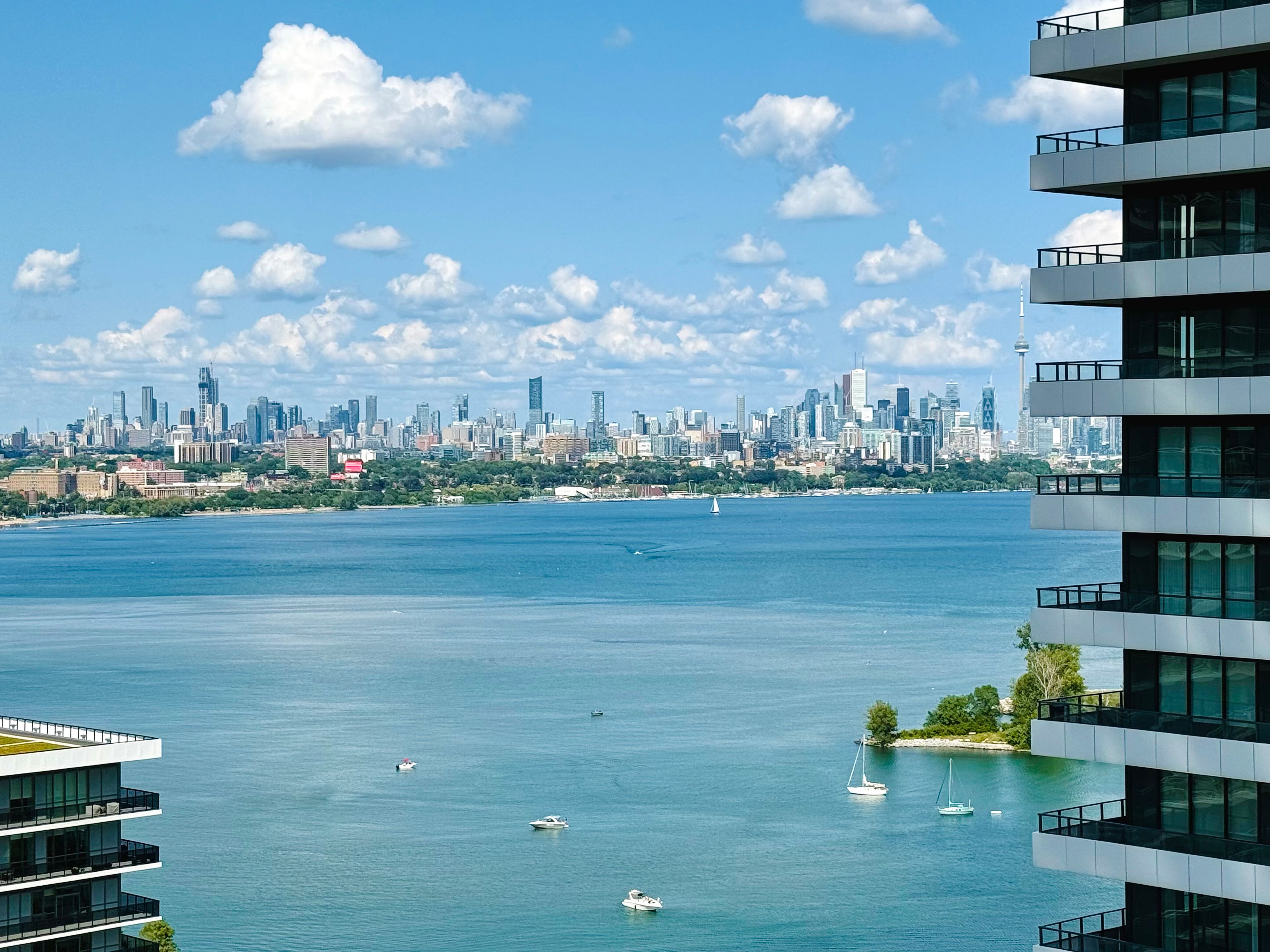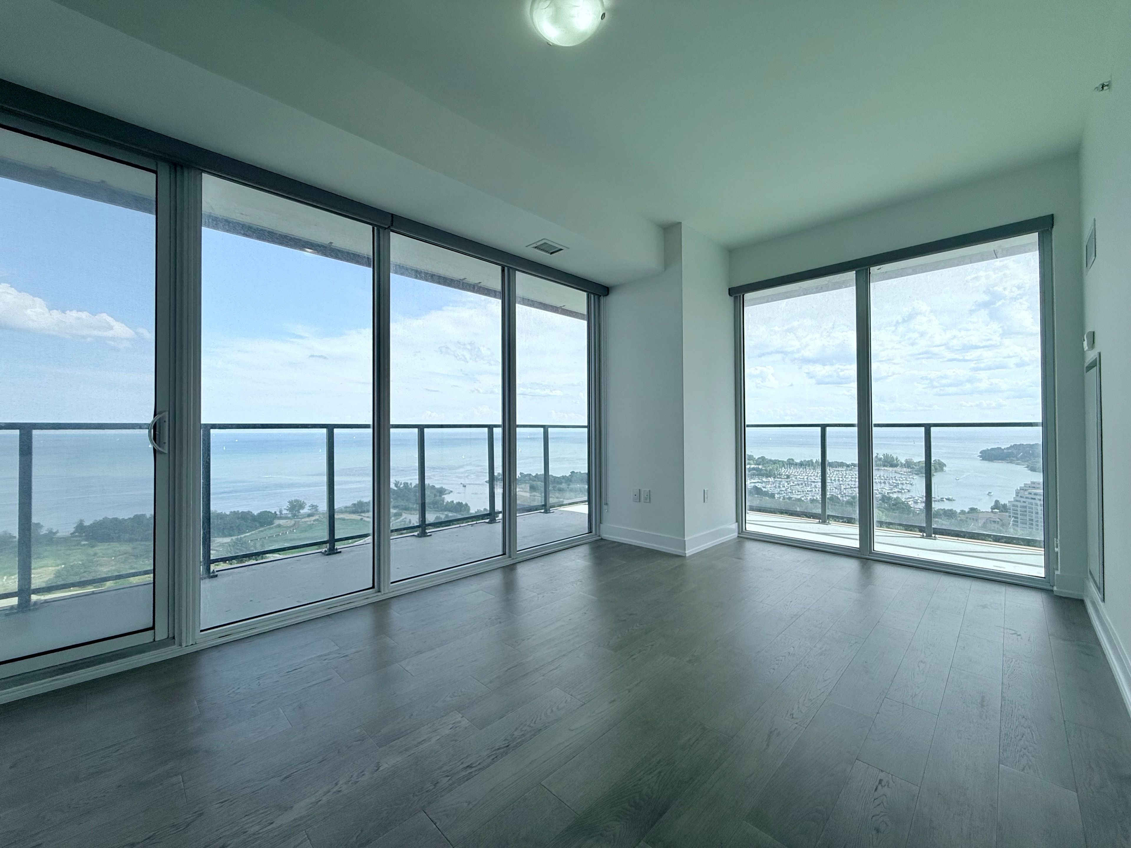 Rarely offered southwest corner gem at eau du soleil's sky tower! Enjoy breathtaking, unobstructed lake, marina & city views from every room and a massive 300+ sqft wrap-around balcony. This bright, functional 2bed & 2bath layout features split bedrooms, 9ft smooth ceilings, and brand new (2024) wide-plank hardwood flooring. Modern kitchen with quartz countertops, central island & upgraded kitchen-aid appliances. Floor-to-ceiling windows flood the space with light. Resort-style amenities: indoor saltwater pool, hot tubs, sauna, outdoor bbq terrace, rooftop patio, a fully equipped gym, crossfit area, free fitness classes & movie nights, yoga/pilates studio, lounge, games & party rooms, a car wash, pet wash station, 24/7 security, guest suites & more! One parking & one locker included. Steps to waterfront trails, shops, ttc, and future park lawn go. Don't miss this rare lakeside offering!